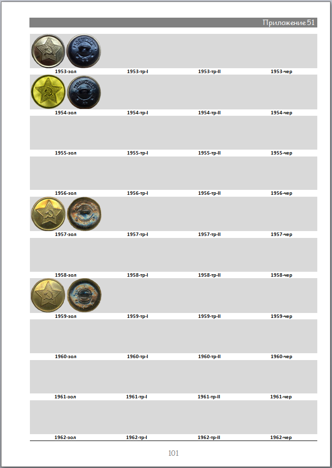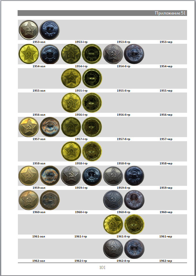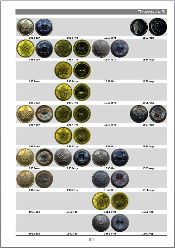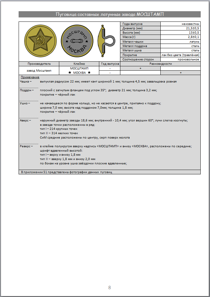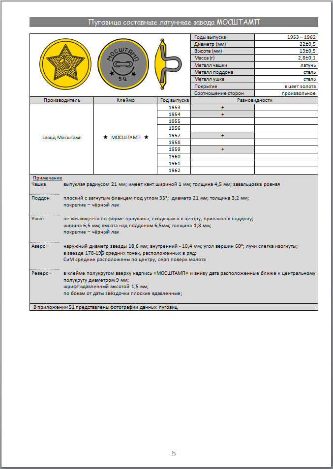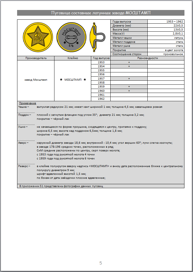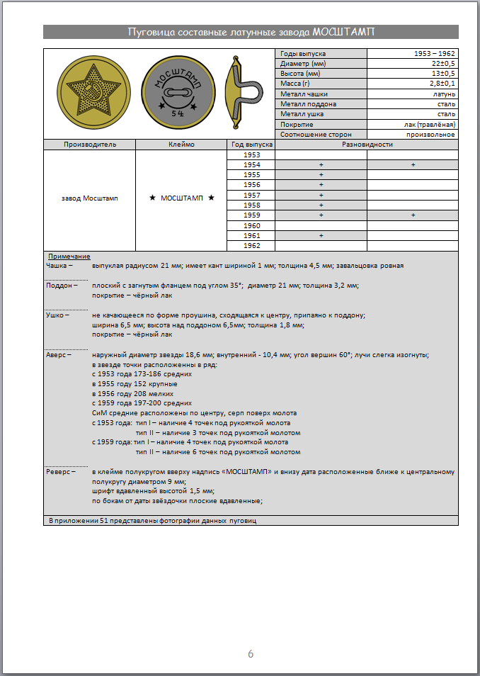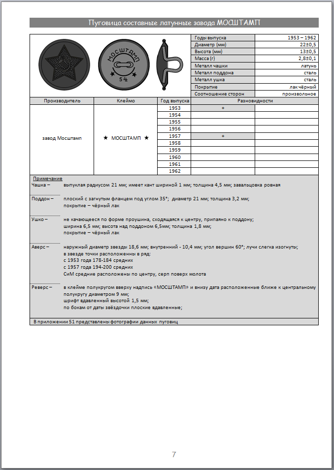 Александр! Спасибо за разъяснения по поводу намагничивания пуговиц и определения металла. Действительно латунные обычно сильно закислены. А вот с намагничиванием нужно поискать слабенький магнит. Раньше у меня были шахматы миниатюрные с магнитами. Они бы пригодились. Выкладываю первую таблицу с позолоченными пуговицами (в цвет золота). У меня всего такая одна, на ней явно видны следы позолоты. Других годов ни разу не попадались. Обратите внимание на расширенную таблицу и подробное описание составных частей пуговицы. Как то месяц отдыхал вне дома и взял с собой пуговицы со звездой диаметром 22 мм и без клейма. Каждый день делал зарисовки этих пуговиц с подробным описание. Пол тетради исписал. В будущем такое подробное описание нам пригодится. Если есть латунные позолоченные, то присылайте фото. Завтра выложу травлёные, а потом и чёрные.
