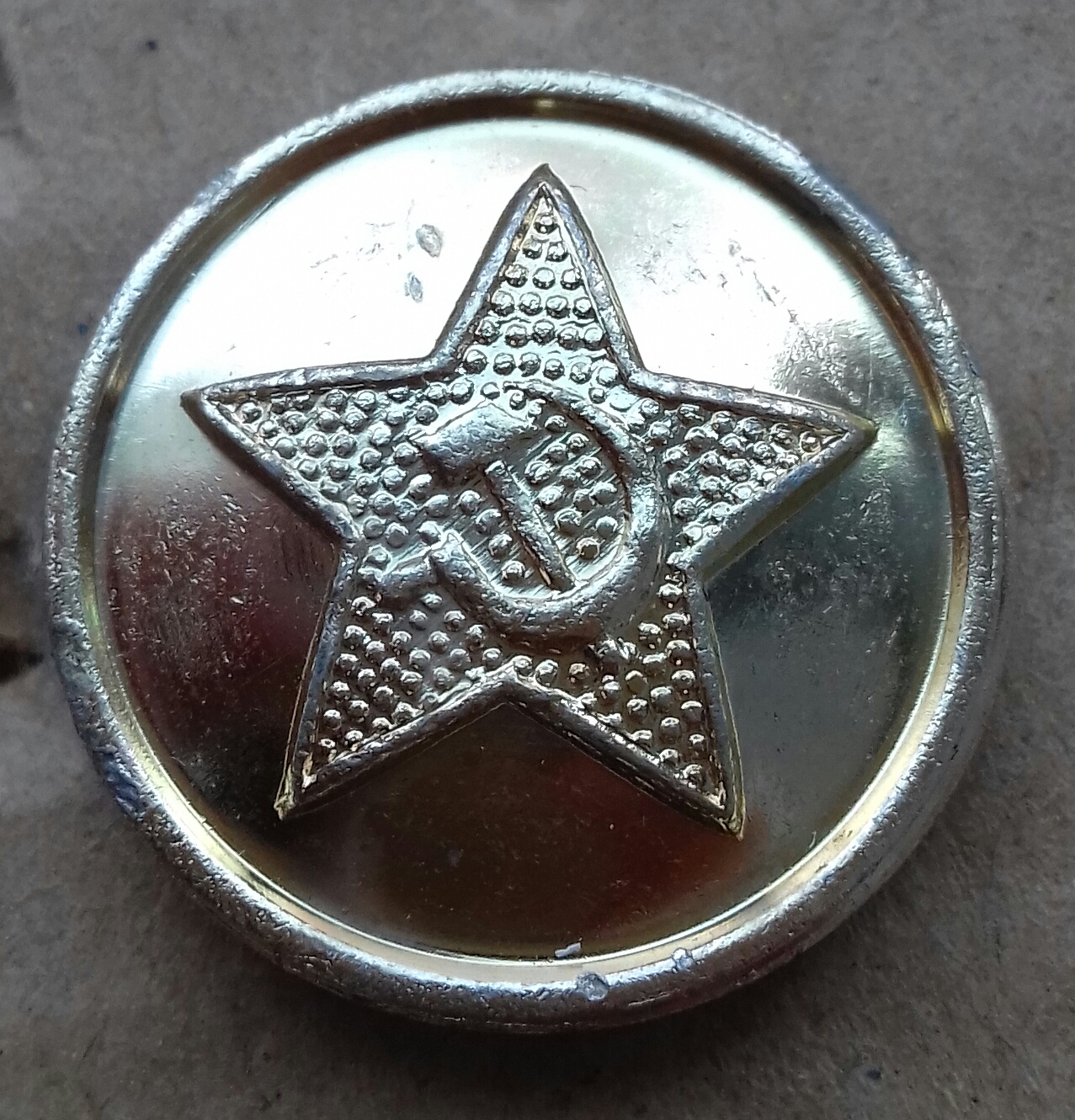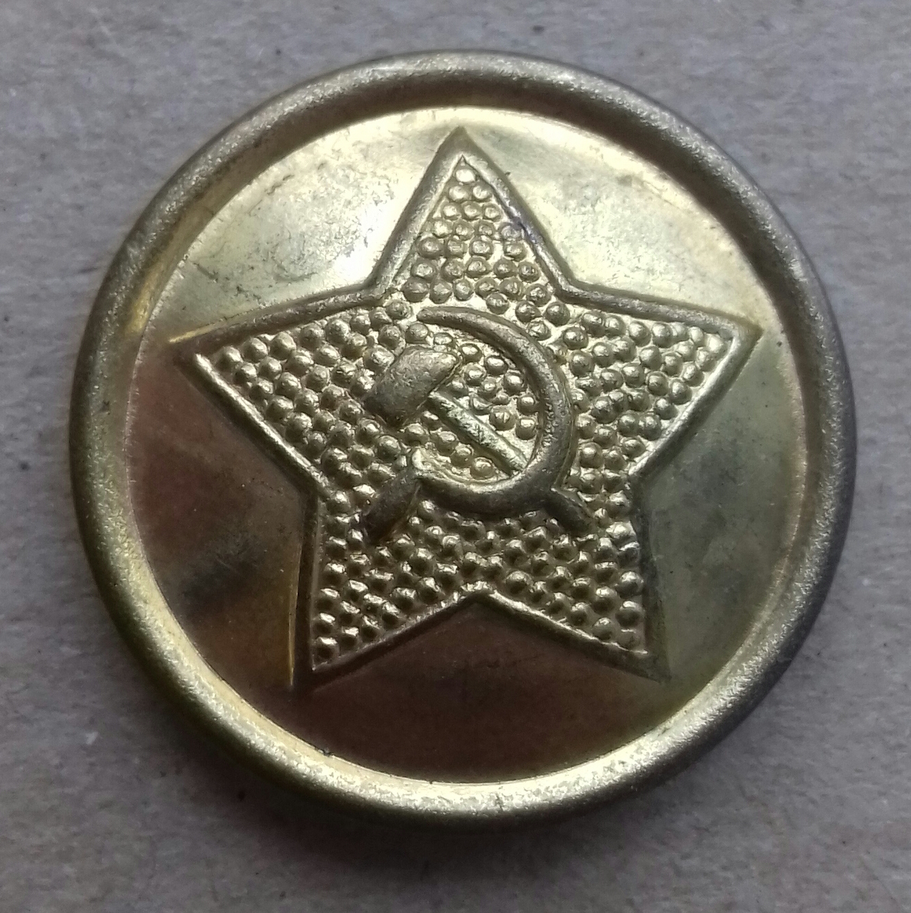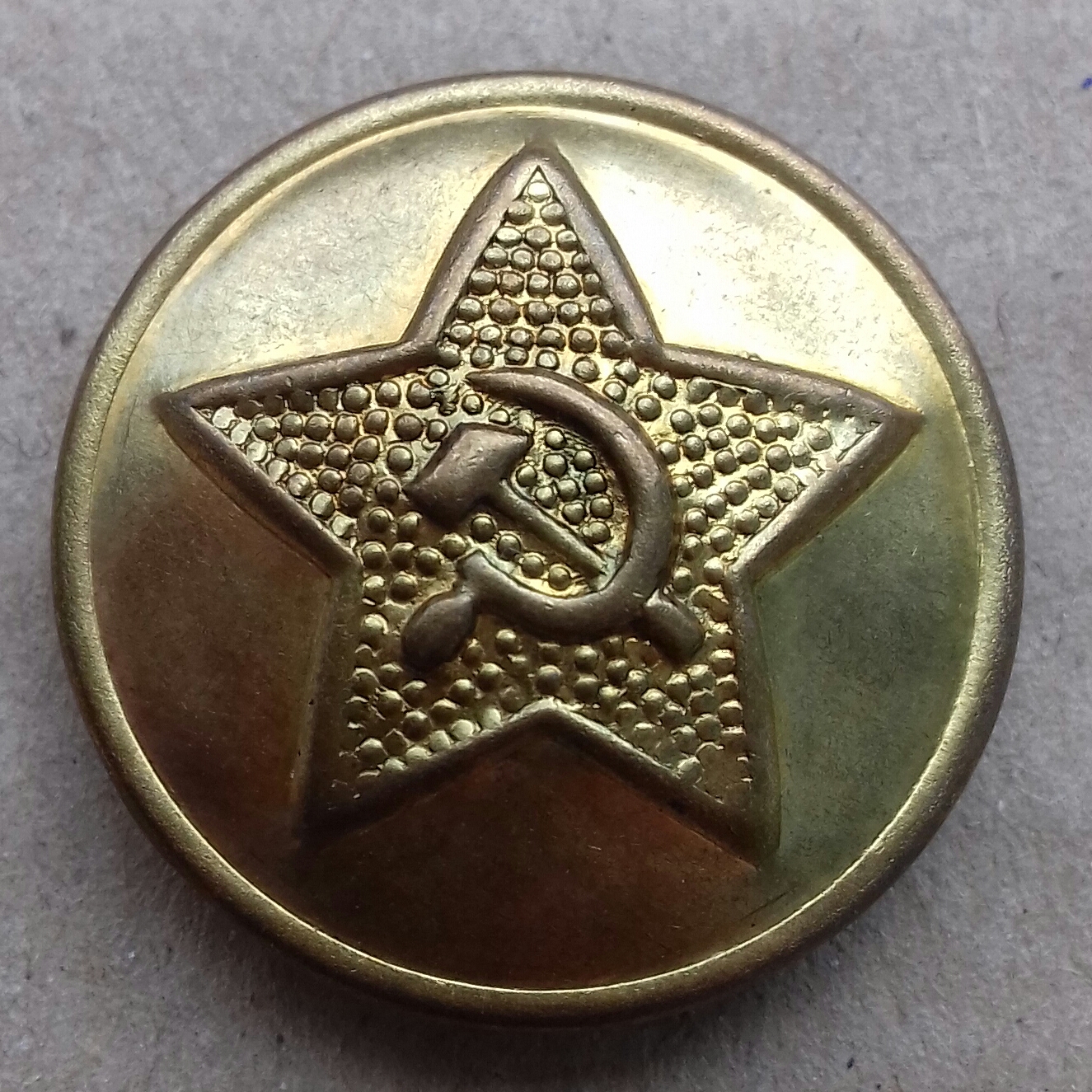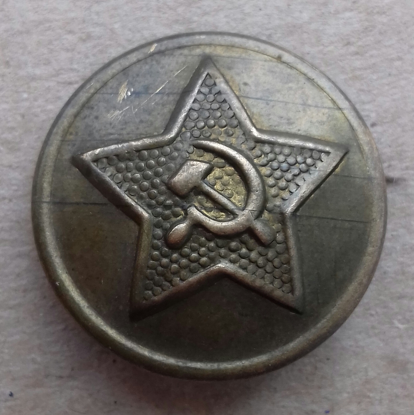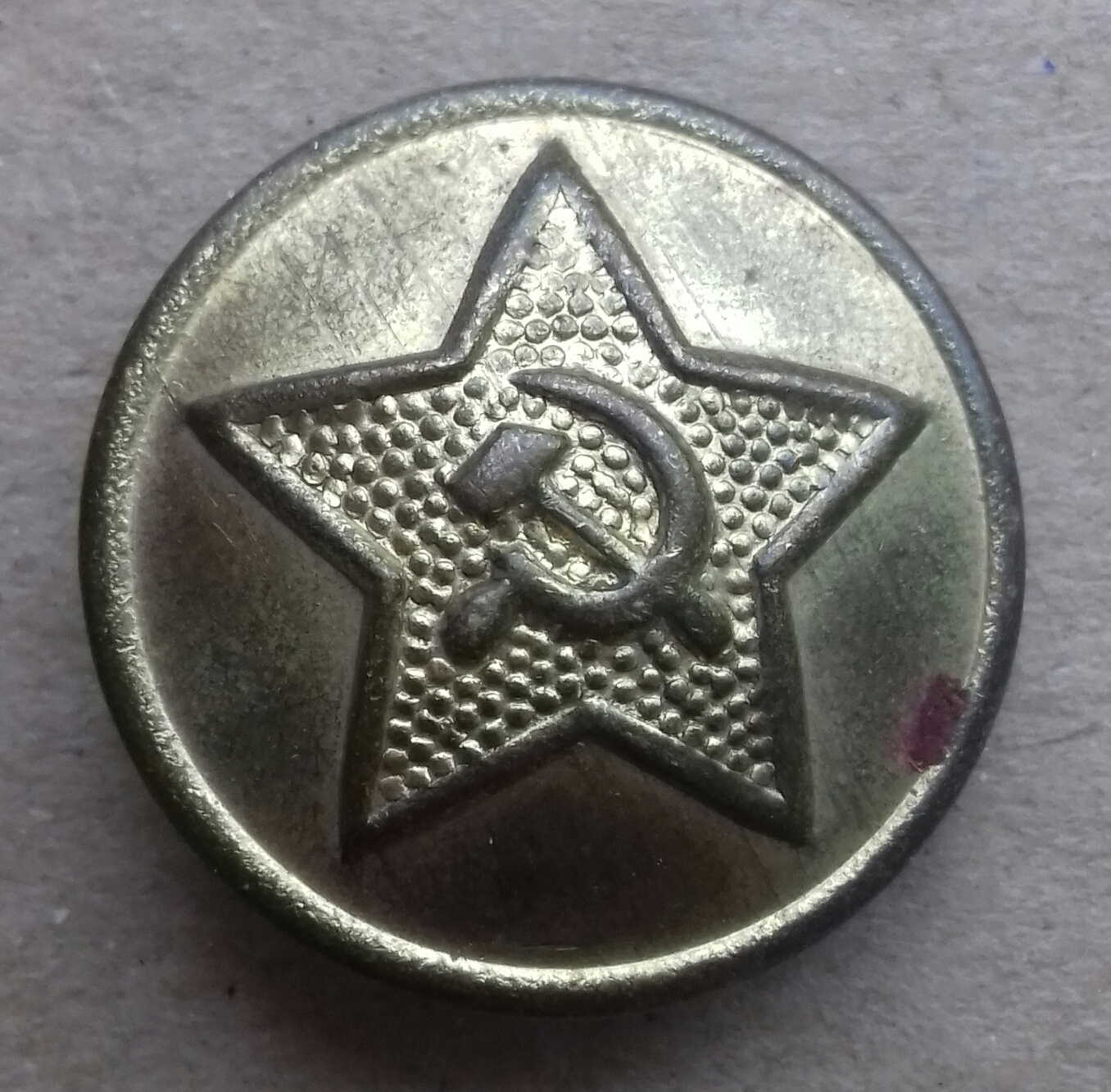 Шамиль. Скидываю фото пуговицы на мой взгляд позолоченной (в цвет золота). Диаметр 22 мм, со звездой. Мосштамп 1953 год.