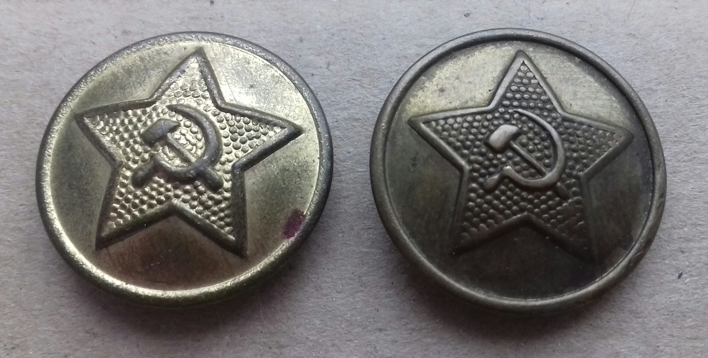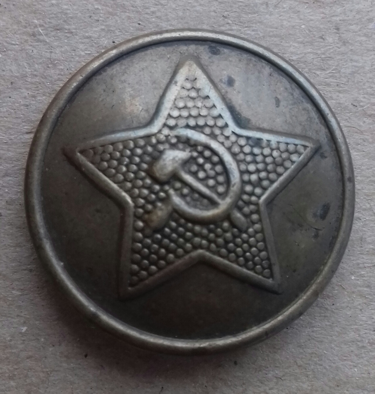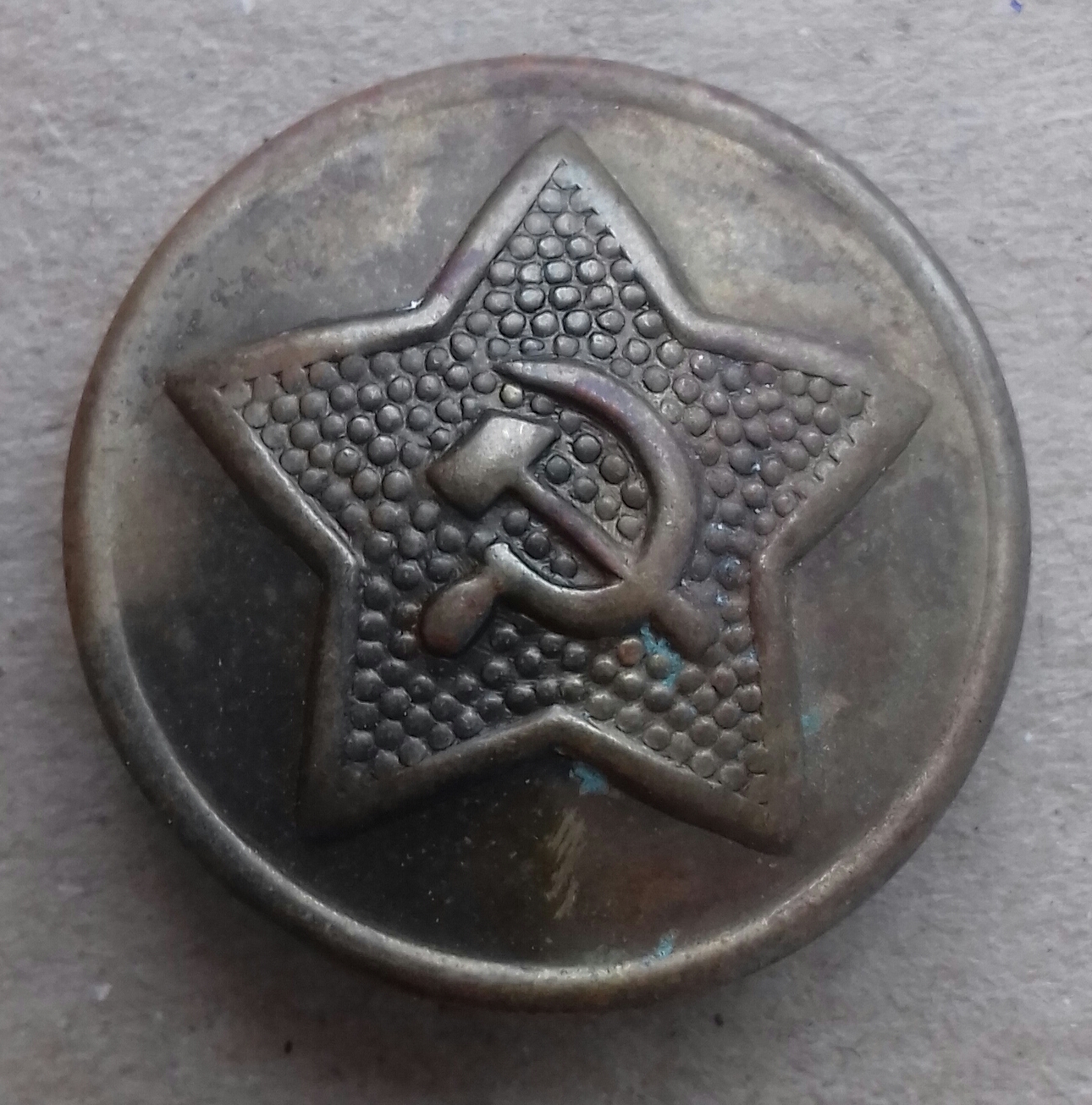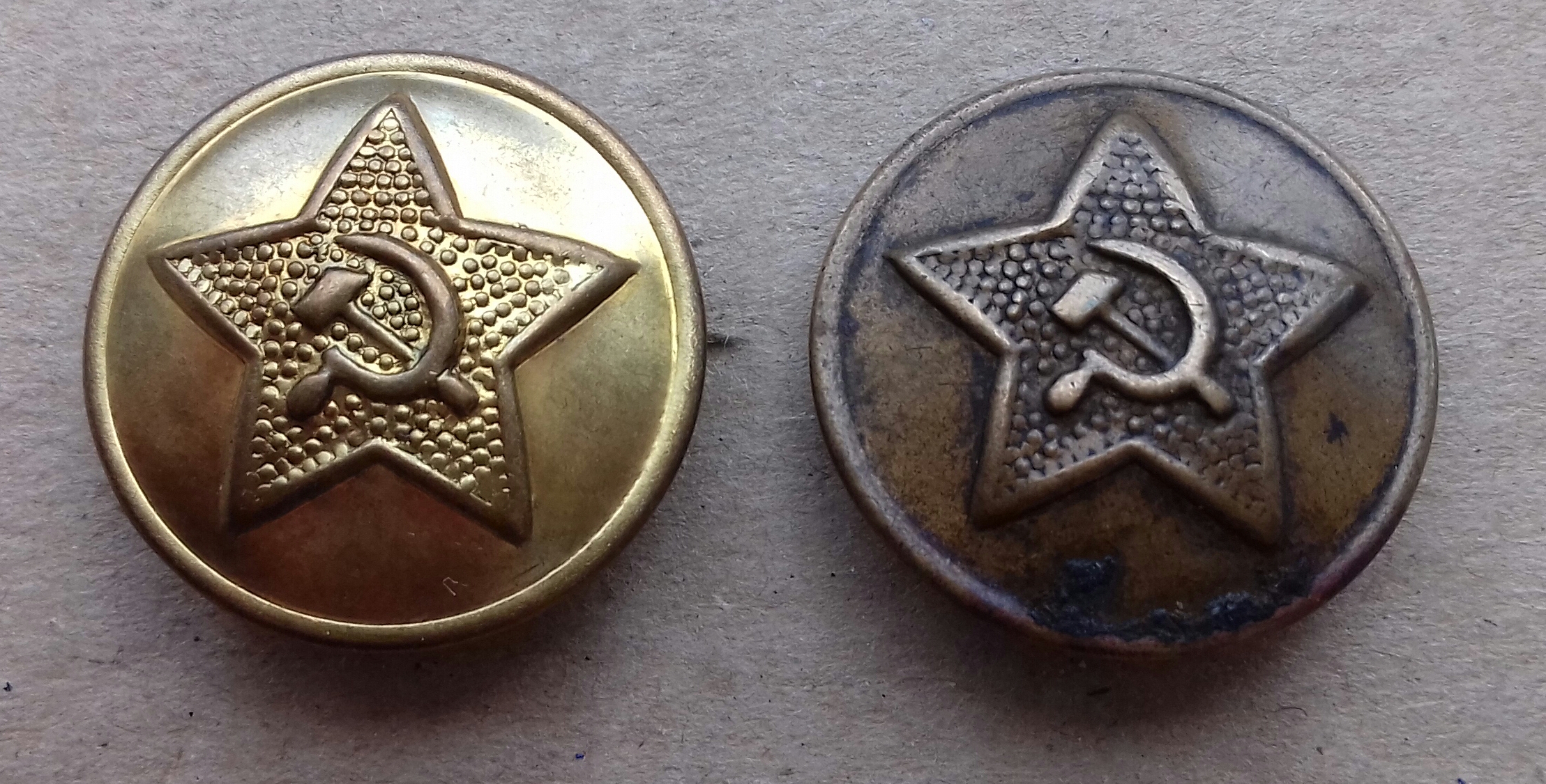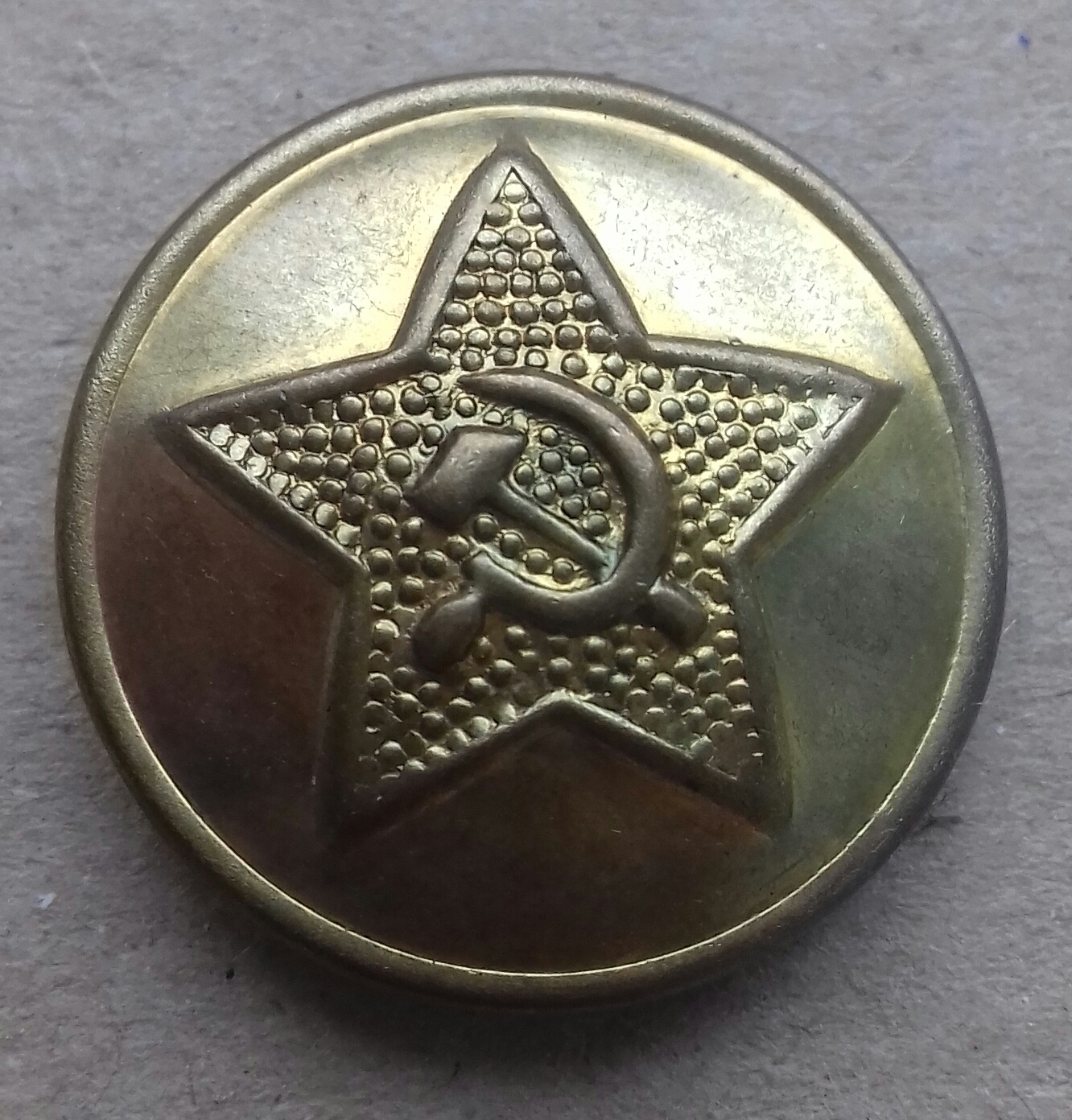Шамиль. Скидываю фото пуговицы на мой взгляд позолоченной (в цвет золота). Диаметр 22 мм, со звездой. Мосштамп 1953 год.