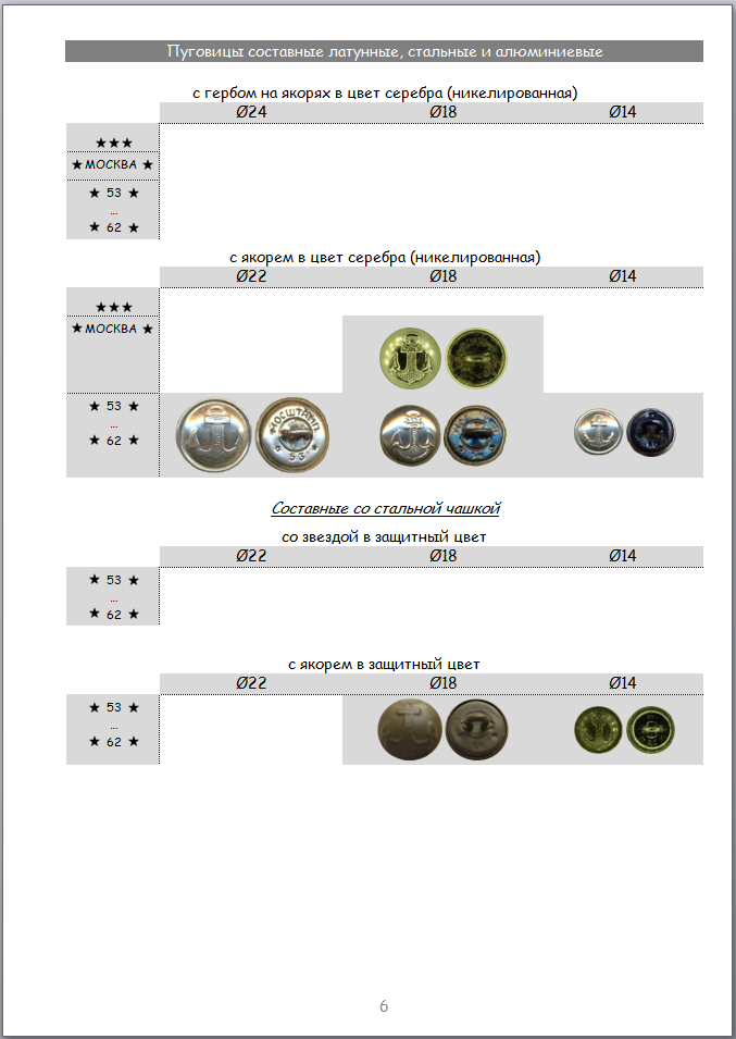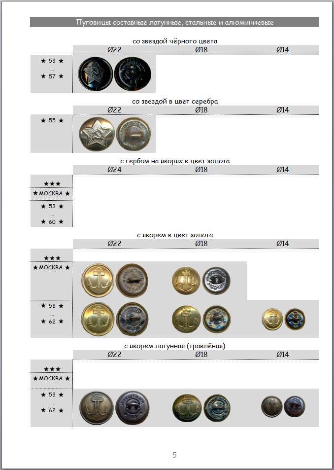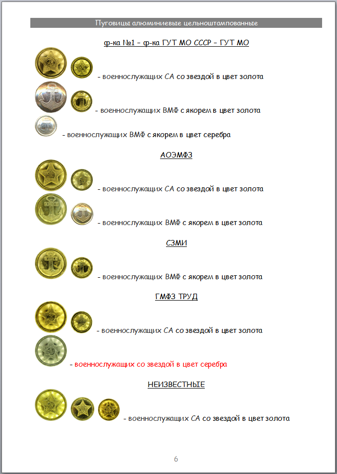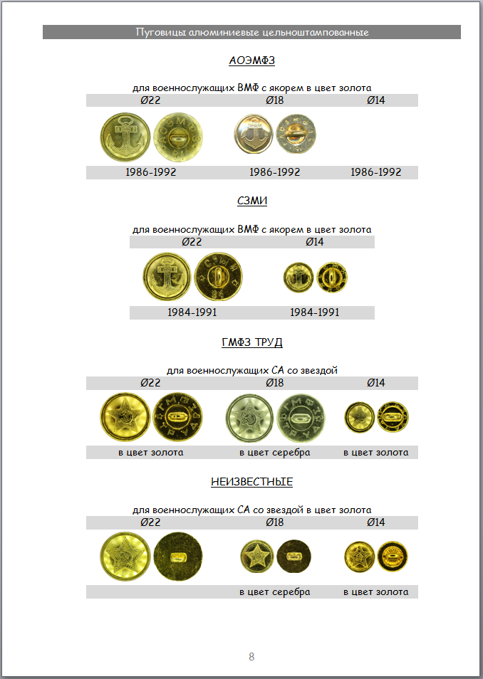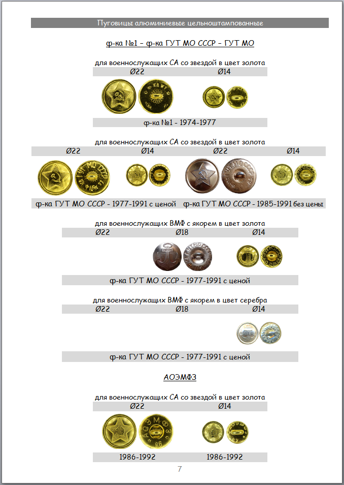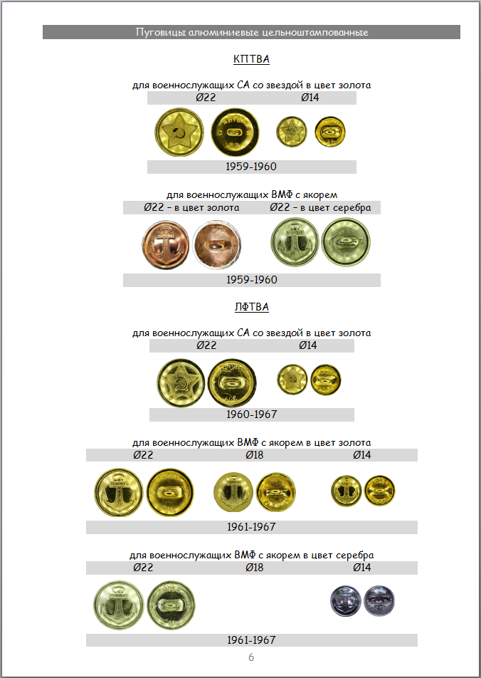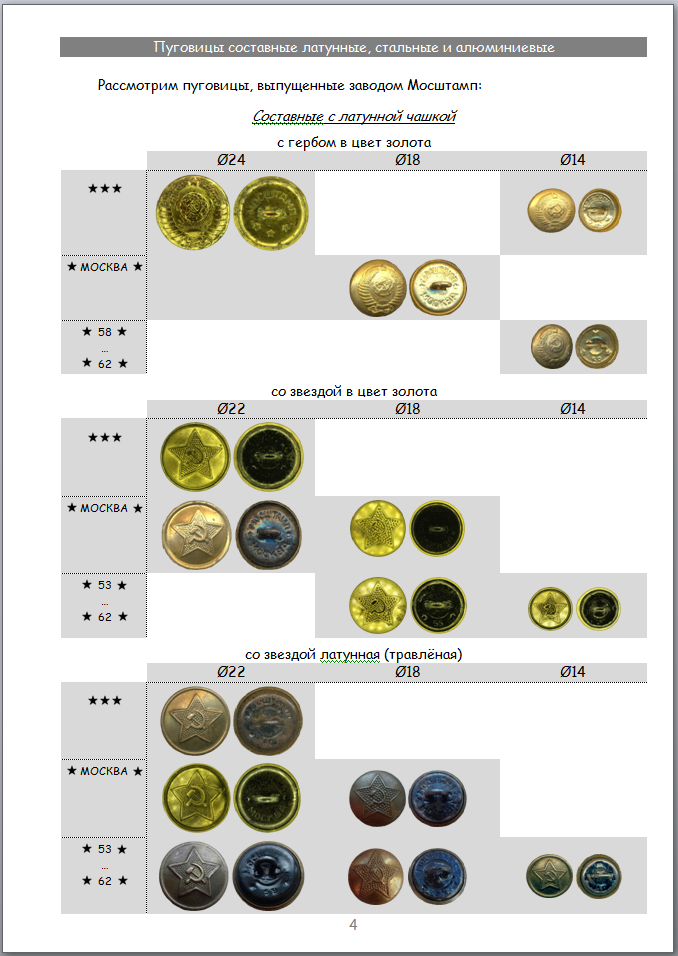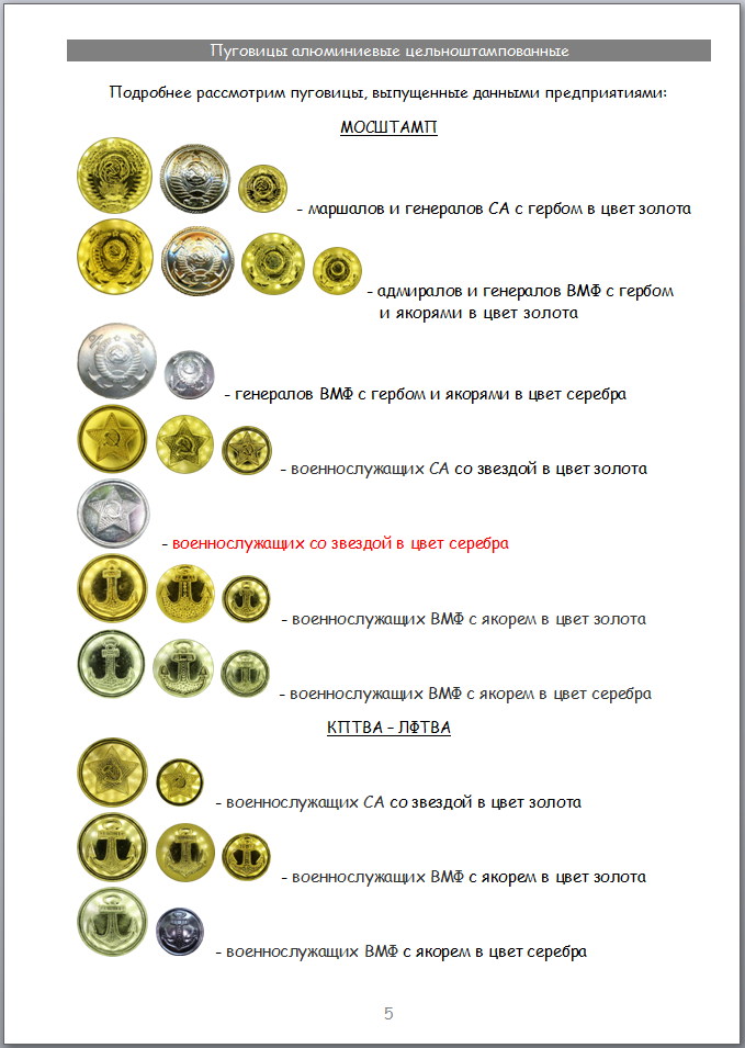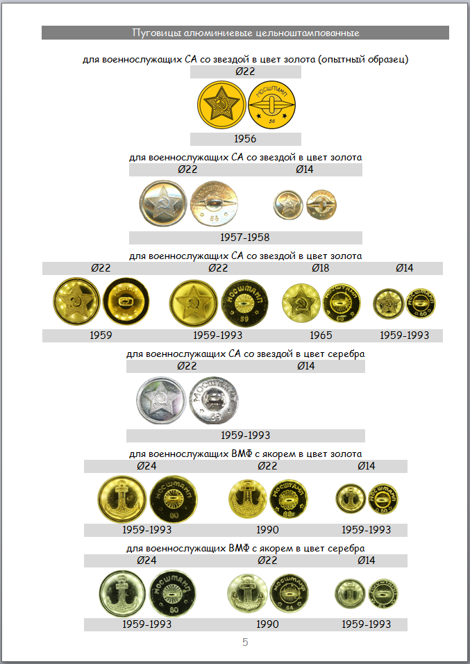 Отлично!!! А я голову ломаю, как лучше дать названия пуговицам. Так и запишу. Ещё один спорный момент есть. Мной на всех пуговицах со звёздами и якорями указаны офицерские пуговицы. В самом начале создания раздела по цельноштампованным пуговицам, в таблице я указал, что пуговицы офицерские. Мне Леонид Николаевич сделал замечание, что ни в одном документе не прописано об этой принадлежности пуговиц. Я у брал из таблицы эту запись. Сегодня просматривая различные документы, обнаружил, что на погоны генералов и офицеров помещаются позолоченные (посеребрённые) пуговицы, а на погоны сержантов и солдат латунные. А так как параллельно выпускались и цельноштампованные (позолоченные, посеребрённые), и латунные (составные) травлёные. Затем латунные (составные) сменили алюминиевые и стальные (составные), напрашивается вывод - раздел цельноштампованных пуговиц целиком посвящён генералам (адмиралам) и офицерам Советской армии и ВМФ. Может, конечно, я и не прав.
