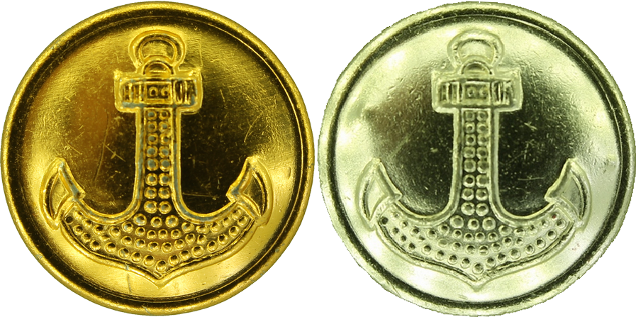 Пока жду, решил небольшое (по имеющимся в наличии) сравнение составных алюминиевых пуговиц с якорем диаметром 22 мм разных цветовых покрытий. Мне казалось, что используют одни и те же штампы при изготовление пуговиц с якорем, а затем уже покрывают в разные цвета.1968 год. Пуговицы практически ничем не отличаются. Значит штамп один.