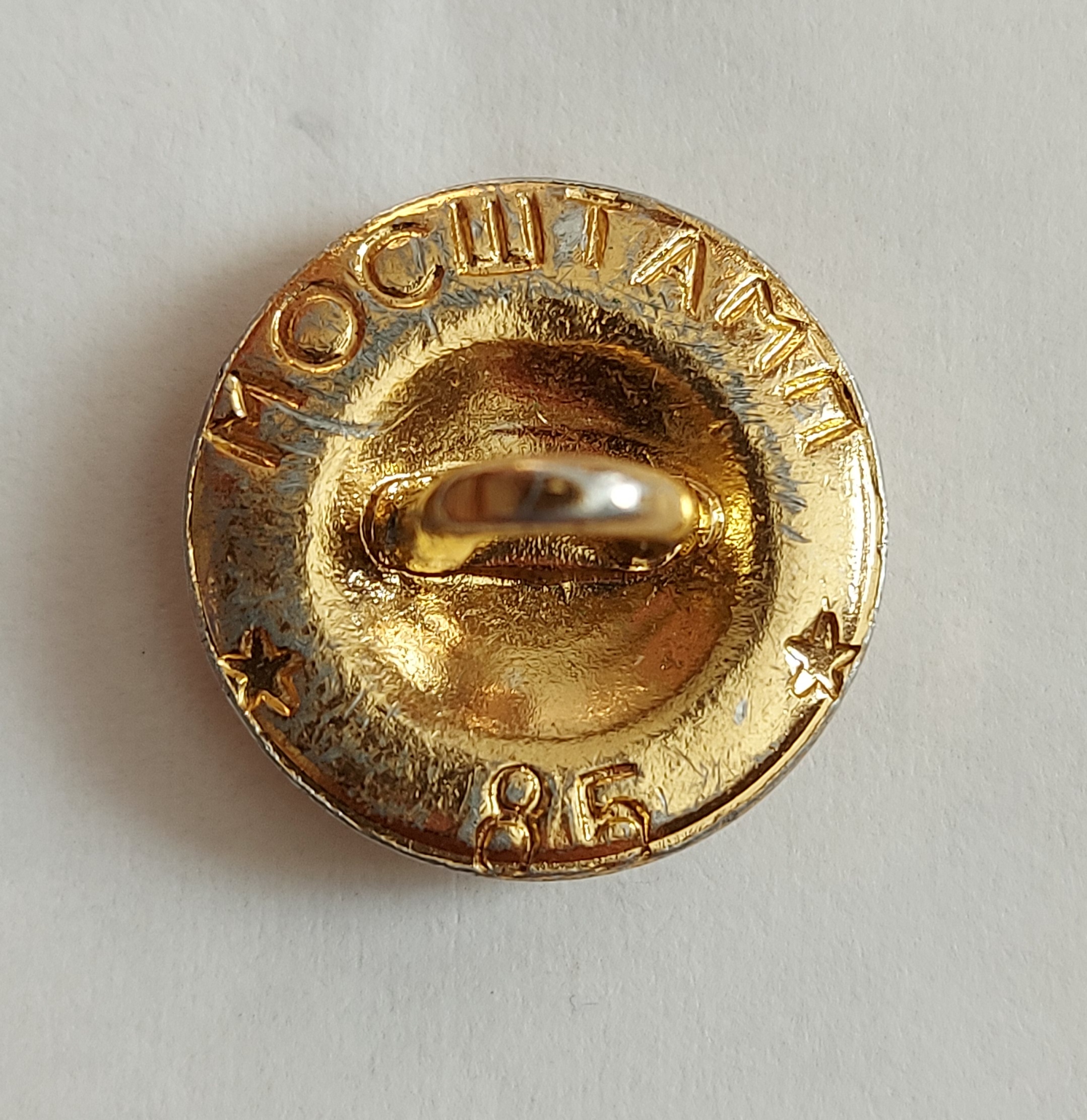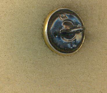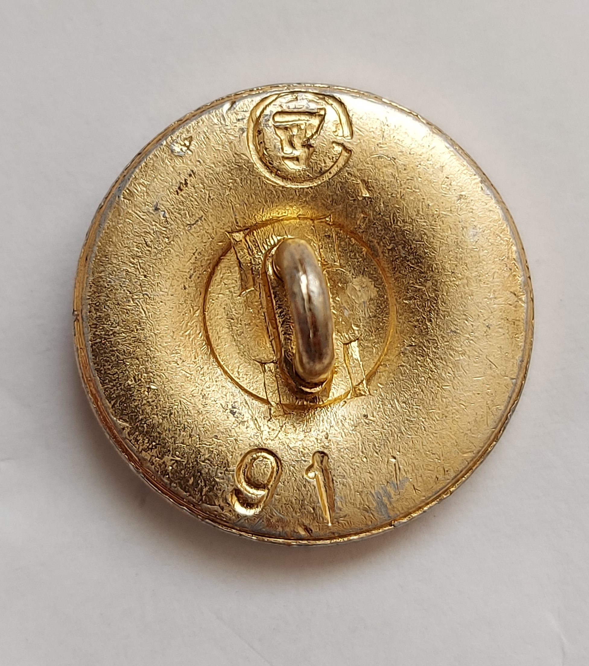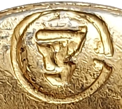 Поискал в своих каталогах клейм и нашёл немного похожую. Но это только внешне. В клейме на пуговице присутствует или буква "Г" (больше похожа), или буква "Т". Получается ГЗС - ТЗС или ГСЗ - ТСЗ. Незамкнутый круг означает - сувениры, буква "З" - завод. Значит Г... завод сувениров или Т... завод сувениров.