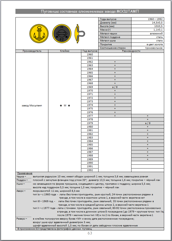 Леонид! Спасибо за фото. Вы всегда нас выручаете недостающими звеньями. Но данная "цепочка" пуговиц не завершена, нет начала и нет конца. Осталось не найденными пуговицы пяти годов - 1960, 1961, 1990, 1991 и 1992. Надеюсь в будущем найдутся. Пока занимаюсь обработкой фотографий. Честно сказать меня завалили (но это в радость). Выкладываю пока таблицу. Если что-то не так, высказывайтесь.