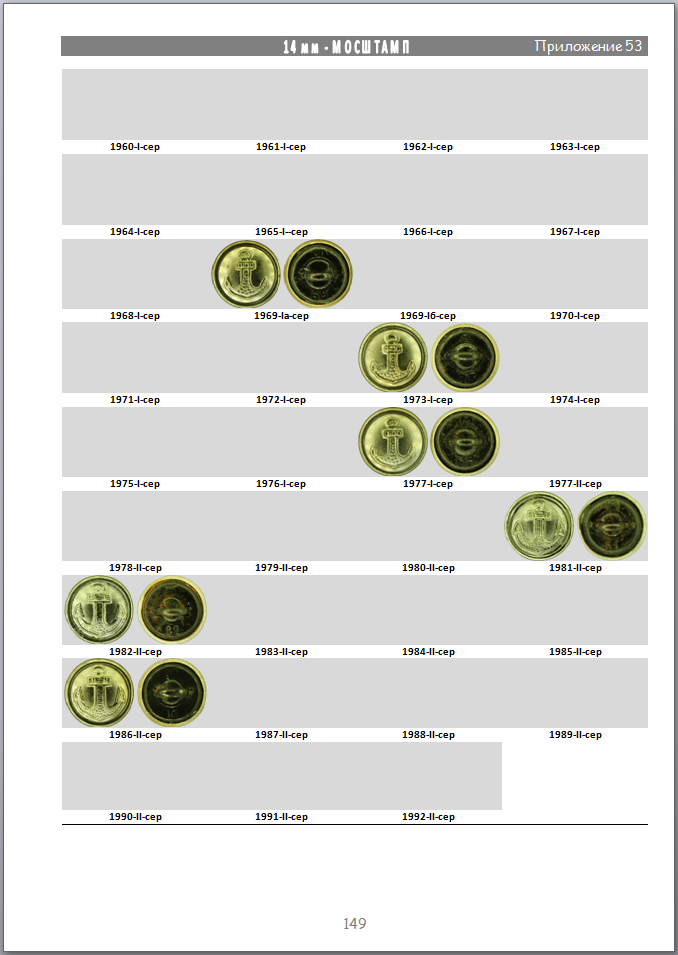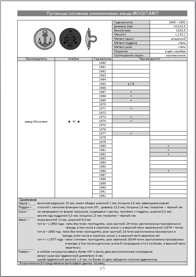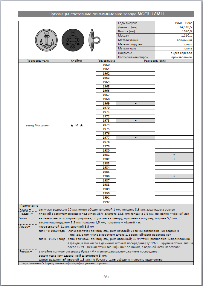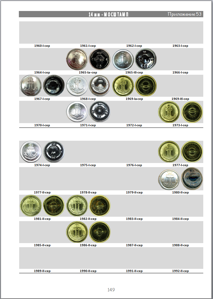 Выкладываю последнюю страницу Раздела "Составные алюминиевые пуговицы". Здесь представлены пуговицы с якорем в цвет серебра диаметром 14 мм. В Приложении 53 (стр.149) изображения пуговиц разделил на две части - до 1973 года и после. Возможно и в таблице нужно сделать такое же разделение. Но пока решил оставить так. Спасибо всем, кто прислал фото пуговиц. Если не будут ещё фото пуговиц данного типа, то заканчиваем производство завода МОСШТАМП и переходим к другим производителям.
