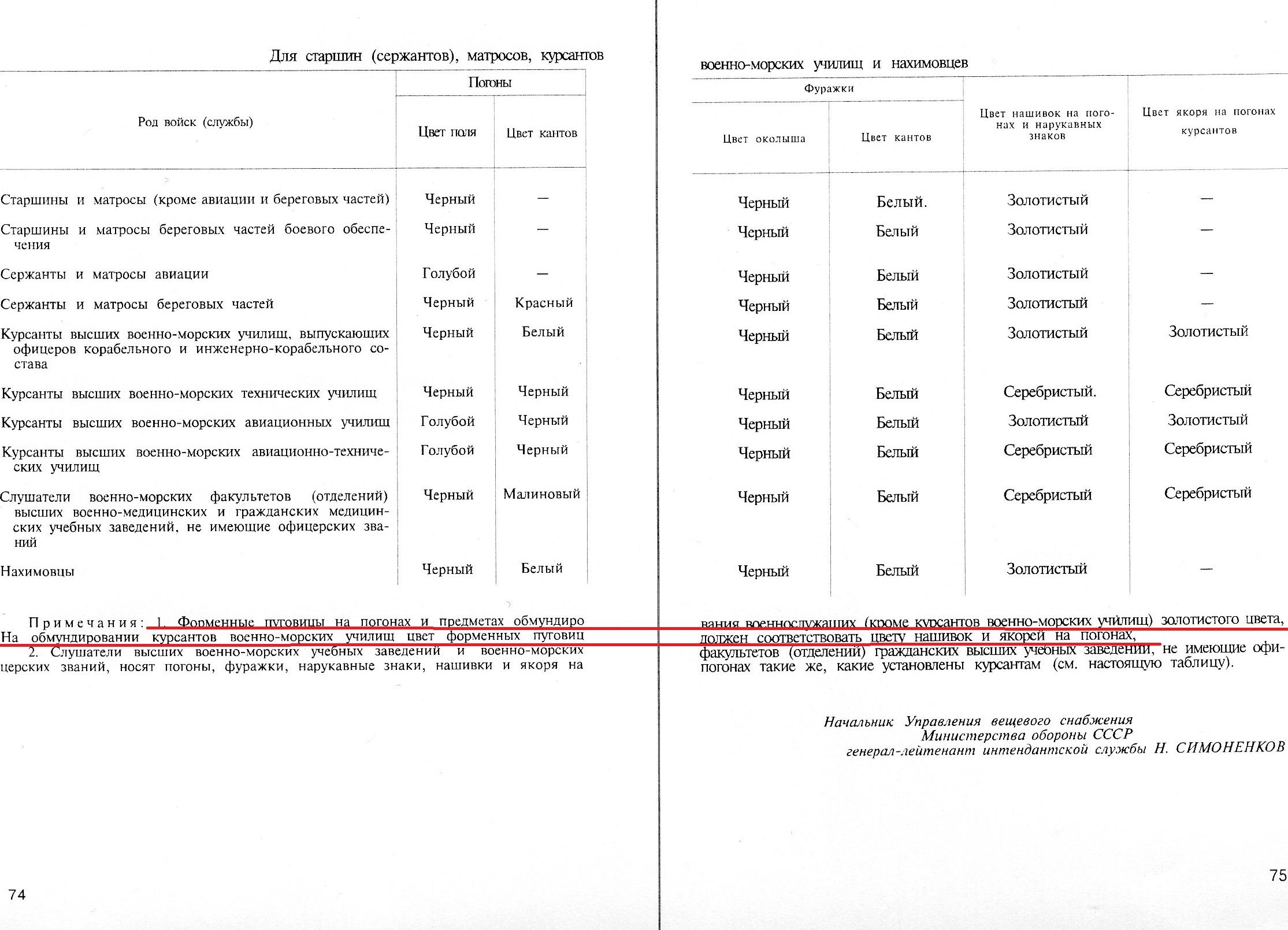 "По цвету поля погон для парадно-выходного обмундирования" для офицеров и по "цвету нашивок и якорей на погонах" для курсантов - приказ 1969 года № 191, приложение 1.