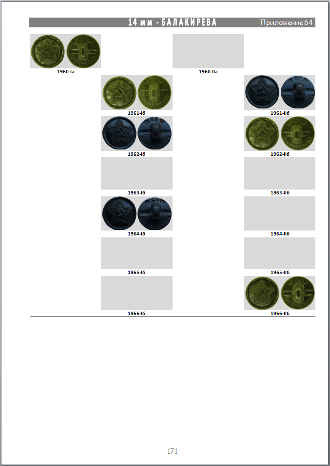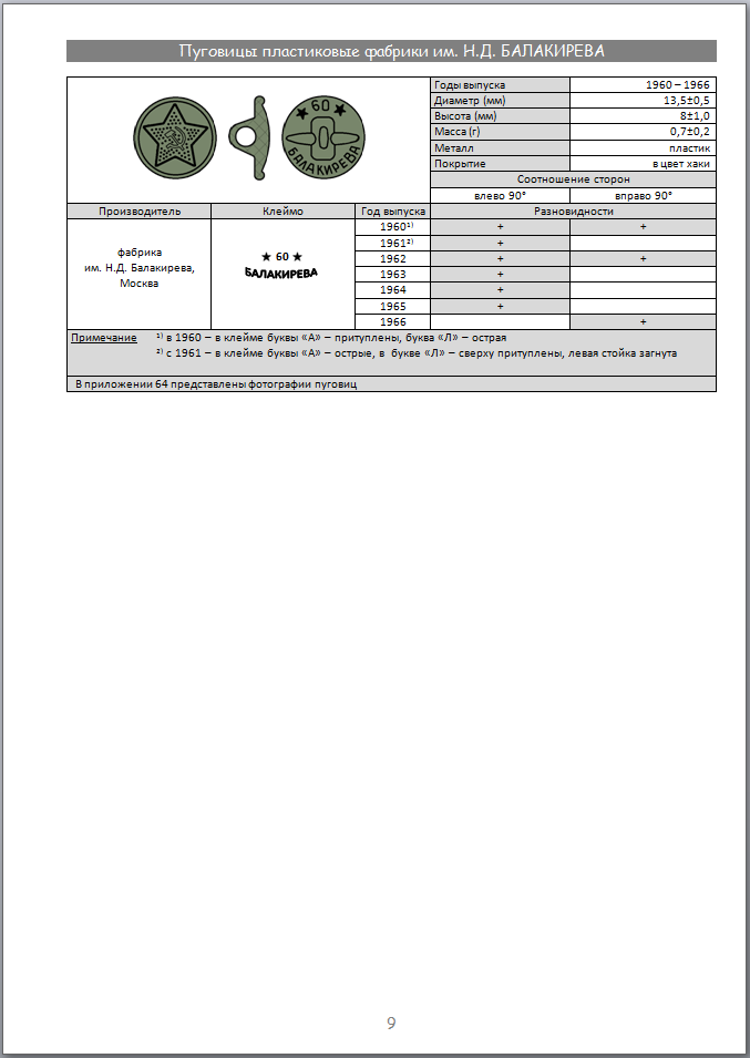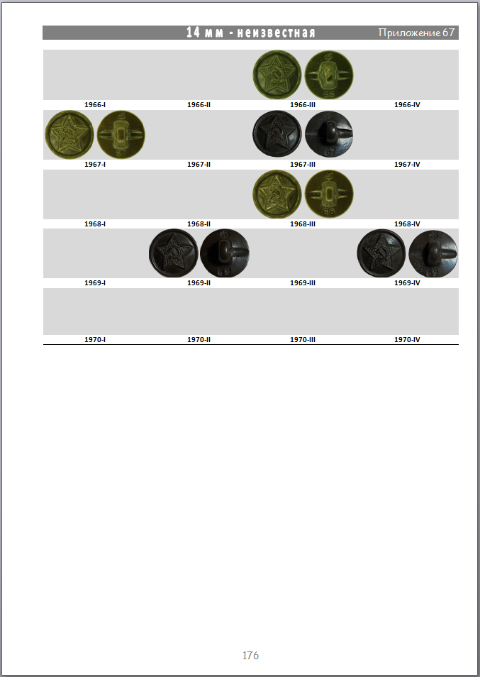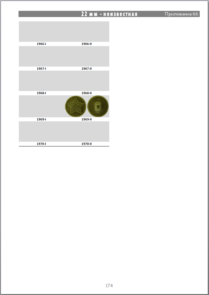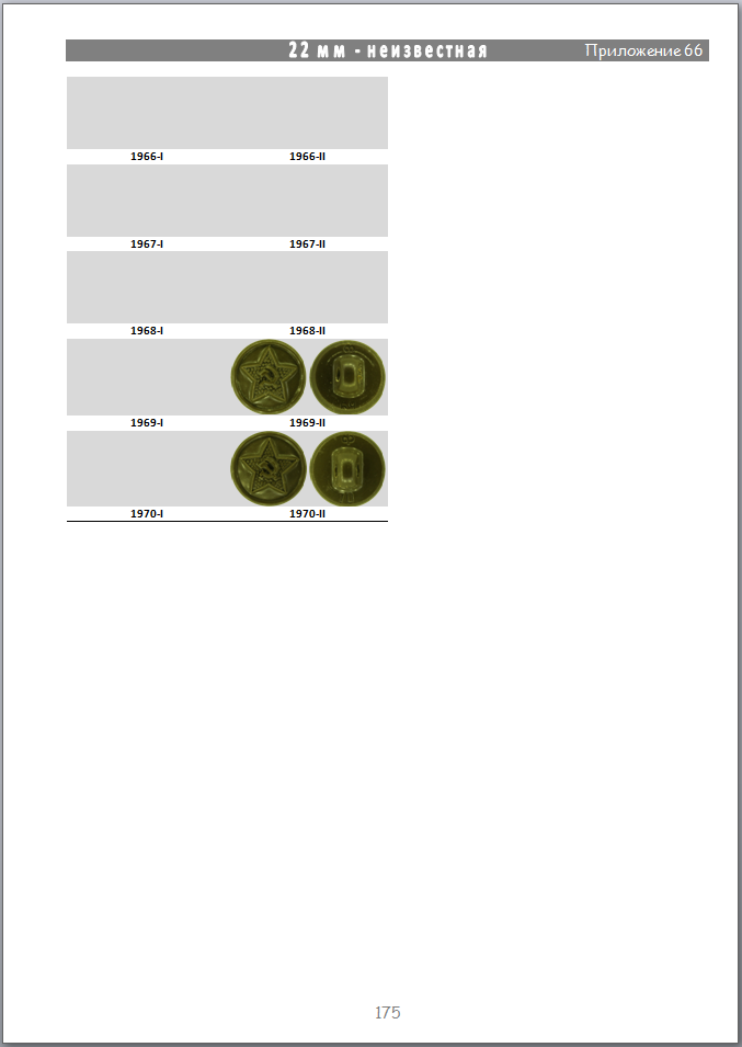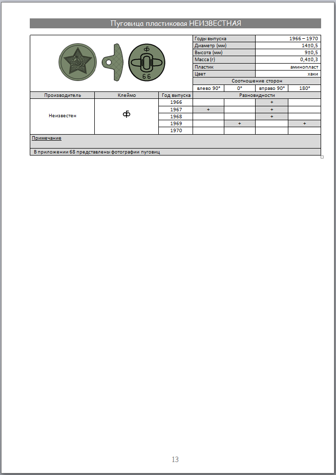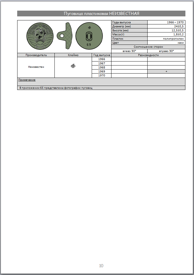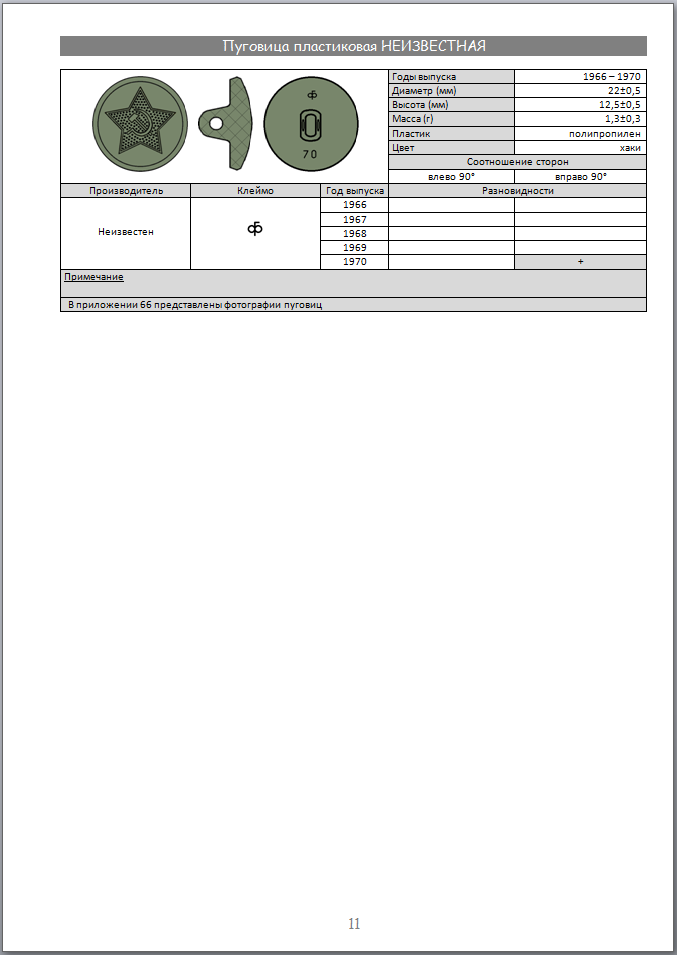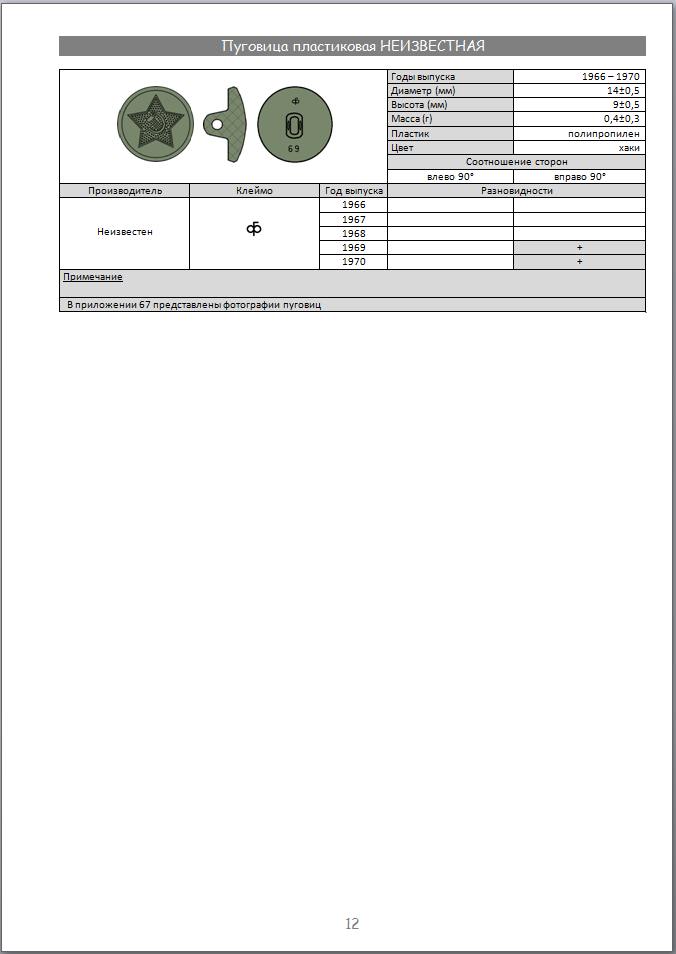 Поэтому сегодня выкладываю ещё две страницы Каталога. Правда по этим пуговицам есть некоторые вопросы. В 1969 году малые (14 мм) пуговицы есть двух типов и из аминопласта, и из полипропилена. Возможно в этот год был переход с одного пластика на другой. Так как уже в 1970 году пуговиц из аминопласта не встречается. И ещё пуговицы из аминопласта встречаются с разными разворотами аверса к реверсу, а пуговицы из полипропилена только с разворотом вправо на 90 градусов. Поэтому ждём фото от Леонида, возможны и другие варианты. И, наконец, может как-то объединить таблицы с пуговицами из различных пластиков или оставить пока как есть? Отдельно для пуговиц из аминопласта и отдельно из полипропилена.