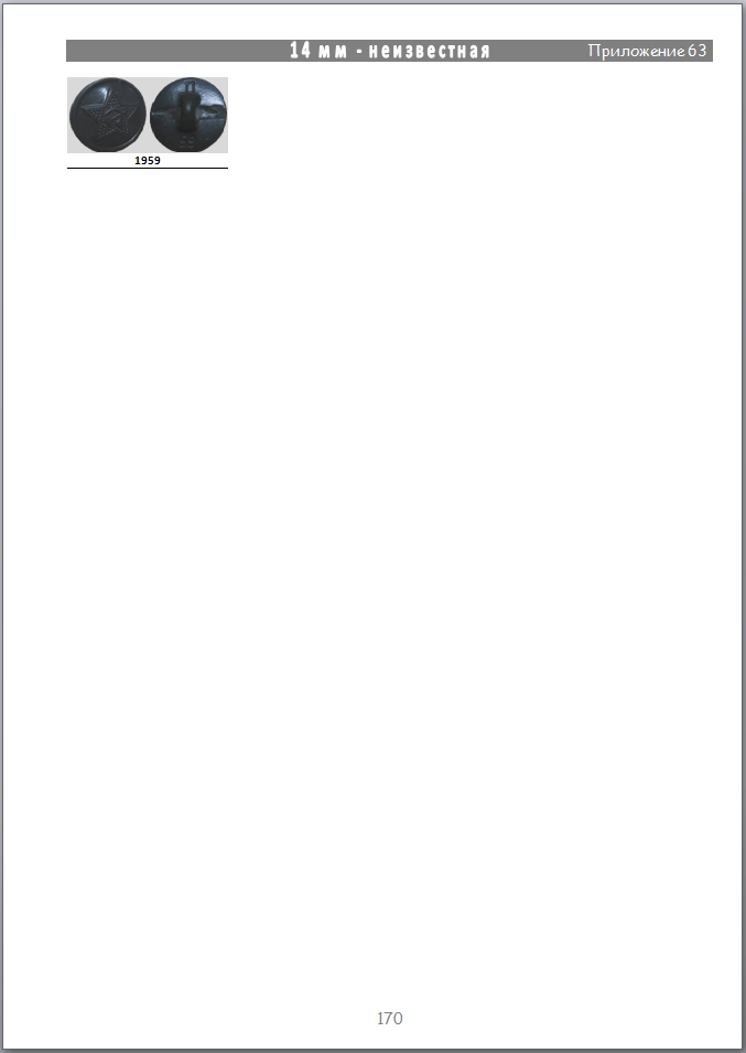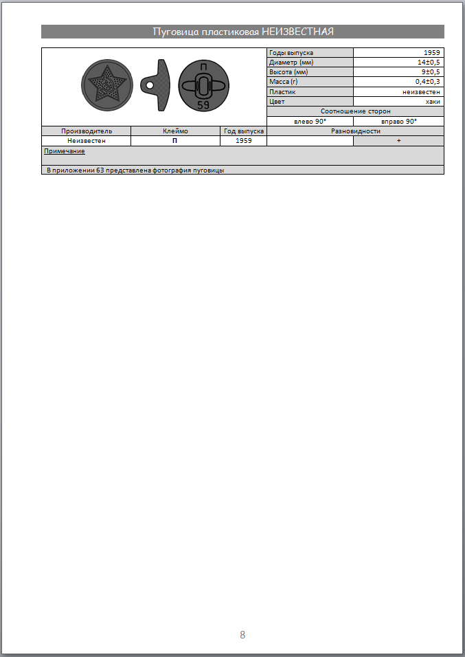 Александр! Хорошо попробую объединить. Тогда нужно будет объединить и таблицы приложения. Ещё - нет информации о пуговицах диаметром 22 мм и 24 мм из аминопласта 1966-69 годов. По хронологии нужно бы начать с пуговиц 1966 года, т.е. диаметром 14 мм. Пока жду что-нибудь от Леонида. Тогда и займусь объединением и окончательным оформлением пуговиц с клеймом ГФ. Интересно всё таки какая фабрика выпускала данные пуговицы. Облазил Интернет, ничего нет. Сейчас делаю таблицу на пуговицу с клеймом "П". Это пуговица по хронологии более ранняя из пластиковых.