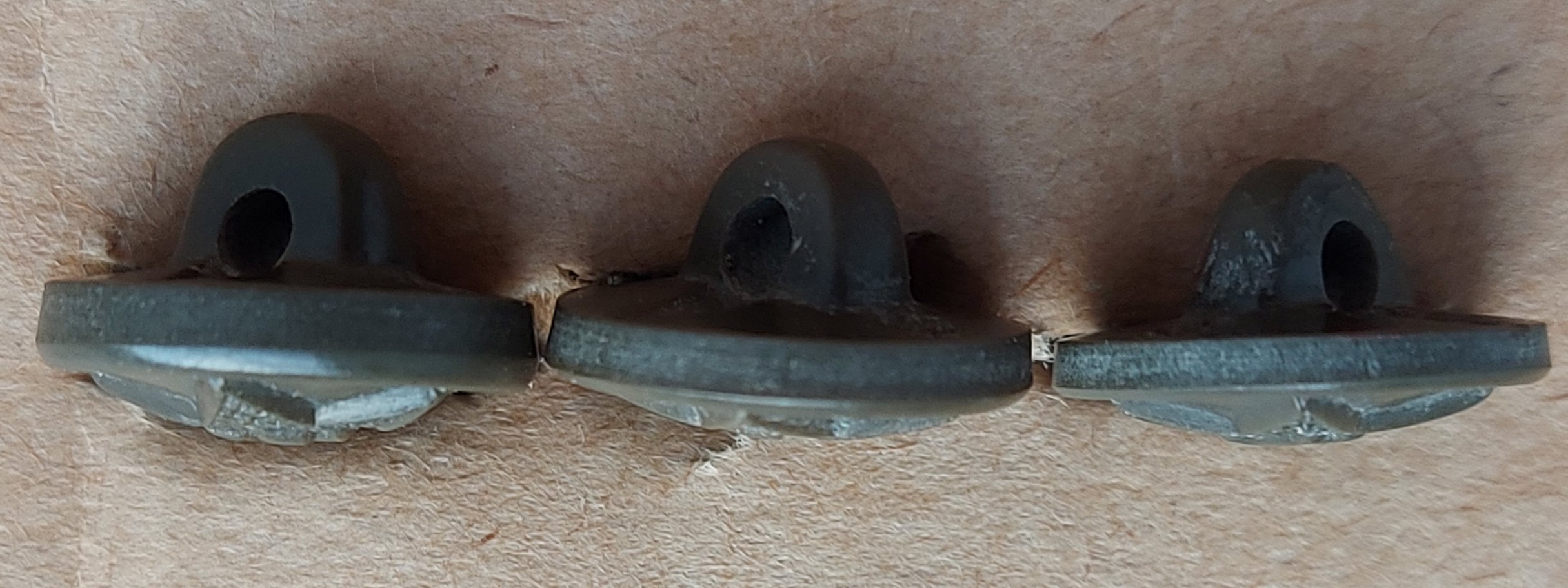 Слева на право. 1) ФГ 69 аверс не повернут относительно реверса. Высота 9,4 мм; толщина 4,5 мм. 2) ФГ 69 аверс повернут относительно реверса на 180 градусов. Высота 8,5 мм; толщина 3,9 мм. 3) ФГ 69 аверс повернут относительно реверса на 90 градусов вправо. Высота 8,1 мм; толщина 3,4 мм. Получается разница в толщине пуговицы без поворота к пуговице с поворотом на 90 градусов 1,1 мм и это ощутимая разница.
