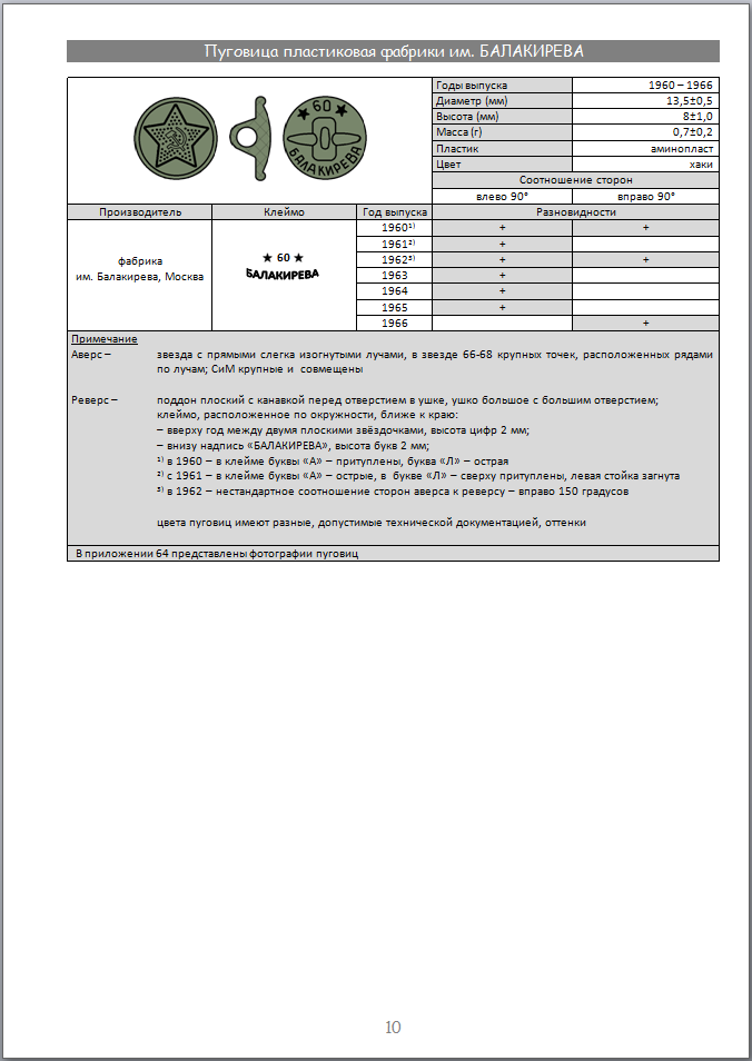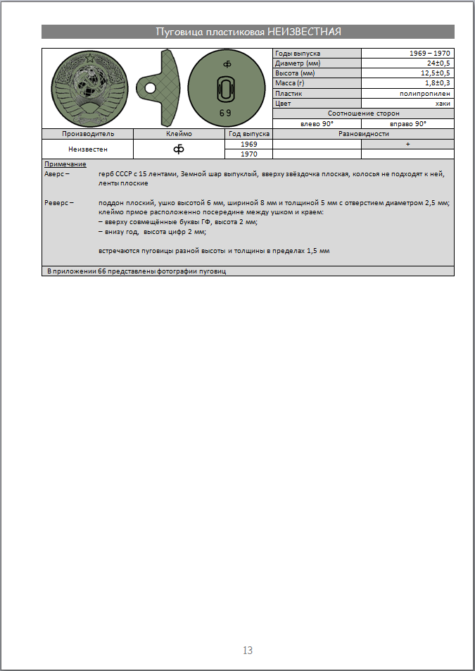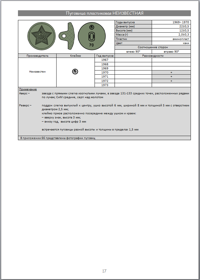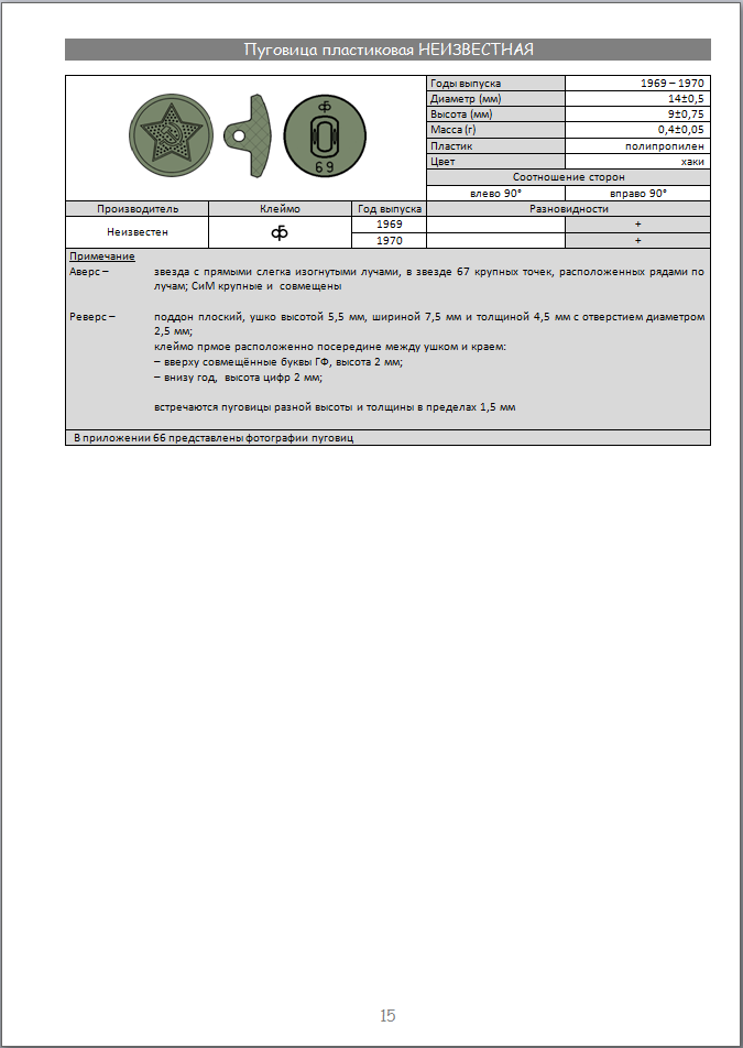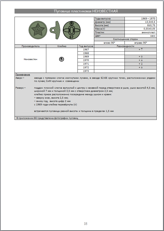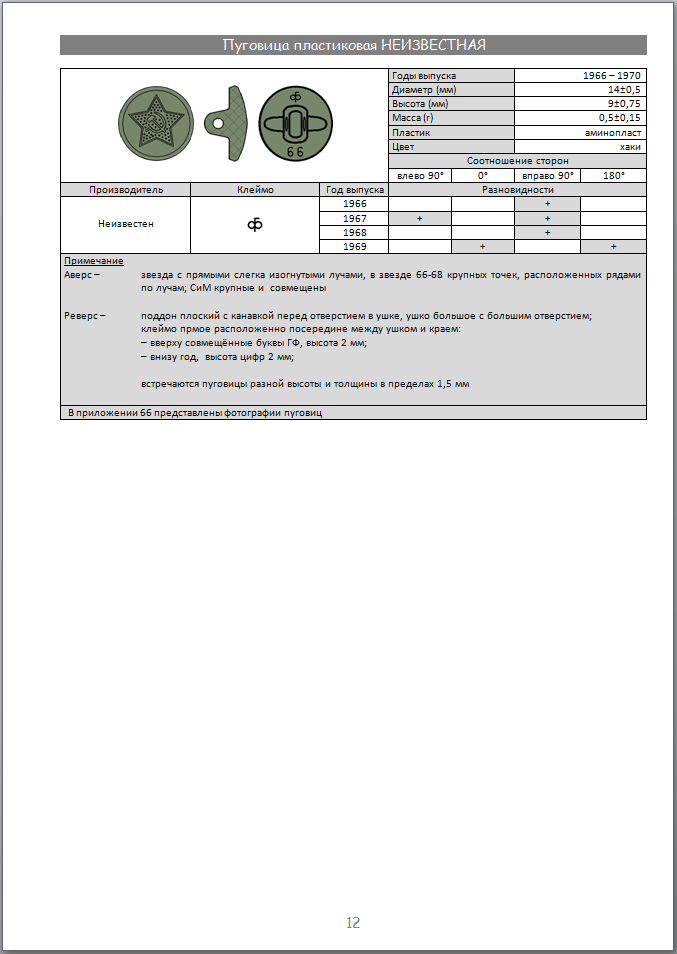 Ещё одни пуговицы с клеймом "ГФ" откорректировал. Сделал в таблицах описание пуговиц и переставил таблицы. Не стал объединять пуговицы диаметром 14 мм из аминопласта и из полипропилена. По аверсу они похожи, но реверсы у них разные. У у тех и у других есть разные по толщине пуговицы. В примечании написал о разных толщинах пуговиц. Если нашли какие-либо ошибки или есть замечания, пишите, исправлю.