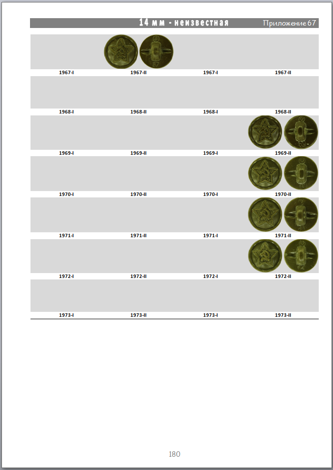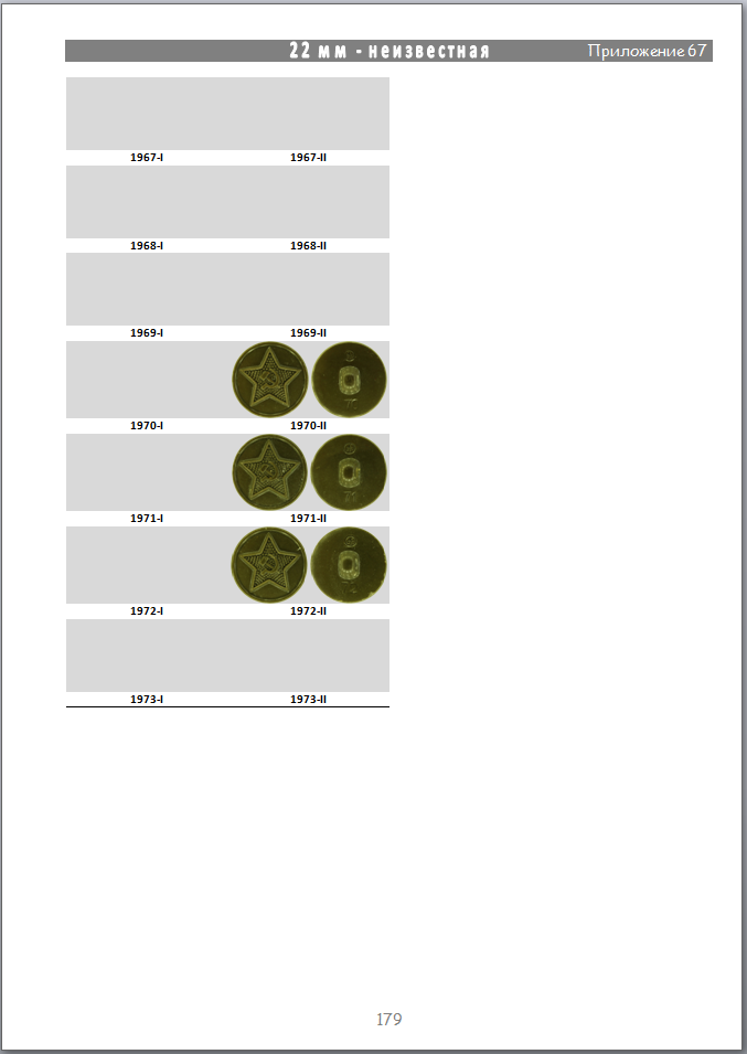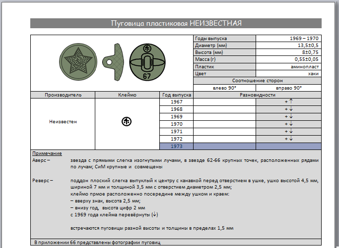 Алексей! и Александр! Спасибо за фото пуговиц. Внёс из и в Каталог, и в Приложение. У меня возник вопрос по 1973 году (в таблице закрашены в розовый и серый цвета). По идее при переходе с одного клейма на другое в одном предприятии, встречаются в один год и то и другое. Но если производство передаётся на другое предприятие, то с изменением маркировки совмещение может и не быть (процесс передачи производства растянут на многие месяцы). Мы это не узнаем пока не найдём документы, подтверждающие производство пуговиц на данном предприятии.
