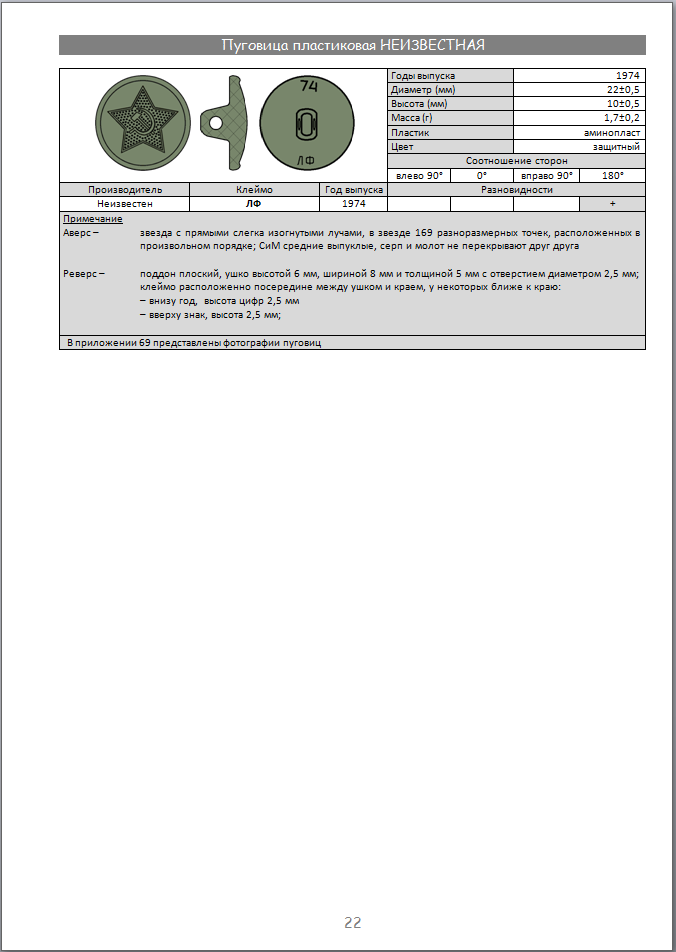 Леонид! Отличный экземпляр. Спасибо! Я так понял реверс уже показан в развёрнутом соотношении к аверсу, т.е. вправо на 90 градусов. Представлены буквально все развороты и влево, и вправо, и без разворота. Прошлая пуговица ЛФ-74 по цвету похожа на оливковый. Или всё таки защитный цвет?