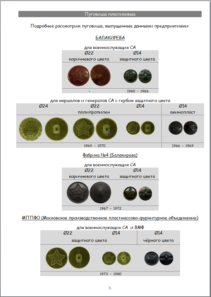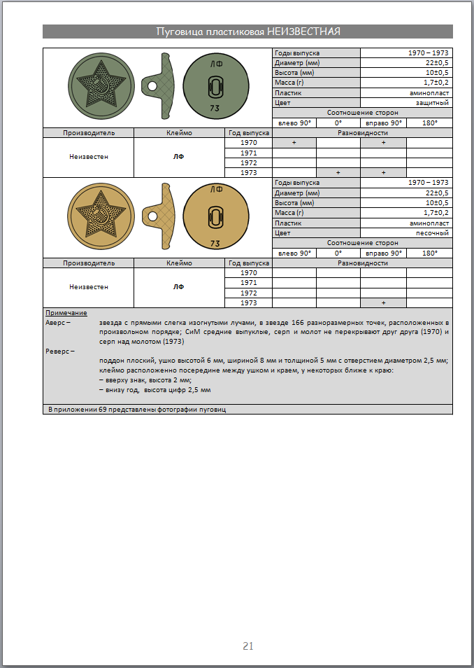 Весь вечер искал информацию о производителях пластиковых пуговиц в СССР. В основном информация была о гражданских пуговицах. Хотя можно предположить, что там, где делали для гражданских могли производить и для военных. Основные пуговичные фабрики находились в Москве, Московской области, Ленинграде, Перми и ещё нескольких городах. Как пишут не так много для СССР. Интересную информацию нашёл по Лебедянской пуговичной фабрике, Липецкой области, г. Лебедянь. До 1968 года производили пуговицы из ракушек, а уже потом перешли на пластмассовые. Многие пуговичные фабрики делали пуговицы из ракушек (перламутровые). В 60-е годы производство стало нерентабельным, некоторые позакрывались, а некоторые перешли на производство пуговиц из пластмассы. Я это написал потому, что клеймо "ЛФ" - возможно и относится к Лебедянской пуговичной фабрике!? Три дня назад Александр (Dwalin) показал много картонок из-под пуговиц различных фабрик. Почти все были с торговыми марками, к сожалению к нашим армейским и флотским пуговицам они не подошли. Может у кого-то ещё есть информация подобного рода. При составлении Каталога очень пригодится. Будем очень признательны.
