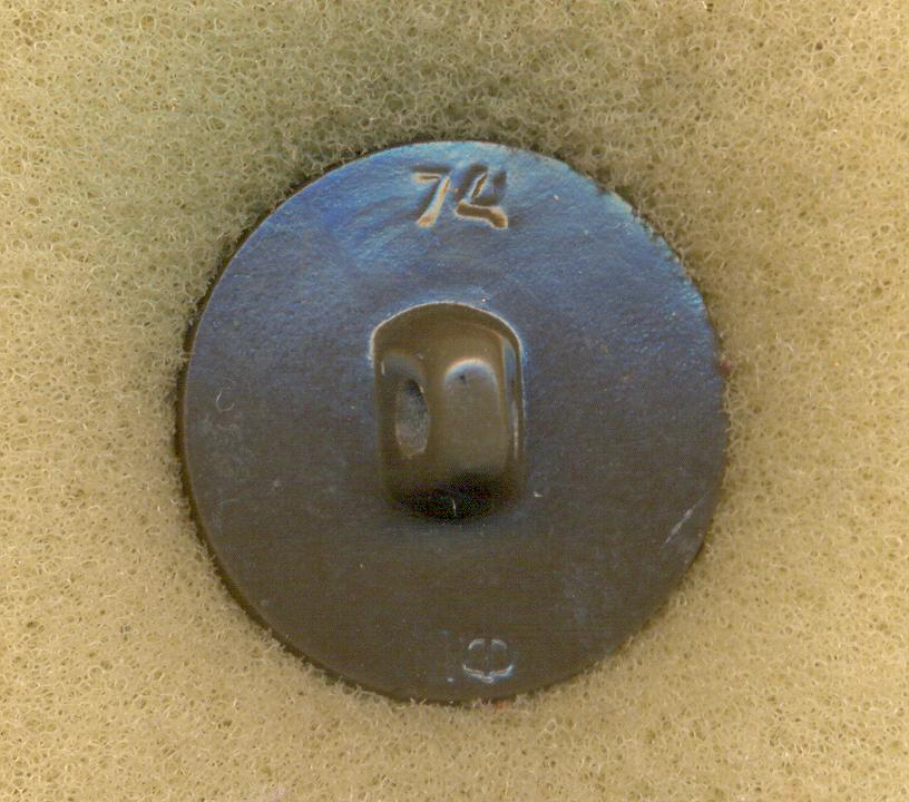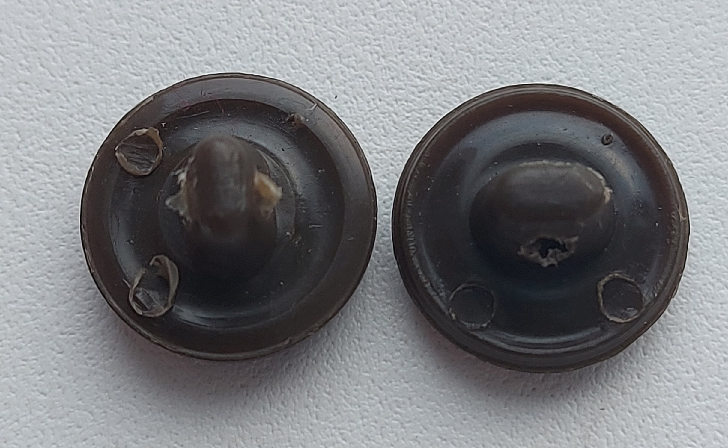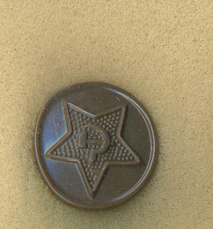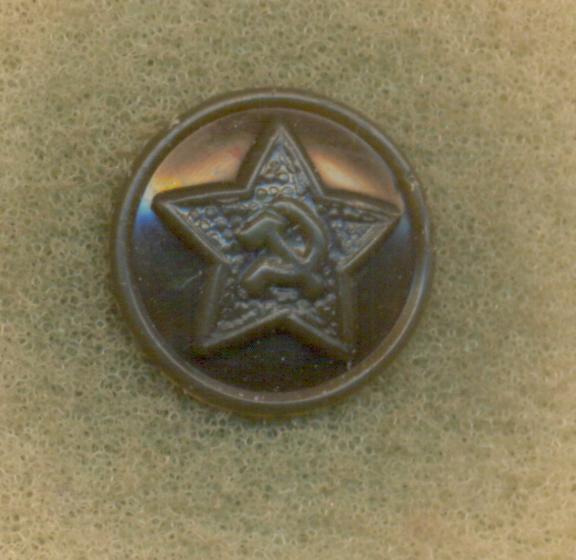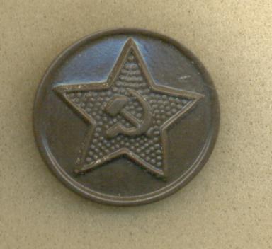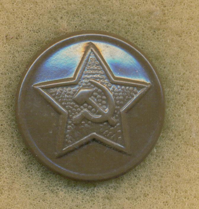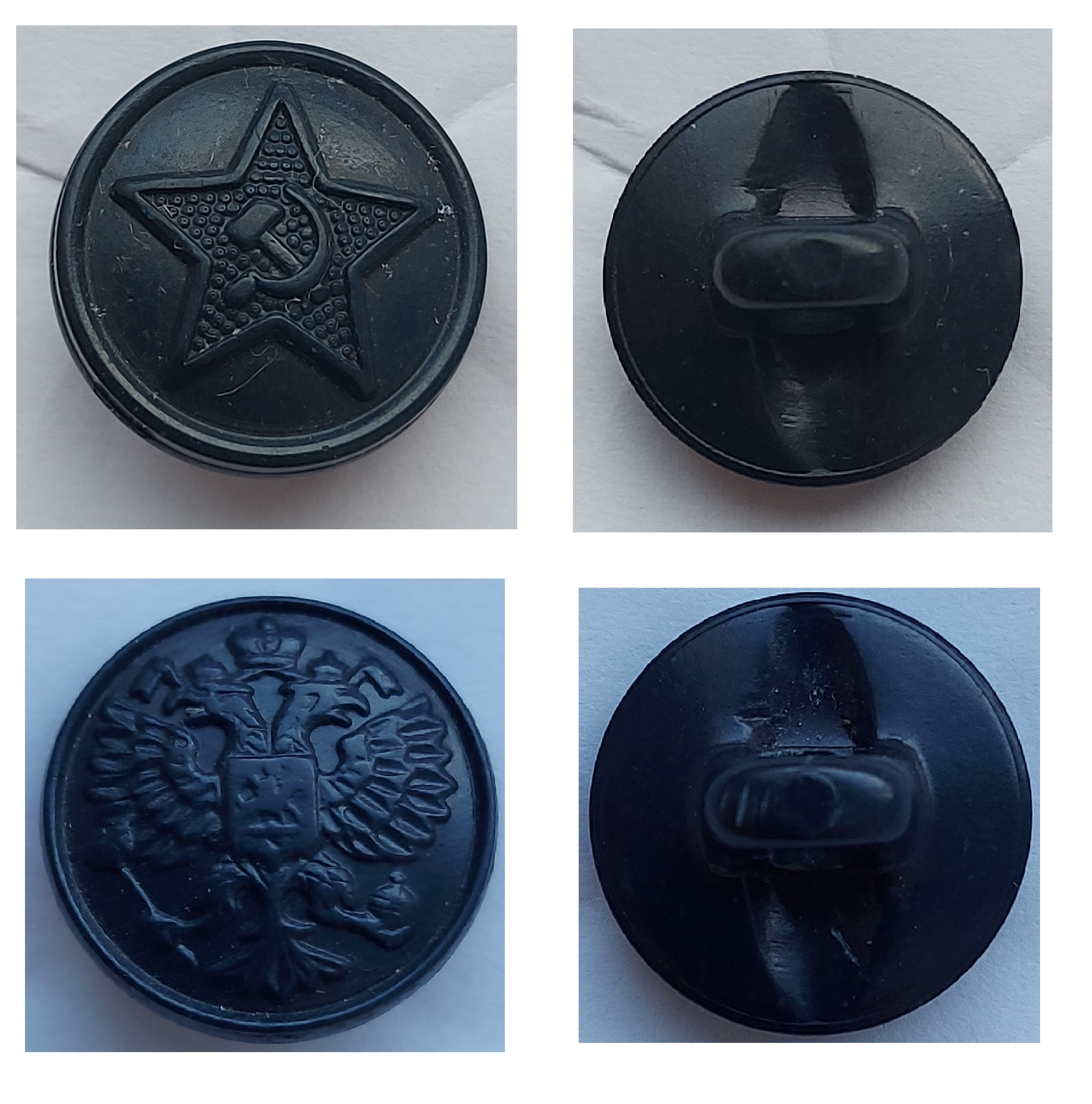 Шамиль. Сравнил пуговицу темно синию со звездой 14 мм и темно синию с двухглавым орлом 14 мм. Реверсы пуговиц идентичны. На реверсе канавка под отверстие в ушке, тонкая коемка по краю пуговицы и на верху ушка небольшая окружность. Можно сделать вывод что пуговицы штамповались на одном предприятии и одними штампами.
