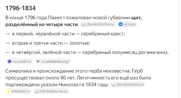 Даниил! Спасибо большое. Теперь всё прояснилось. Император Павел I в 1797 году утвердил четырёхчастный герб Костромской губернии, но это утверждение не вошло в Полное собрание законов Российской империи. Я штудировал, просматривал ПСЗ и не нашёл законы по Костромской губернии. Эта ситуация сродни с константиновским рублём. Константин ещё не присягнул на трон, а монеты с его портретом уже отчеканили. Получается, что пуговица с галерой просуществовала всего один год, а затем пошли пуговицы с четырёхчастным гербом.