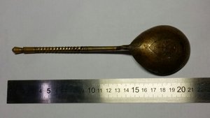 Что бы понять, могло ли то, что представлено на фото в заглавном посте быть ложкой, желательно увидеть обратную сторону и узнать размеры. Может быть на фото просто несколько искажены пропорции, но предмет мне кажется не строго овальным, а скорее яйцевидным, что ещё больше наводит на мысли о бывшей ложке.