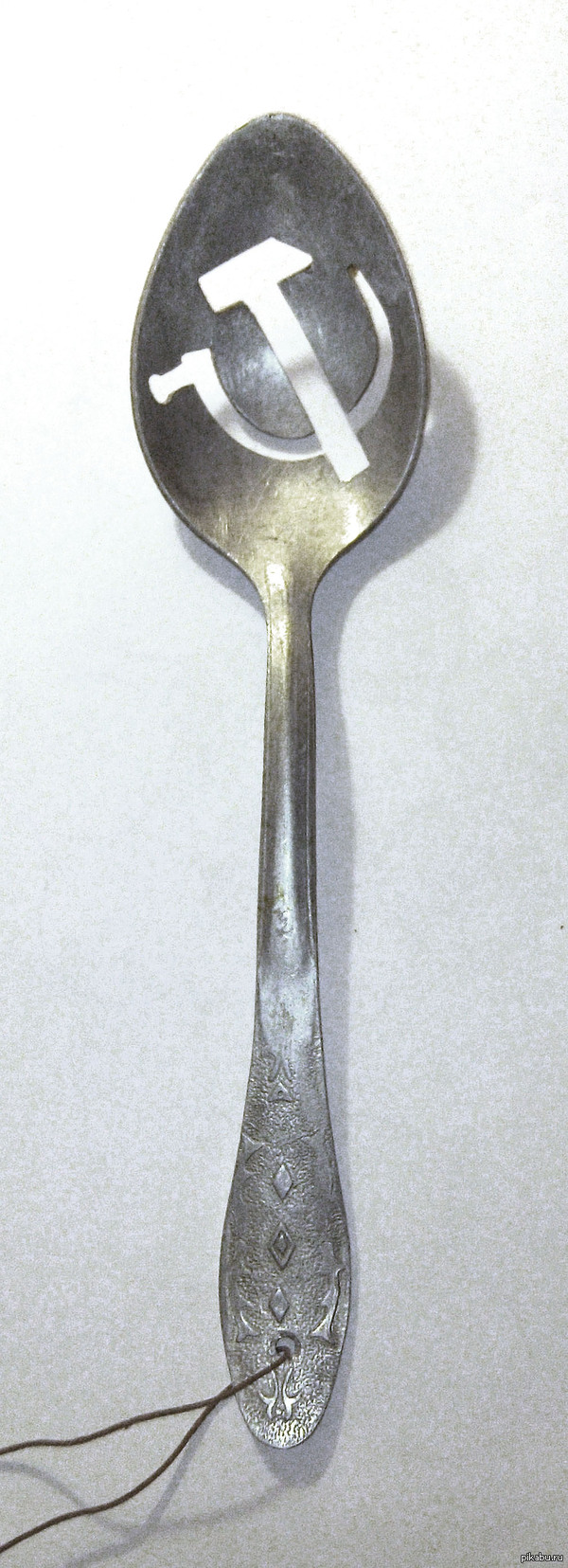 Это какой-то стёб над советской символикой - я имею в виду ложку с прорезанным насквозь серпом и молотом. Сложно сказать, какой именно подтекст вкладывал автор в свою поделку, но явно негативный по отношению к СССР.