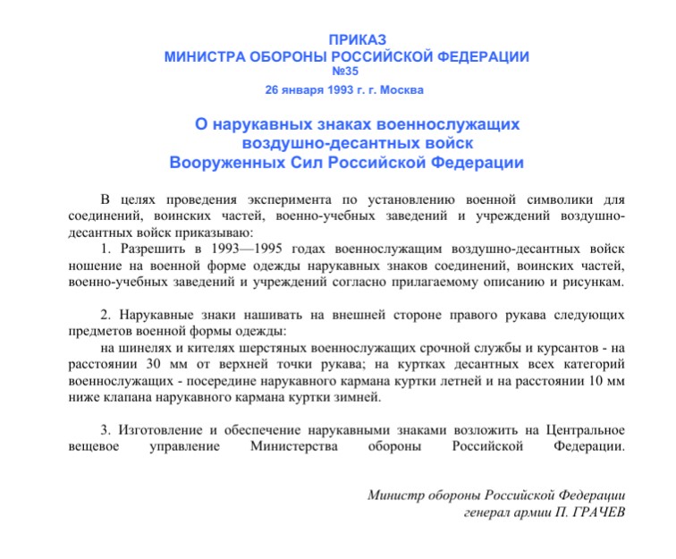 Предполагался неофициальный нарукавный знак с флагом. Но Паша-мерседес не додумался его утвердить своим приказом... Вообще Грачев славился всякими изысками в форменной одежде. Одни его "аэродромы" чего стоят. И не всегда его изыски сопровождались официальным утверждением через приказ. Кстати, если Вы обратили внимание, вводимые нарукавные знаки ВДВ имели статус экспериментальных, о чем прямо сказано в приказе.