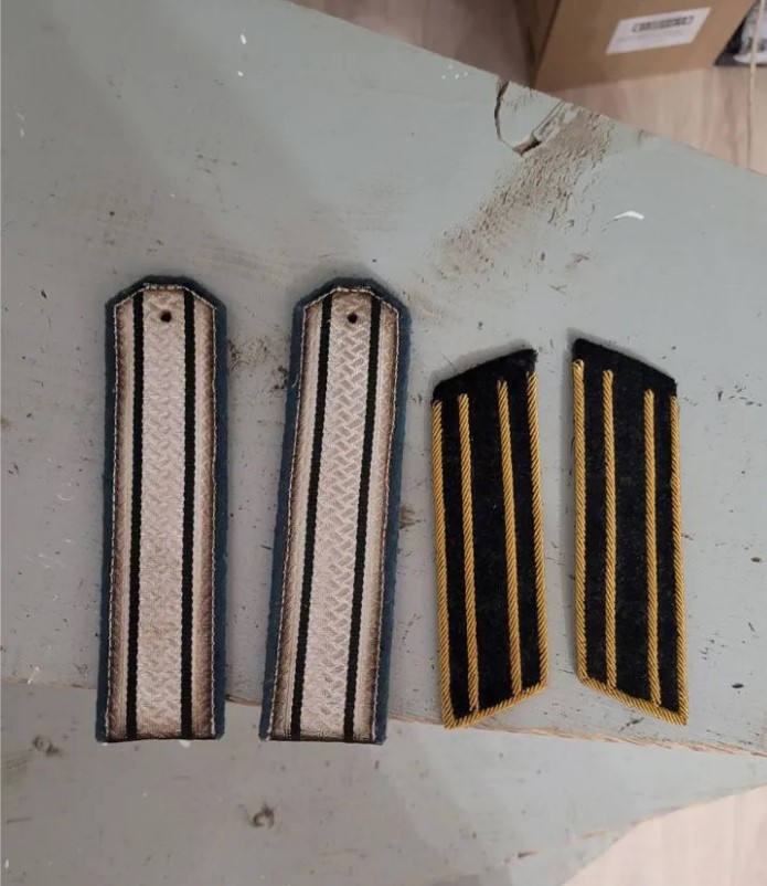 На фотографии знаки различия военного юриста 2 ранга (изначально) и майора юстиции (те же самые знаки различия через месяц после введения погон). Также - знаки различия гражданского прокурорского работника - погоны (образца 1943 г.) и петлицы (образца 1954 г.) для советников юстиции (включая старших и младших) без звёзд.