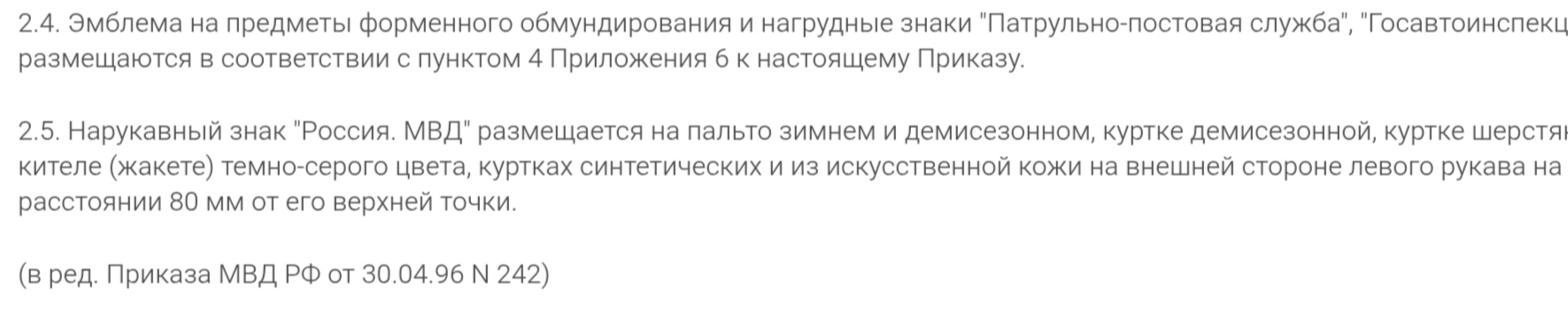 2.5. Нарукавный знак "Россия. МВД" размещается на пальто зимнем и демисезонном, куртке демисезонной, куртке шерстяной, кителе (жакете) темно-серого цвета, куртках синтетических и из искусственной кожи (кроме курток для личного состава подразделений по организованной преступности) на внешней стороне левого рукава на расстоянии 80 мм от его верхней точки.