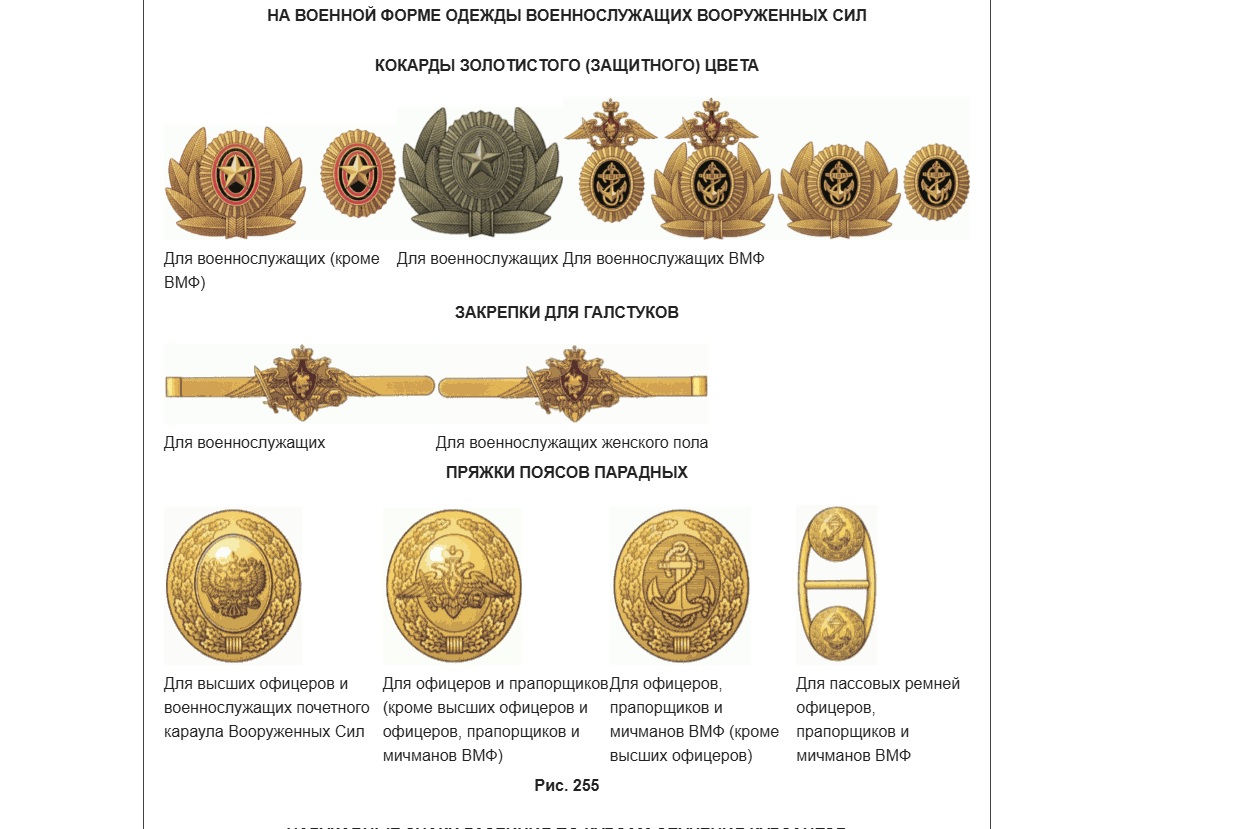 для высших офицеров (кроме маршалов Российской Федерации) – шитье золотистого цвета 5-процентного золочения в виде венка из лавровых листьев, перевязанного внизу лентой с полосками по центру и краям.