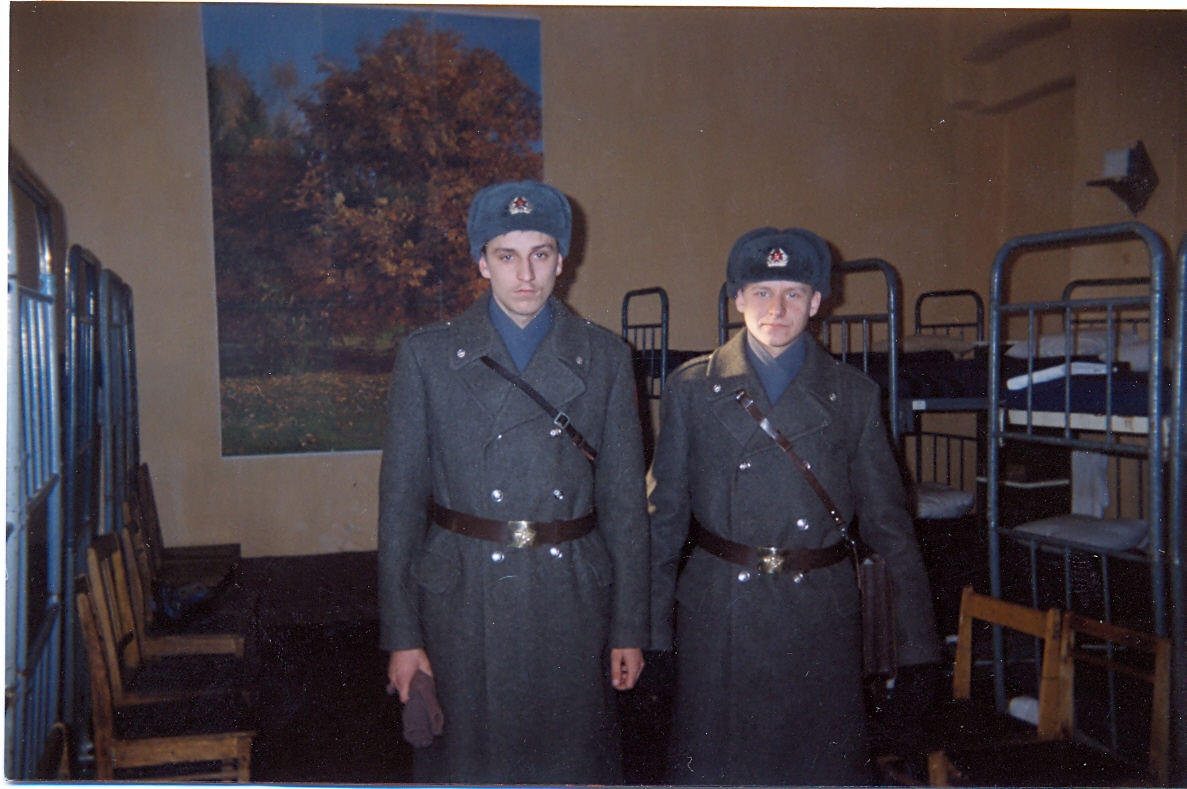 на заднем фоне курсант в шинели с красными погонами (старший курс), а на первом курсе носили на погончиках буквы К
