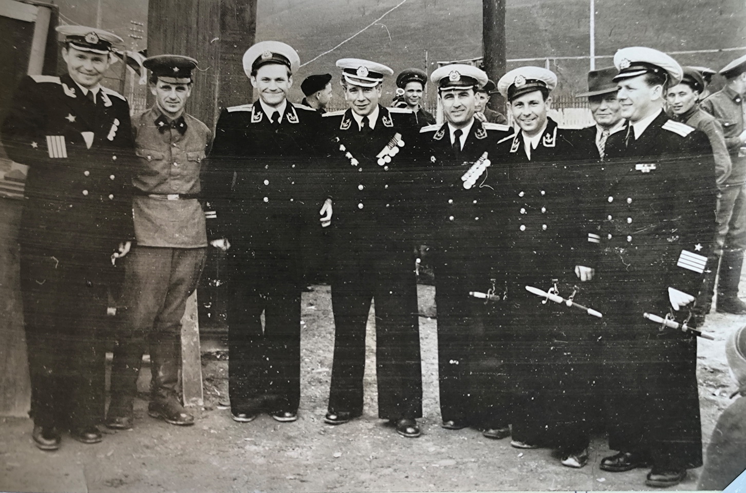 Ощущение когнитивного диссонанса при взгляде на фотографию: "водоплавающие" одеты по форме середины 50-х годов ХХ века, а вот "махра" со знаками различия в петлицах и при полном отсутствии погон!