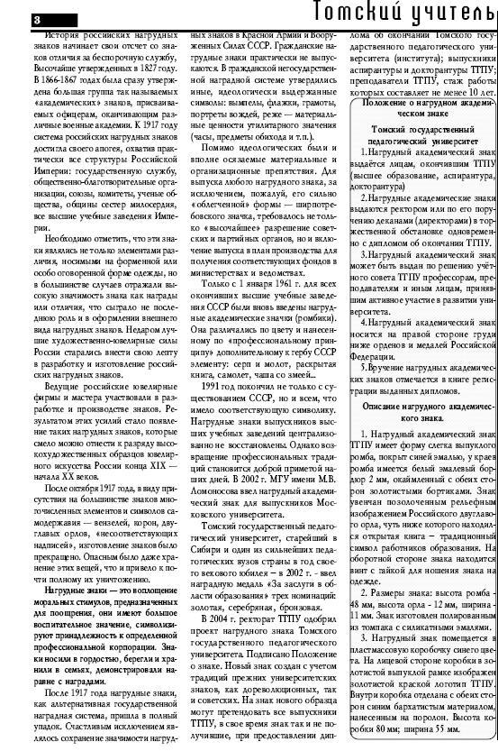 Ещё одиин пример с форума любителей фалеристики: статья в газете "Томский учитель", в которой приводится положение о нагрудном знаке об окончании ТГПУ, принятое ректоратом данного учебного заведения: