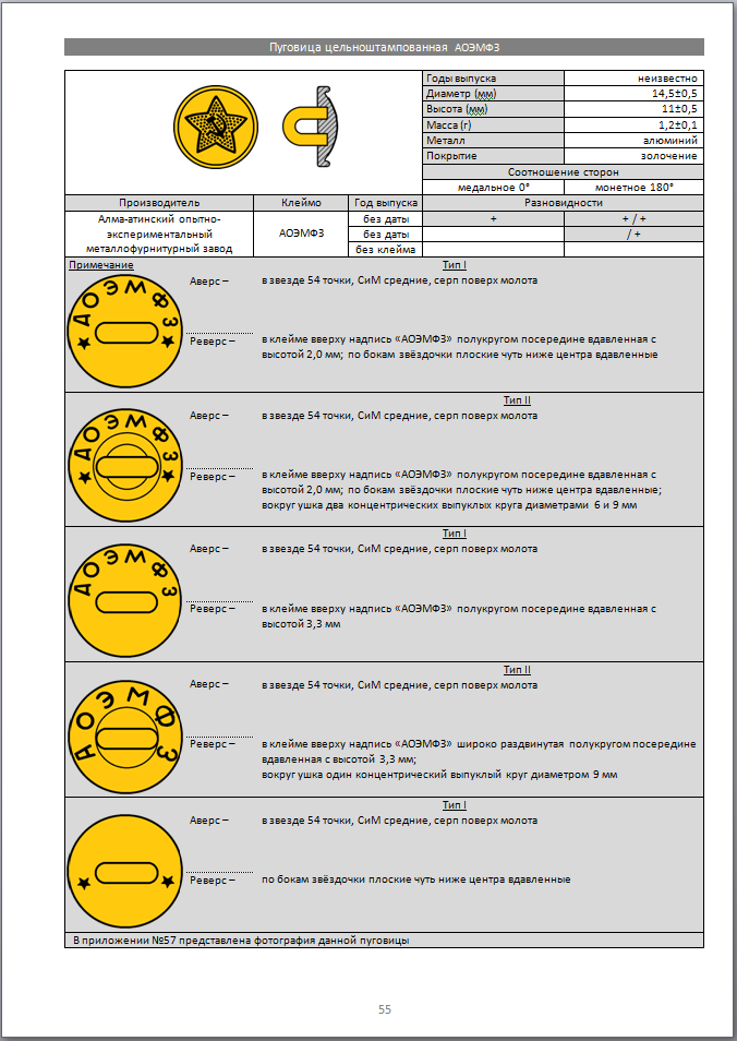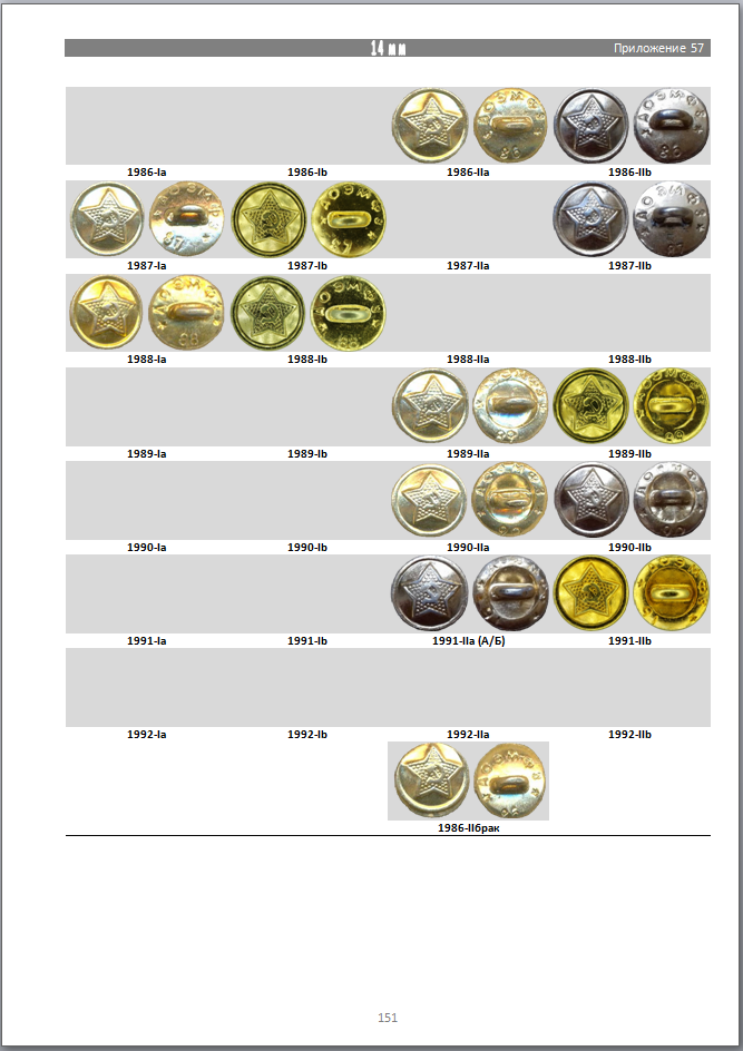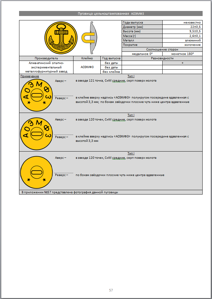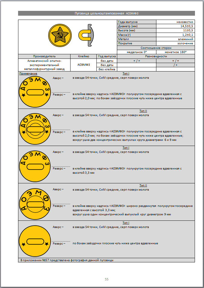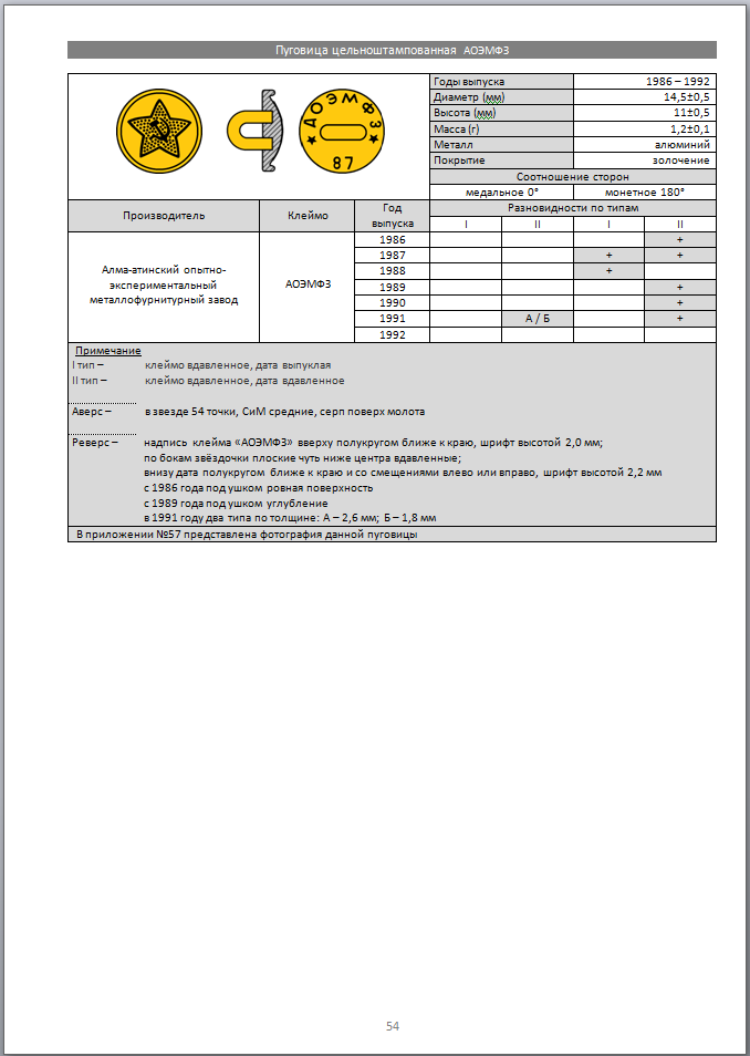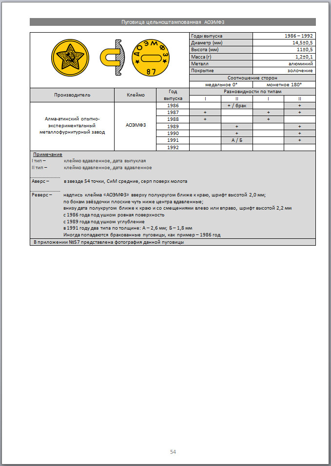 chamil54 написал(а):Александр! В основной массе, мне кажется, собиратели пуговиц останавливаются на типе. Даже по годам не собирают. По годам собирают небольшое число коллекционеров. А уж по разновидностям одного года просто единицы. Для большинства данный Каталог будет являться как бы ориентиром. Ваше замечание двум пуговицам "Ф-КА N1 ц5к 75" диаметром 22 мм со звездой интересно. Поэтому надо во всех таблицах сделать пункт (там где это встречается), что возможны различия шрифта в написании клейма. Так как в миллионных тиражах обязательно найдутся различия.