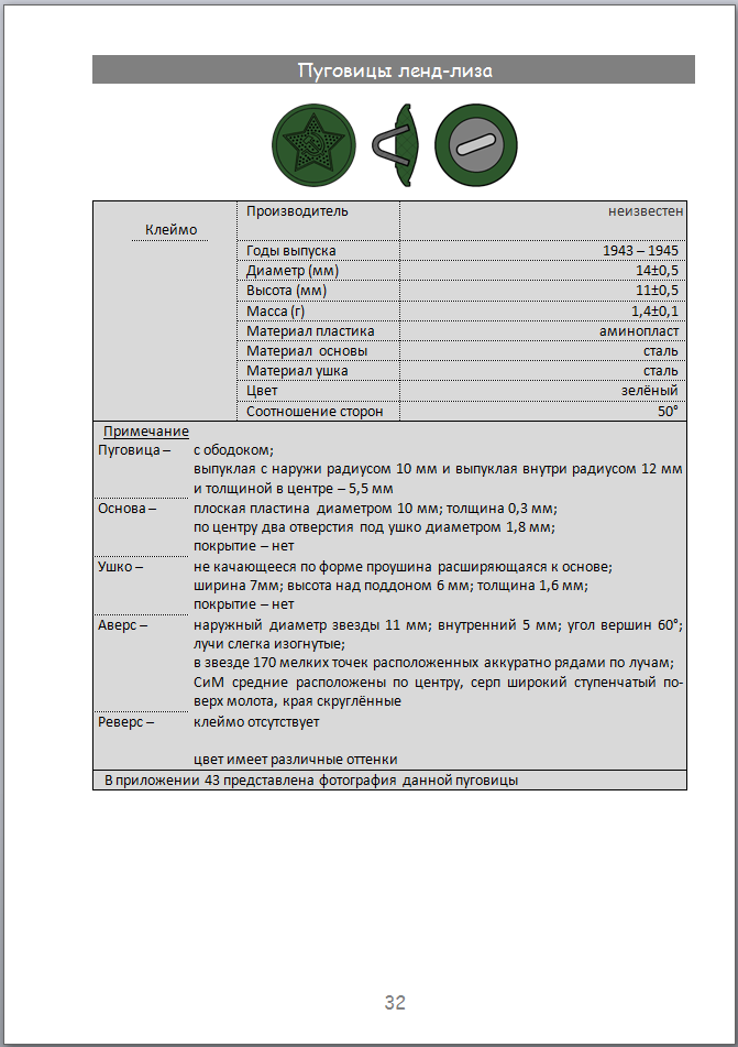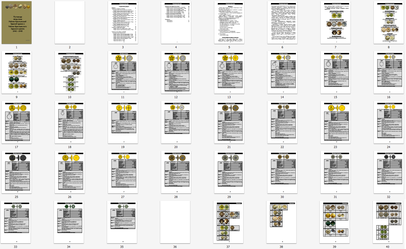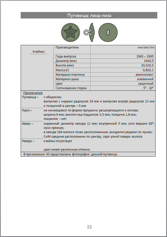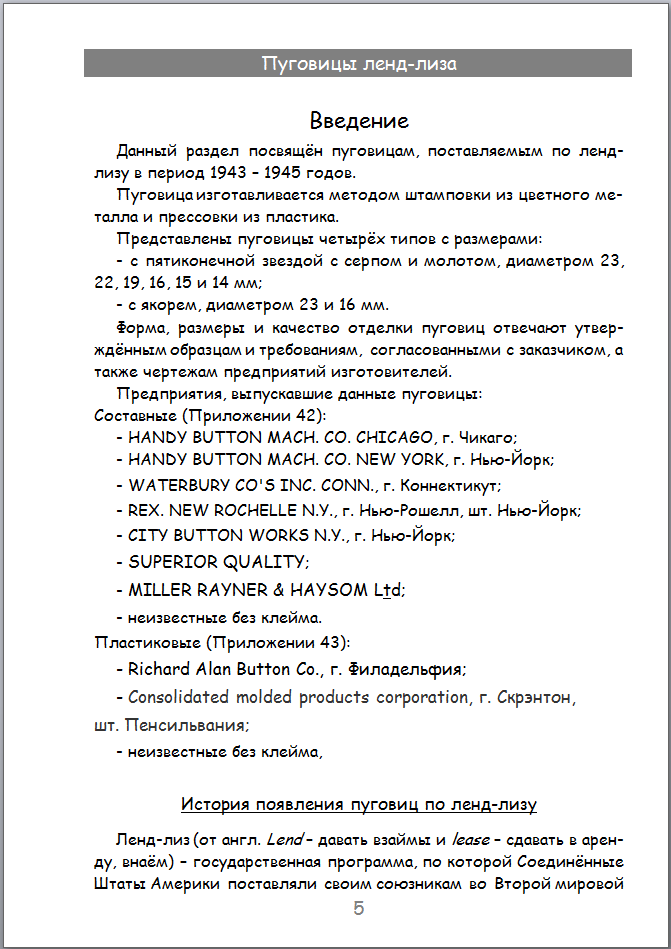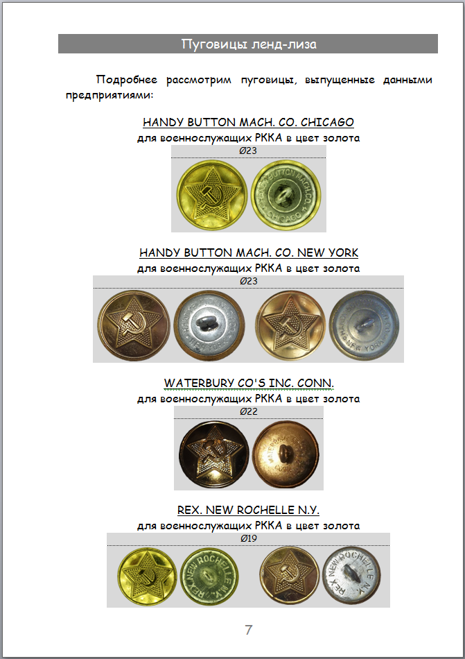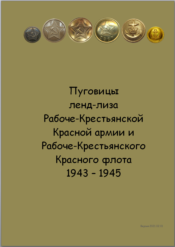 Все страницы Раздела пуговиц ленд-лиза перевёл в PDF. В принципе можно уже раздавать, но решил сделать две версии данного раздела Каталога: первая с двумя приложениями, как сейчас и вторая с тремя приложениями. В третьем приложении хочу сделать попытку показать применяемость пуговиц на военном обмундировании (шинели, гимнастерки, мундиры, кителя и т.д.). Ещё мне не нравится обложка с длинным названием. Может написать "Пуговицы ленд-лиза Красной Армии и Красного Флота 1943-1945"?