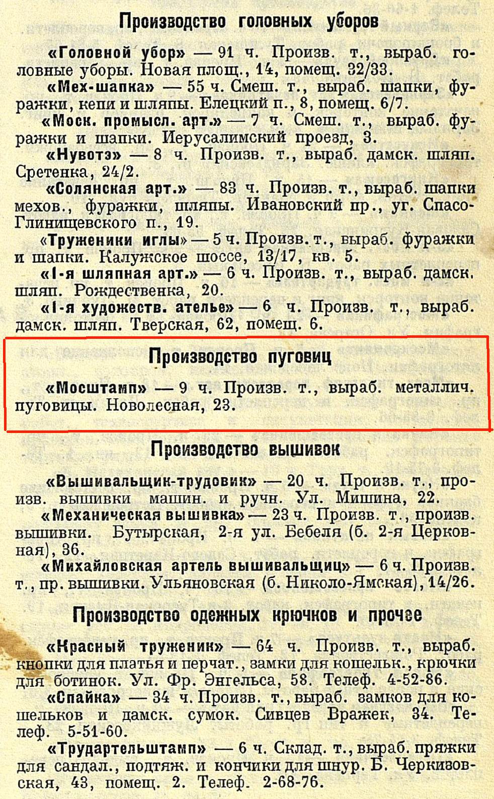 Первое упоминание чего-то с похожим названием, выпускающее пуговицы, встречается в справочнике кустарной промышленности Москвы и Московской губернии за 1928 год.