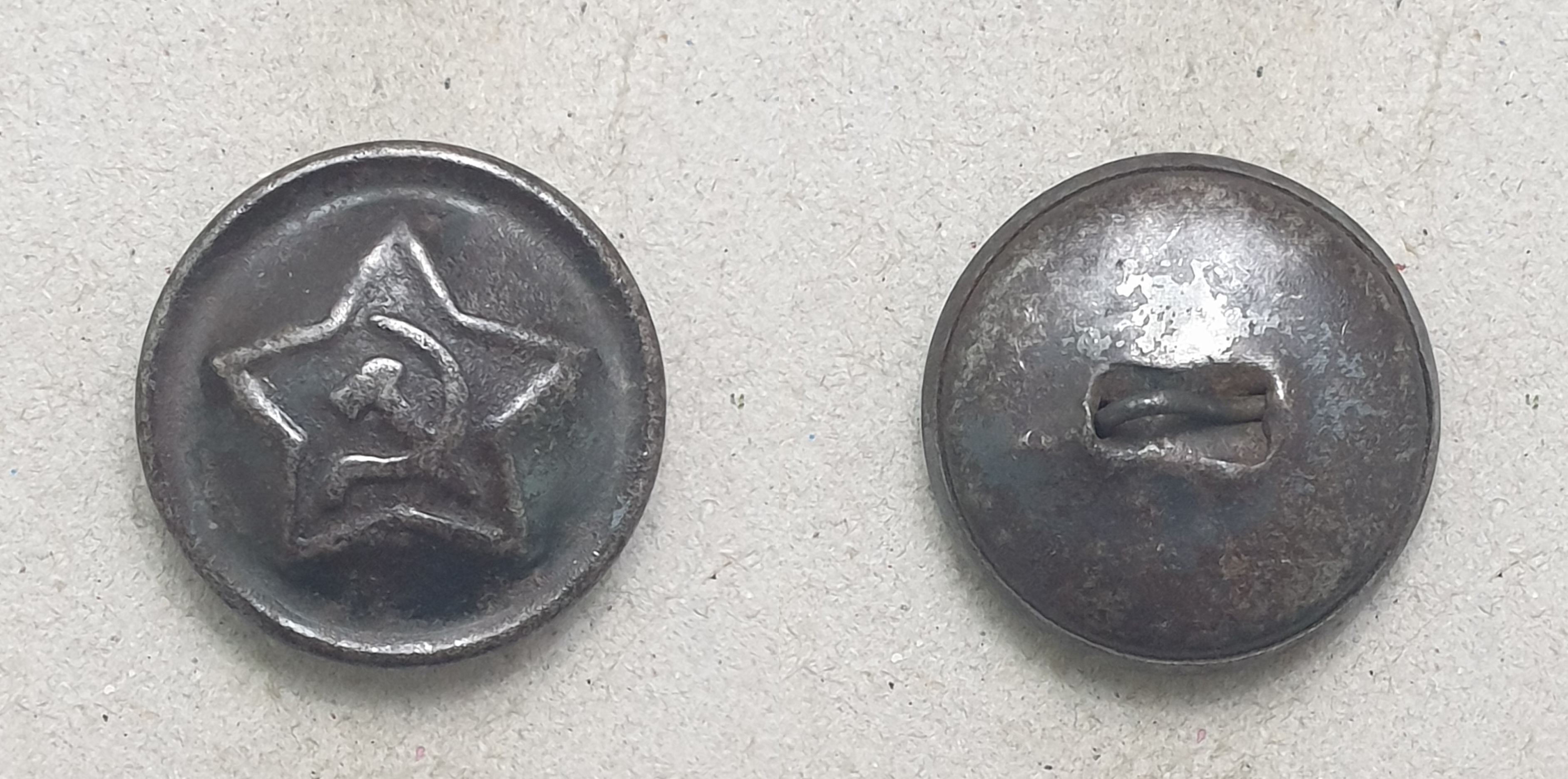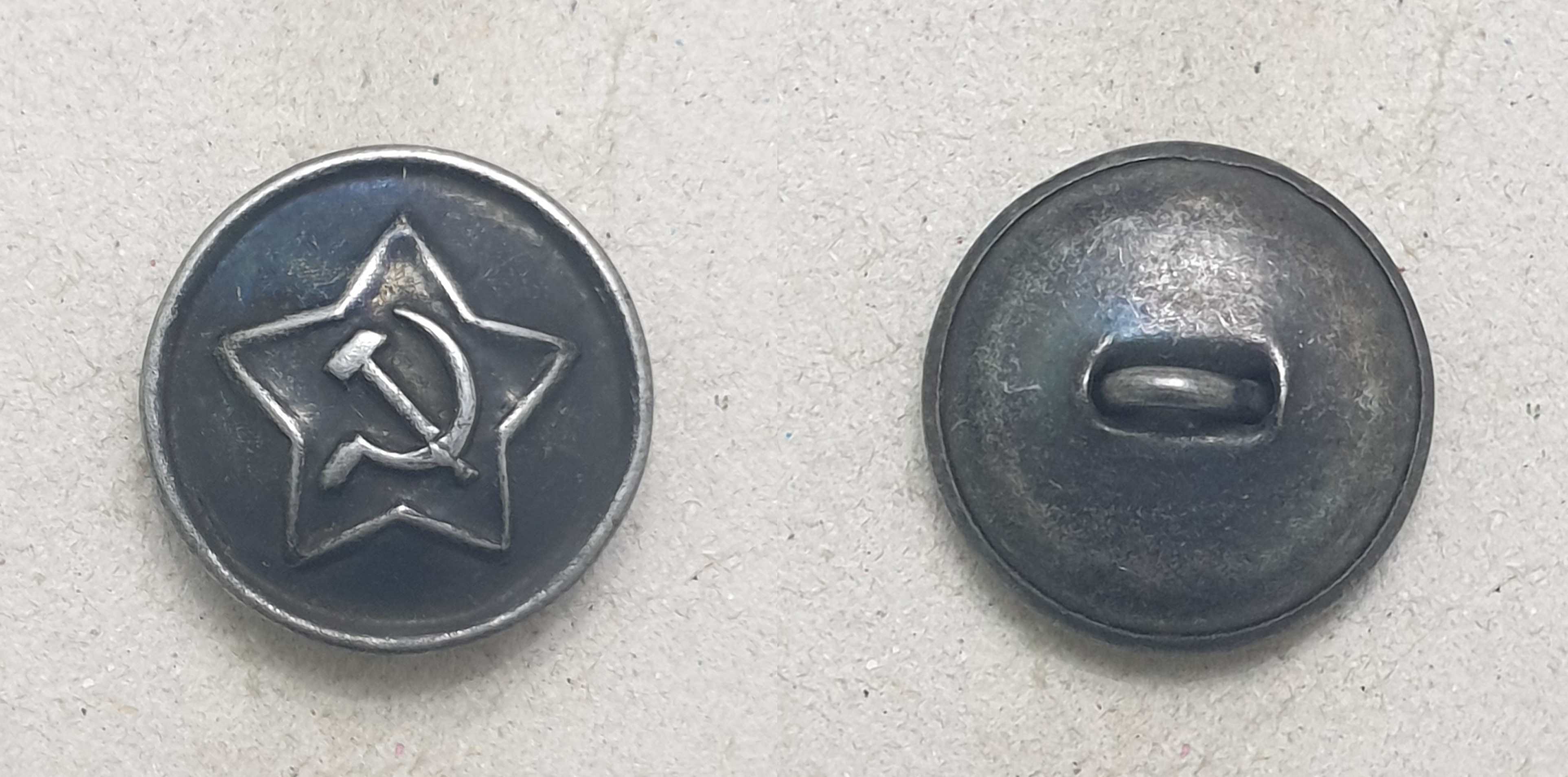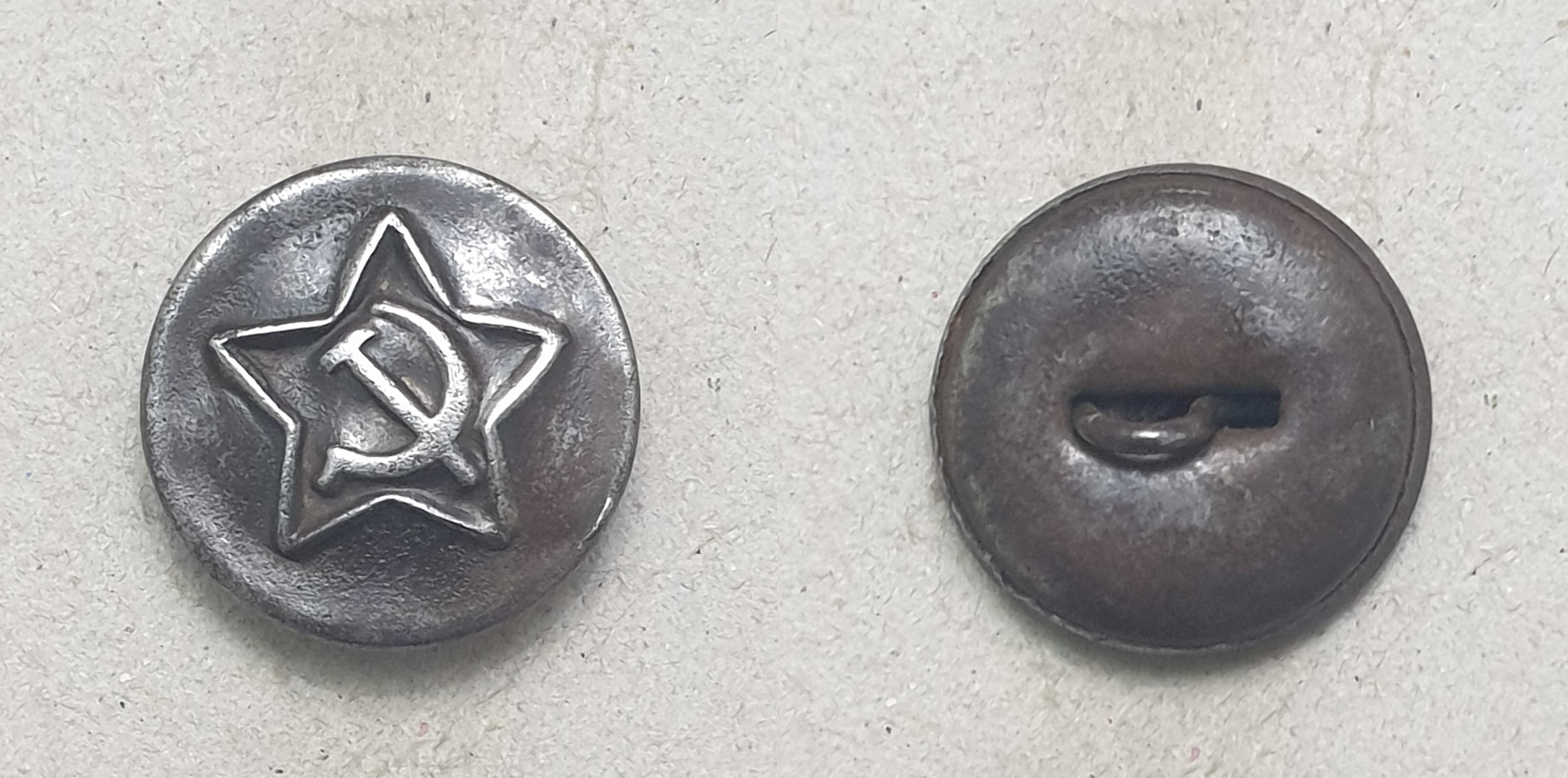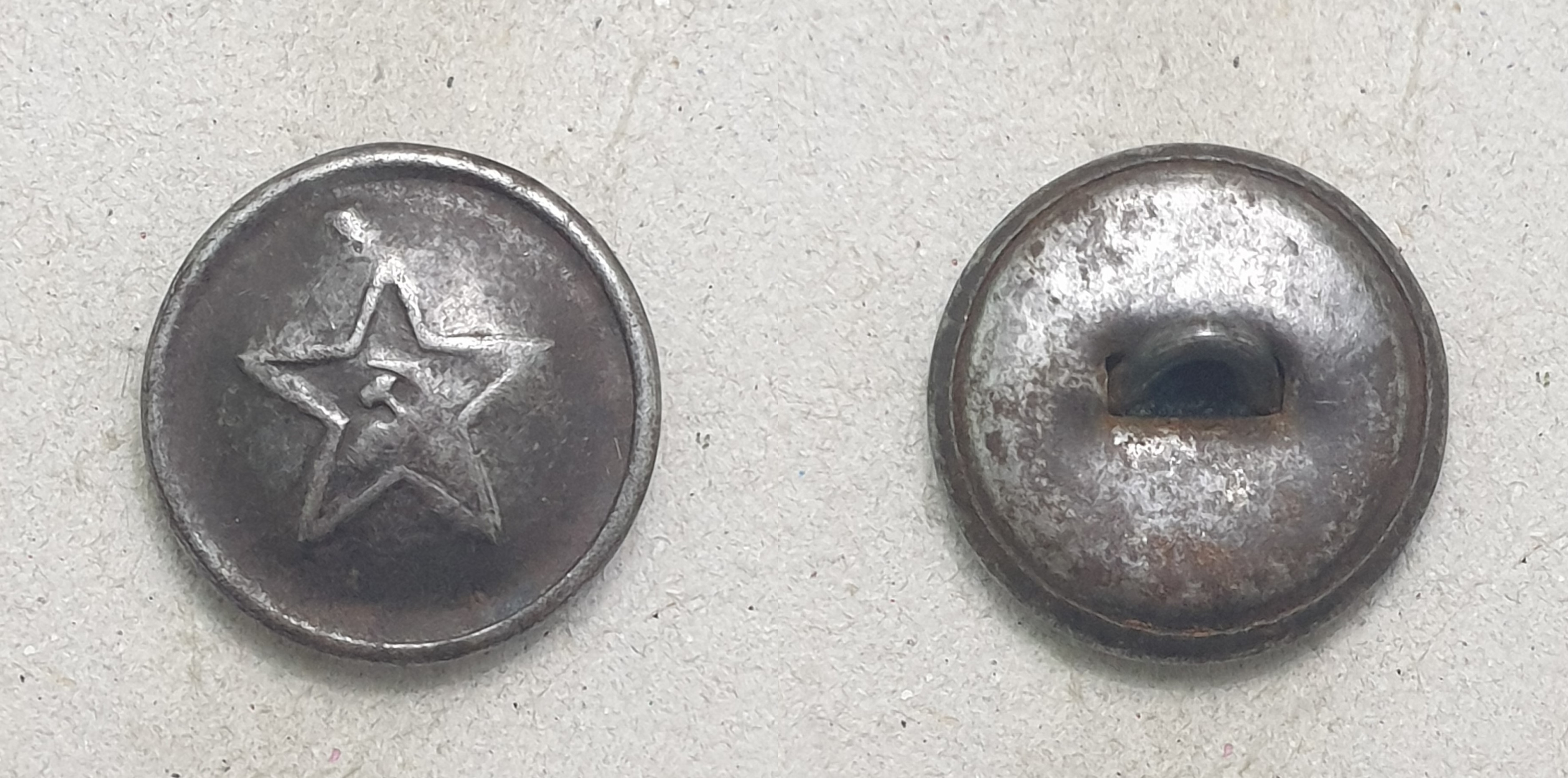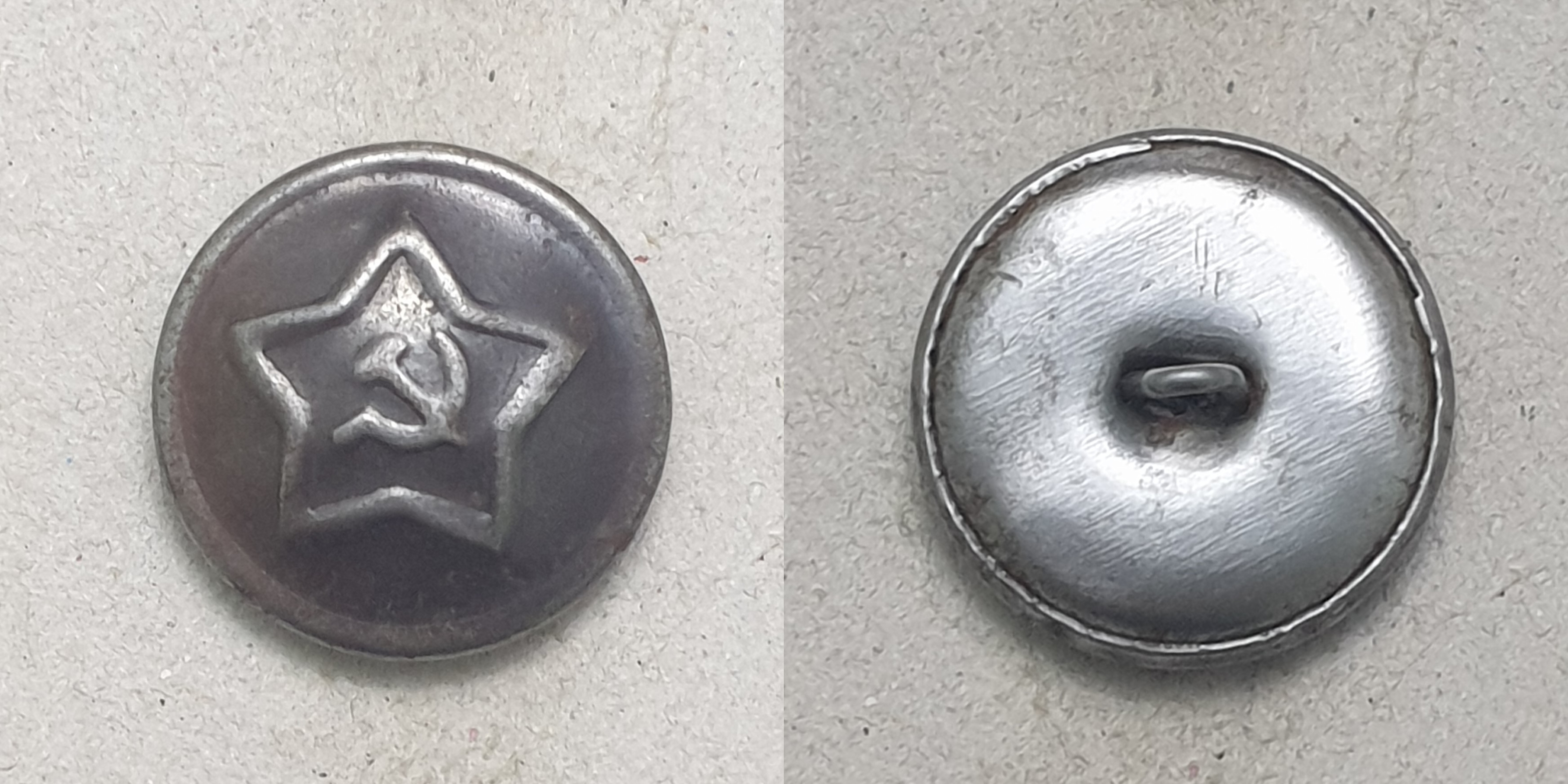 Алексей! Пуговицы разные. Начну с аверса. Штампы разные. При массовом производстве делают несколько штампов. Сами звёзды практически одинаковы, а вот "Серп и Молот" схожи, но расположены по разному. На левой пуговице СиМ выше - кончик серпа на уровне схода лучей. На правой пуговице СиМ ниже - и кончик серпа ниже и рукоятки внизу ниже. С аверсом разобрались. Реверс. На готовом изделии "технологических отверстий" не бывает. Прочина, по моему, почему хотели выпрямить сдавленный аверс. Пуговица действительно сдавлена, встречаются такие. И ещё, присмотритесь к креплению ушек. На левой обычная завальцовка ушка в поддоне. Отверстия немного разбиты, поддон около отверстий помят, значит ушко сгибалась (дополнительный аргумент в пользу сдавливания пуговицы). На правой пуговице видны отверстия в поддоне, но и концы ушка тоже видны. Если бы эту пуговицу в руках подержать (сделать УЗИ ), то можно было определить, как крепится ушко. В общем разные пуговицы, это разновидности. Клейма, вроде, одинаковые, когда буду делать описание, обмерю.