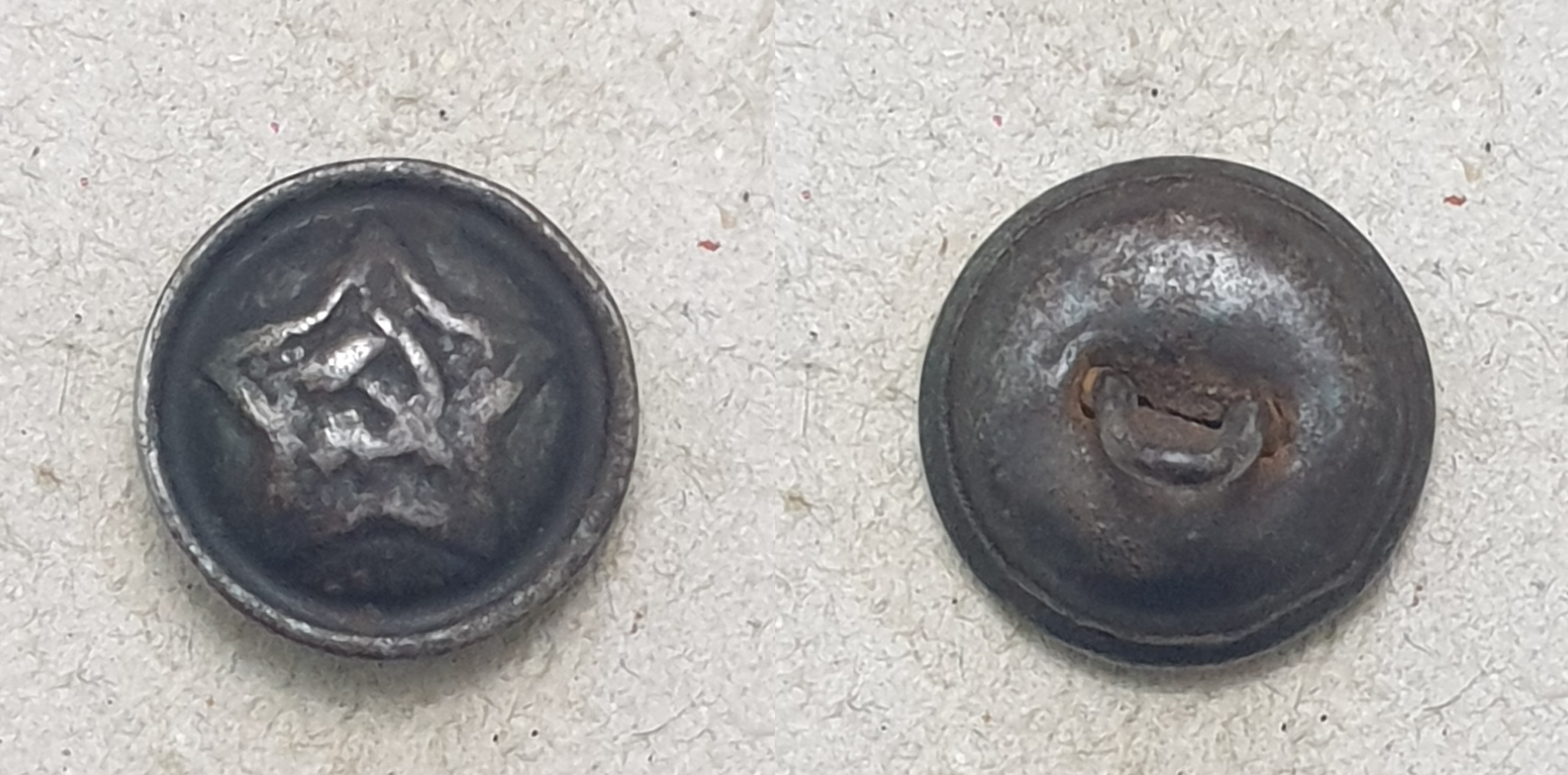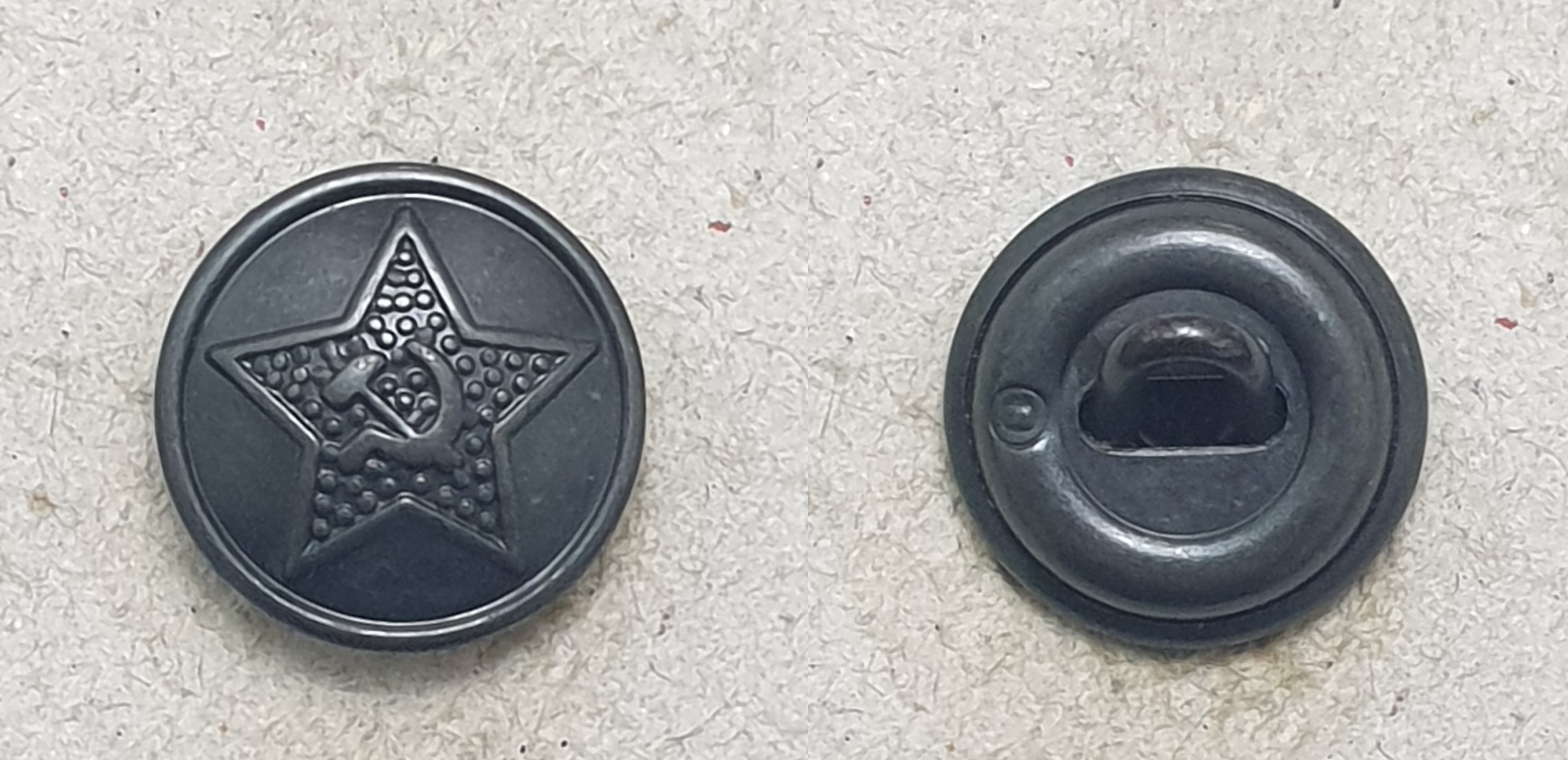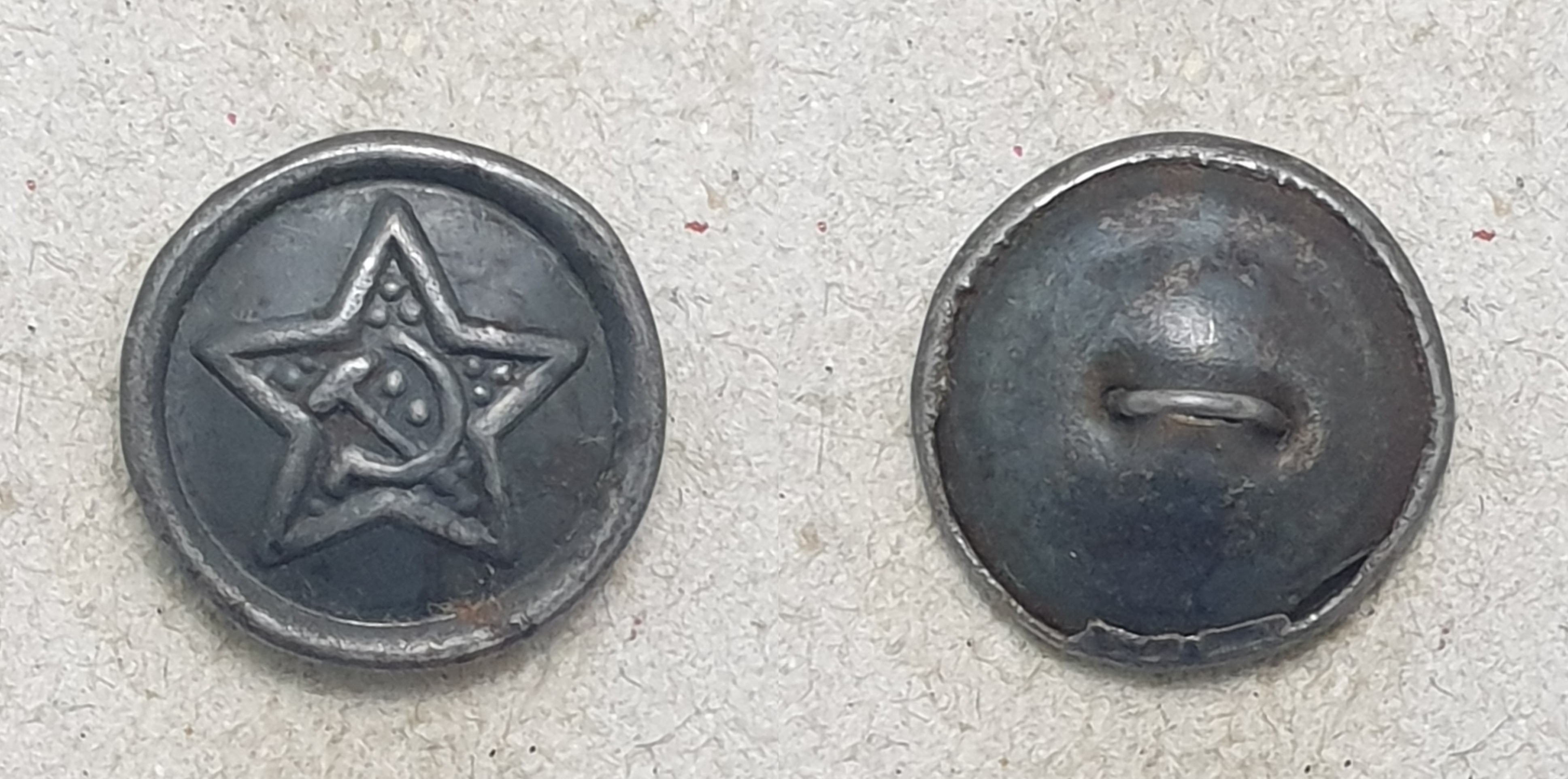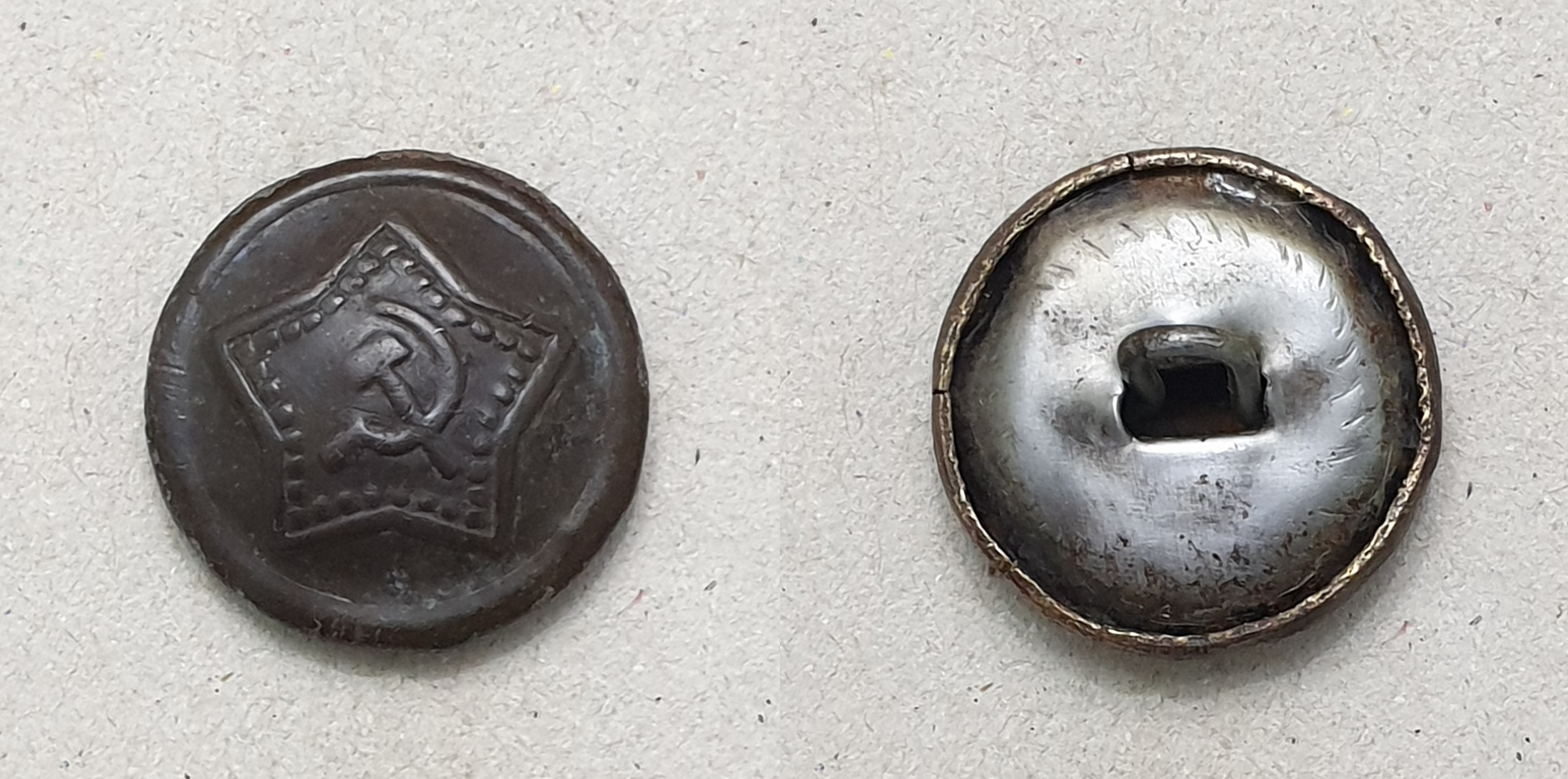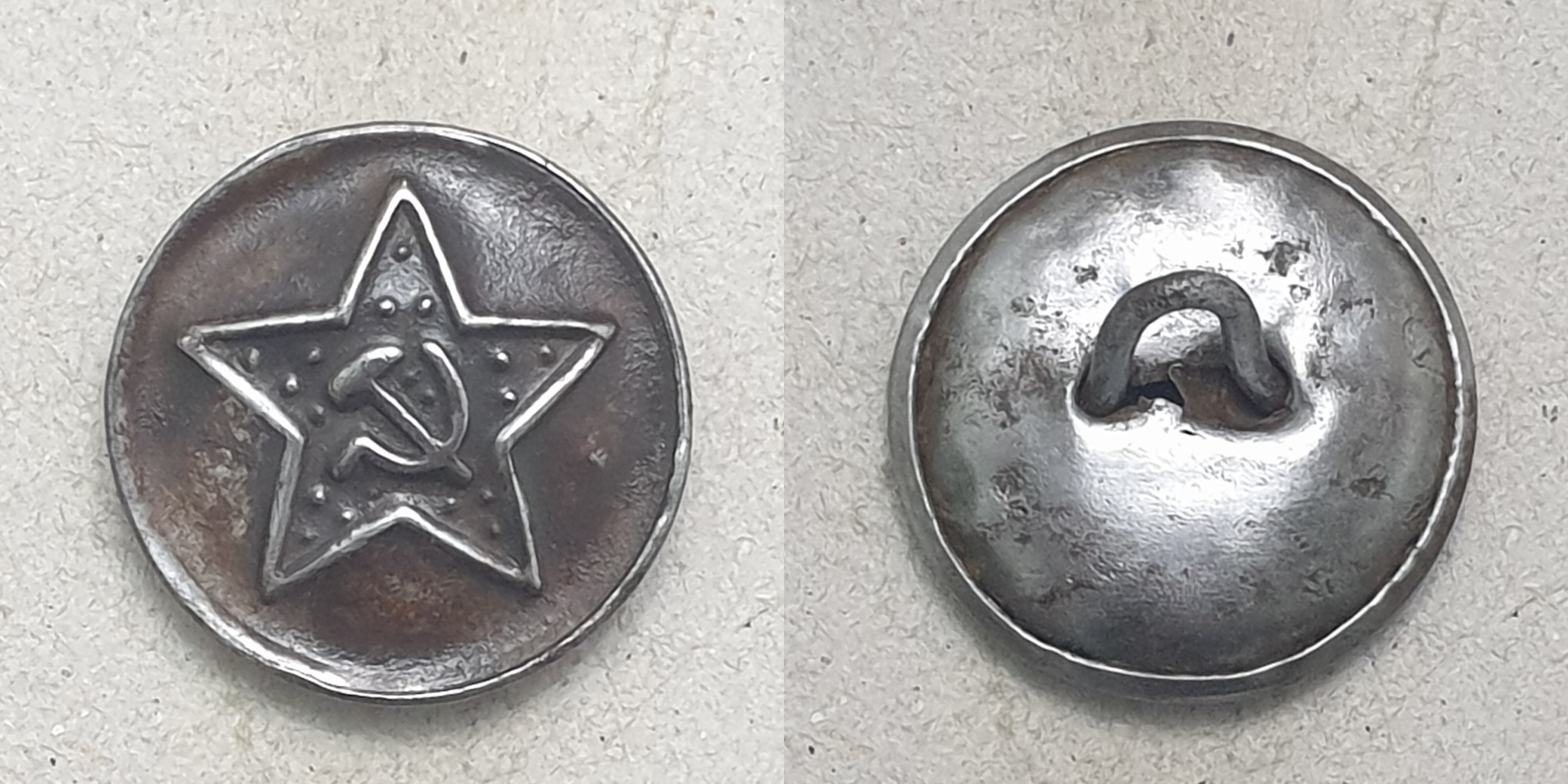 Алексей! Пуговицы разные. Начну с аверса. Штампы разные. При массовом производстве делают несколько штампов. Сами звёзды практически одинаковы, а вот "Серп и Молот" схожи, но расположены по разному. На левой пуговице СиМ выше - кончик серпа на уровне схода лучей. На правой пуговице СиМ ниже - и кончик серпа ниже и рукоятки внизу ниже. С аверсом разобрались. Реверс. На готовом изделии "технологических отверстий" не бывает. Прочина, по моему, почему хотели выпрямить сдавленный аверс. Пуговица действительно сдавлена, встречаются такие. И ещё, присмотритесь к креплению ушек. На левой обычная завальцовка ушка в поддоне. Отверстия немного разбиты, поддон около отверстий помят, значит ушко сгибалась (дополнительный аргумент в пользу сдавливания пуговицы). На правой пуговице видны отверстия в поддоне, но и концы ушка тоже видны. Если бы эту пуговицу в руках подержать (сделать УЗИ ), то можно было определить, как крепится ушко. В общем разные пуговицы, это разновидности. Клейма, вроде, одинаковые, когда буду делать описание, обмерю.