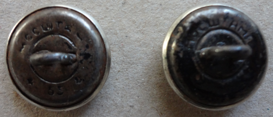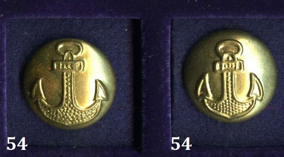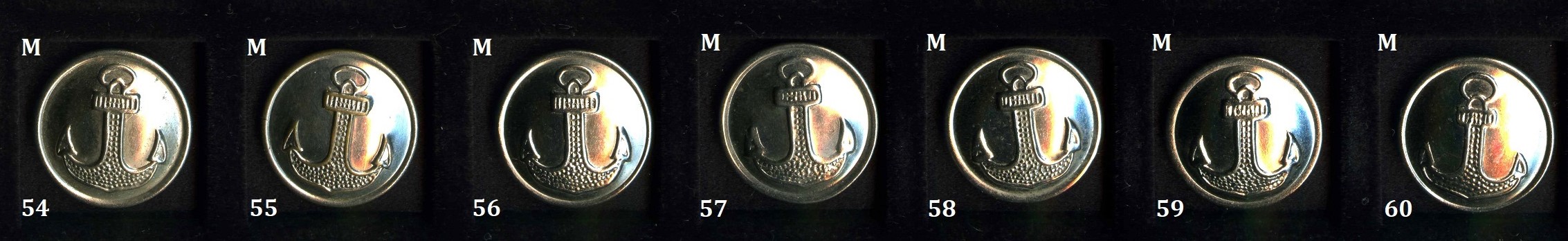 Алексей! К сожалению коллега не дал основные параметры пуговиц. Было немного затруднительно с определением принадлежности. Это латунные пуговицы белого приборного цвета с якорем диаметром 22 мм, соответственно производства завода МОСШТАМП. Стальных с якорем 22 мм не было, алюминиевые выпускались после 61 года. Соответственно эти пуговицы латунные. В 1961 (последняя латунная пуговица) якорь совсем другой. А вот у латунной 1953 года верхняя часть веретена, действительно, чуть меньше других годов, начиная с 1954 года. У левой (показанной коллегой) пуговицы год читается 1955-й, у правой не видно.