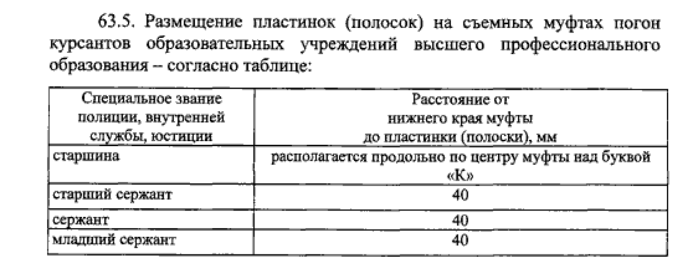 на погонах старшего сержанта, сержанта, младшего сержанта - на расстоянии 40 мм от нижнего края до первой поперечной нашивки (металлической пластинки); последующие поперечные нашивки (металлические пластинки) на погонах сержантов и младших сержантов - выше первой с промежутками между ними 2 мм; на поле погон старшин посередине - продольная полоса золотистого цвета, а на вшитых погонах старшины - посередине погона металлическая пластинка длиной 45 мм на расстоянии 10 мм от нижнего края погон до нижнего края металлической пластинки."