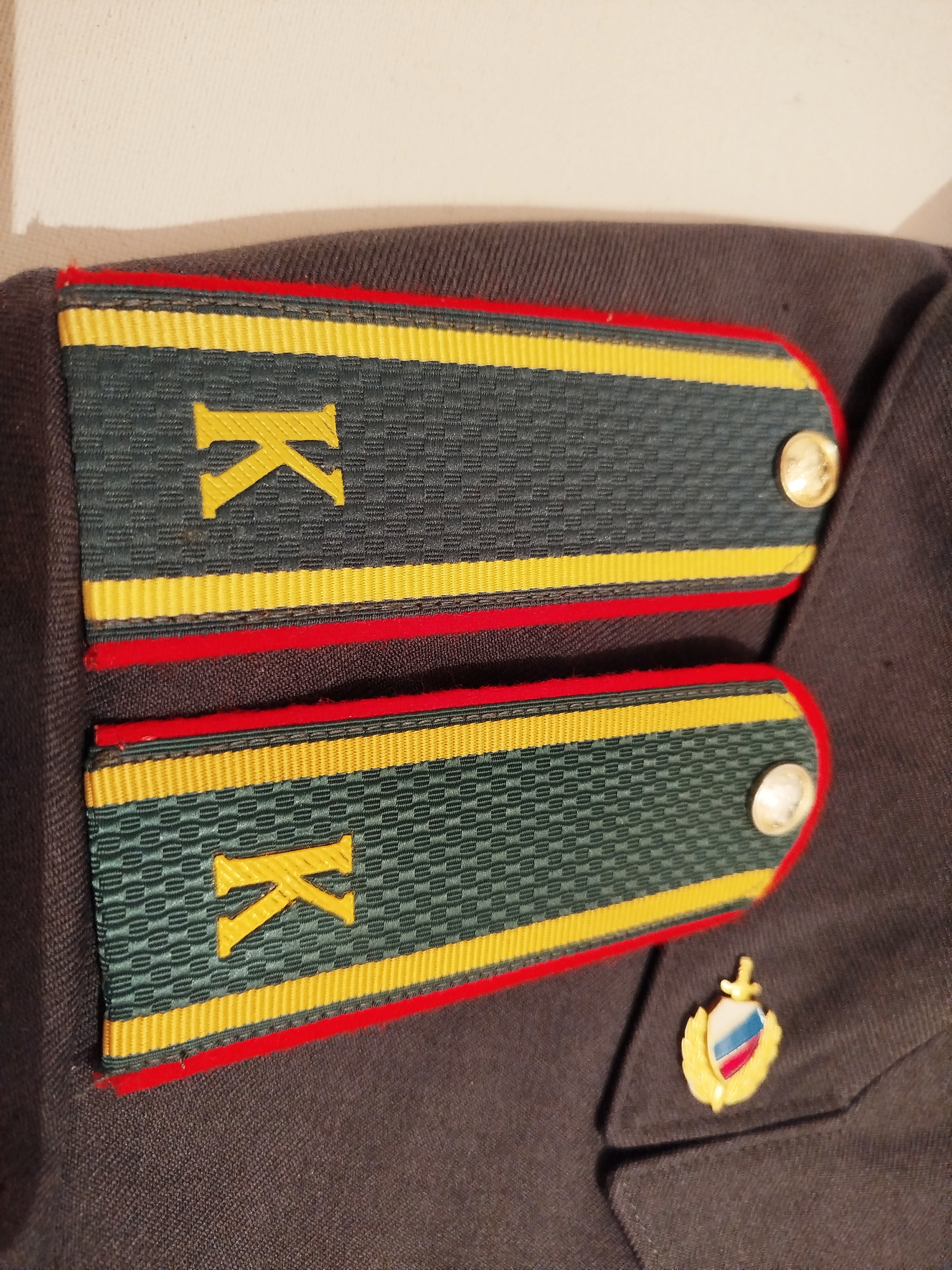 на кителе (жакете) выходном при выходной форме одежды, на кителе (жакете) при повседневной форме одежды - нашивные погоны с полем из галуна специального переплетения темно-синего цвета, с продольными полосами золотистого цвета по боковым сторонам погона, с кантами красного цвета и металлической или из поливинилхлоридной пленки буквой "К" золотистого цвета (до дня присвоения первого специального звания среднего начальствующего состава);"