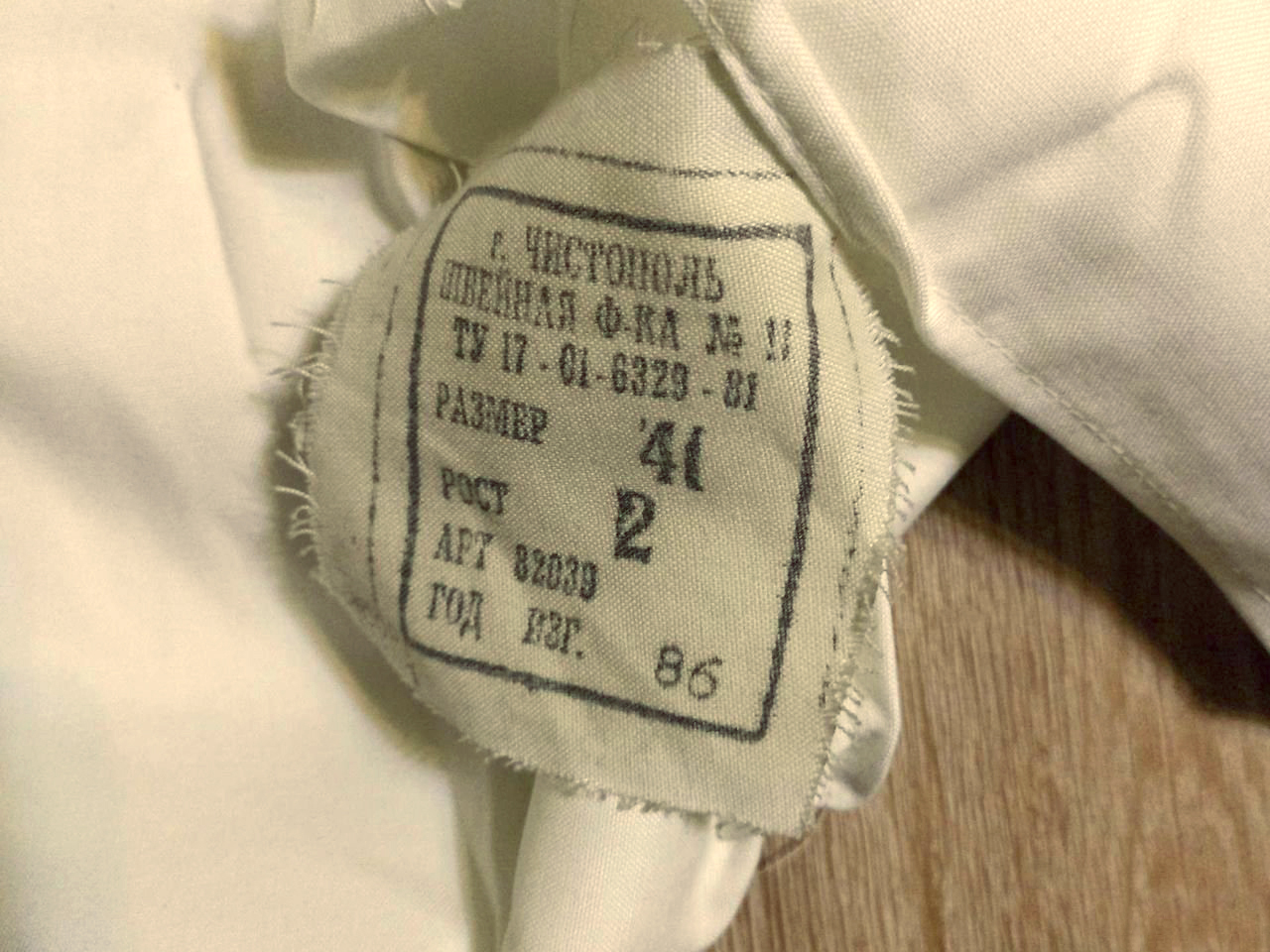 Владелец рубашки закончил службу в ВС СССР в 1986 году и получить такую не успел. Мог, в принципе, позже купить в Военторге, но отпарывать карманы не имело смысла. Всё же, этот вариант был уточнён. Карманов на рубашке не было.