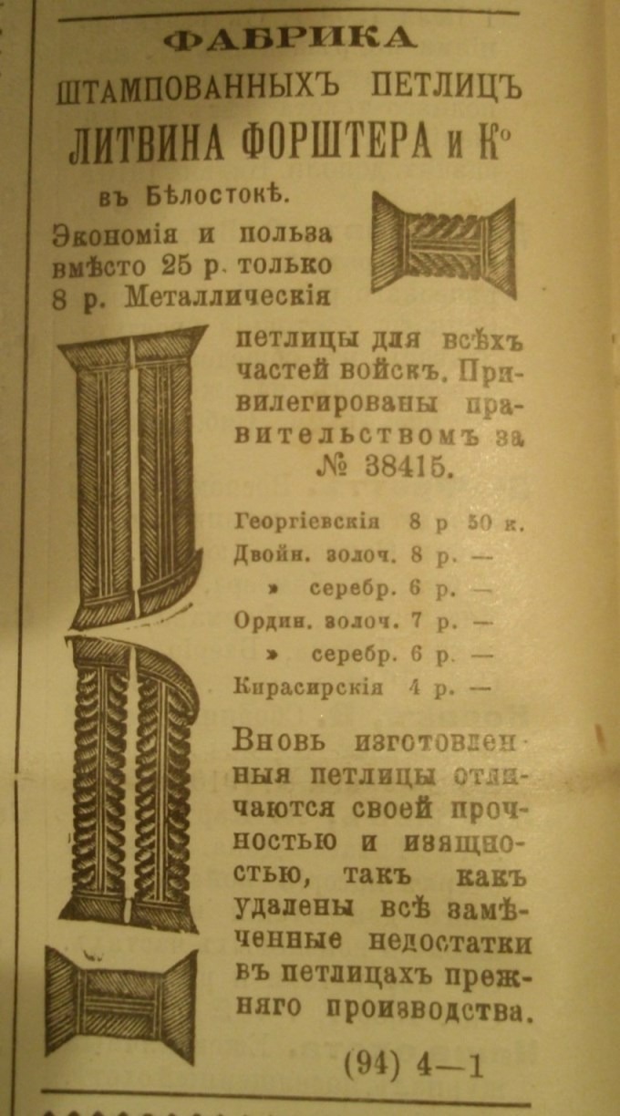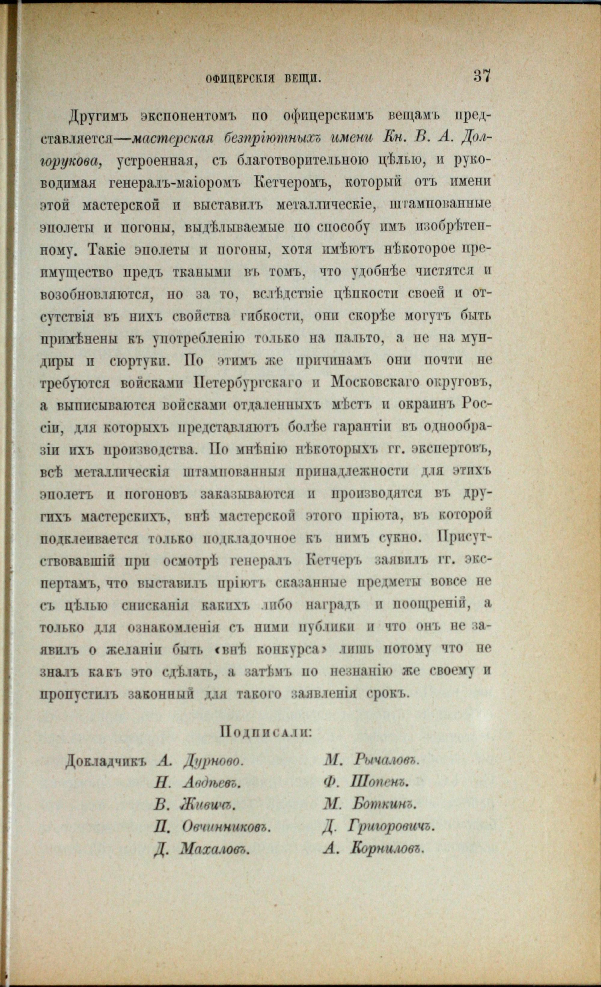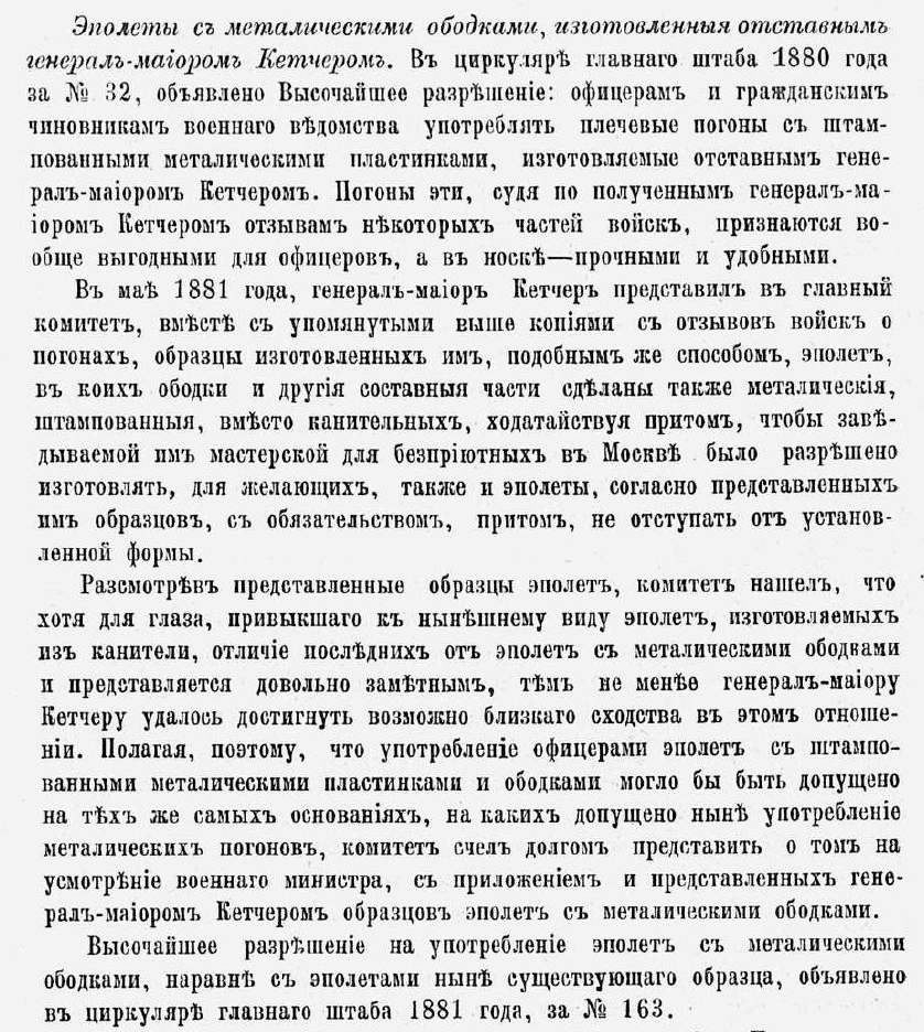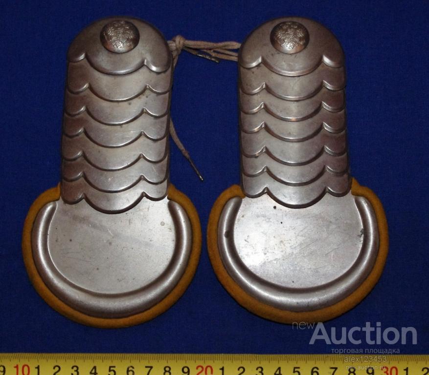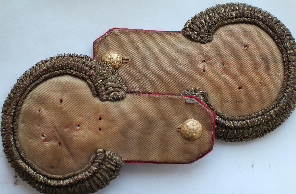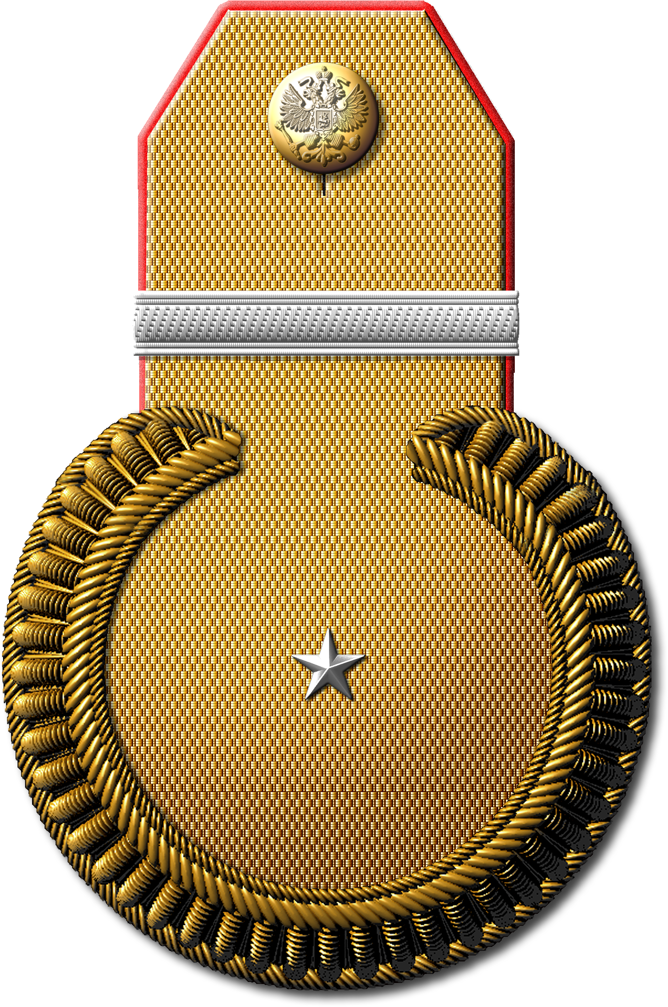 В 1805 г. для офицеров всех родов оружия были введены эполеты, просуществовавшие как принадлежность офицерского мундира вплоть до 1917 г. Уже тогда отличием офицеров Гвардии было поле эполет, изготавливавшееся не из сукна, а из парчи особого рисунка, сотканной на золотой или серебряной нити. В 1829 г. к трем валикам (плетешкам), окружавшим круглое поле, был добавлен четвертый, а корешок стал изготавливаться на проволочном каркасе, после чего эполеты окончательно приняли тот же вид, что и в последнее царствование. Отсутствие звездочек и бахромы указывает на чин капитана. Алый суконный подбой был присвоен большинству частей гвардейской пехоты и артиллерии. Кроме того, подобные эполеты могли носить также состоящие по роду оружия, т.е. находящиеся на действительной службе, но не занимающие никакой строевой должности.