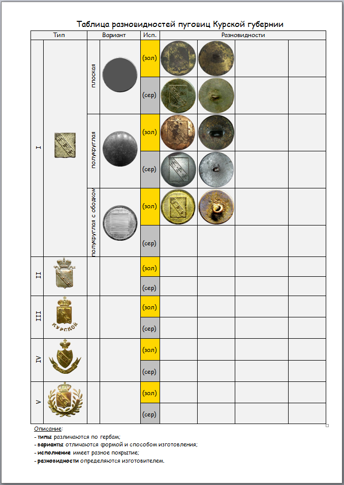 Прежде, чем продолжить каталог пуговиц Уфимской губернии, хотелось бы обсудить типы, варианты, исполнения и разновидности. Начну с типов пуговиц. Моим критерием (сугубо личным) являются разные гербы. На примере пуговиц Курской губернии покажу 5 типов. Возможно у кого-то будут возражения, давайте обсудим. Изображение представленных пуговиц взяты из Интернета и в частности с сайта pugoviza.ru. Пока мной рассмотрены пуговицы I типа.