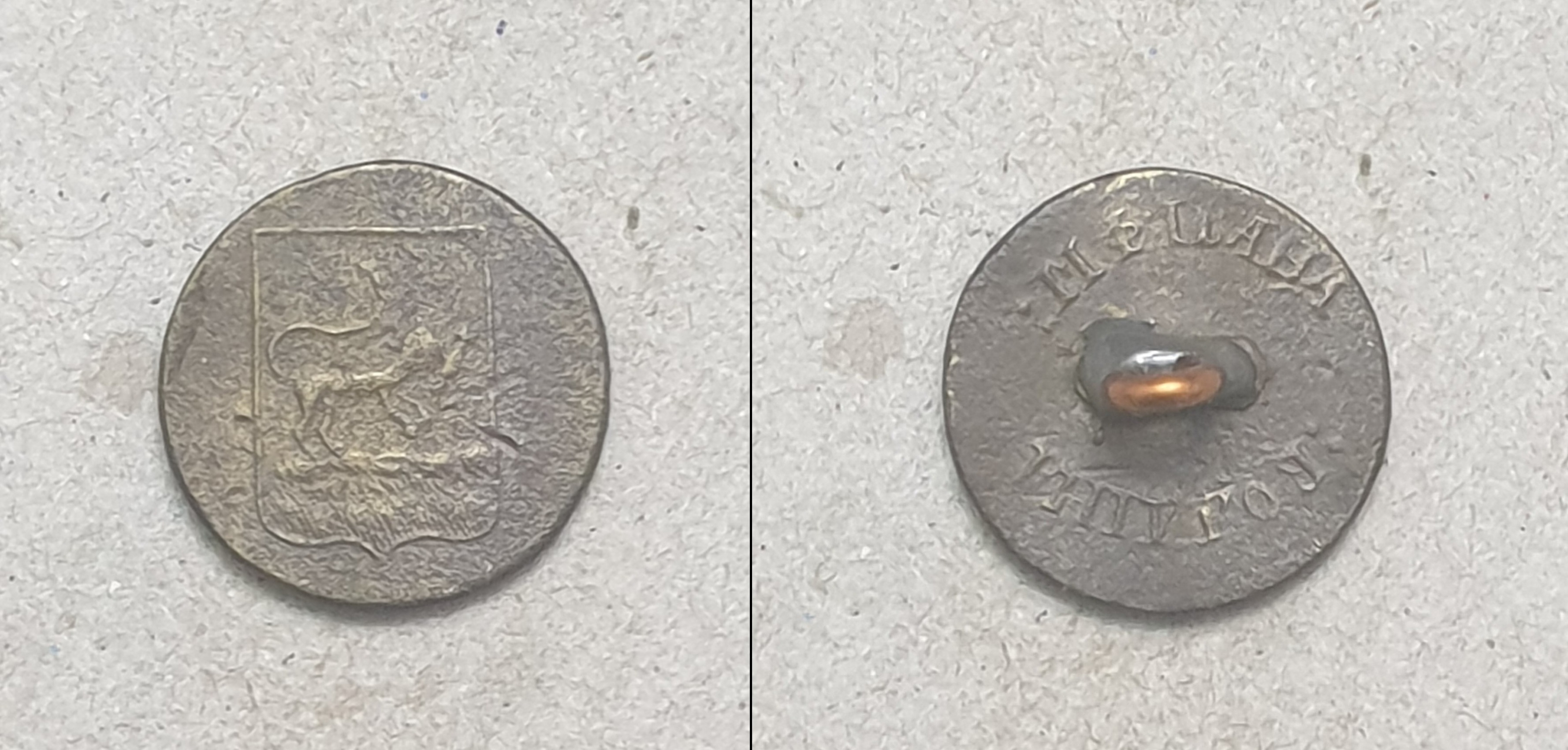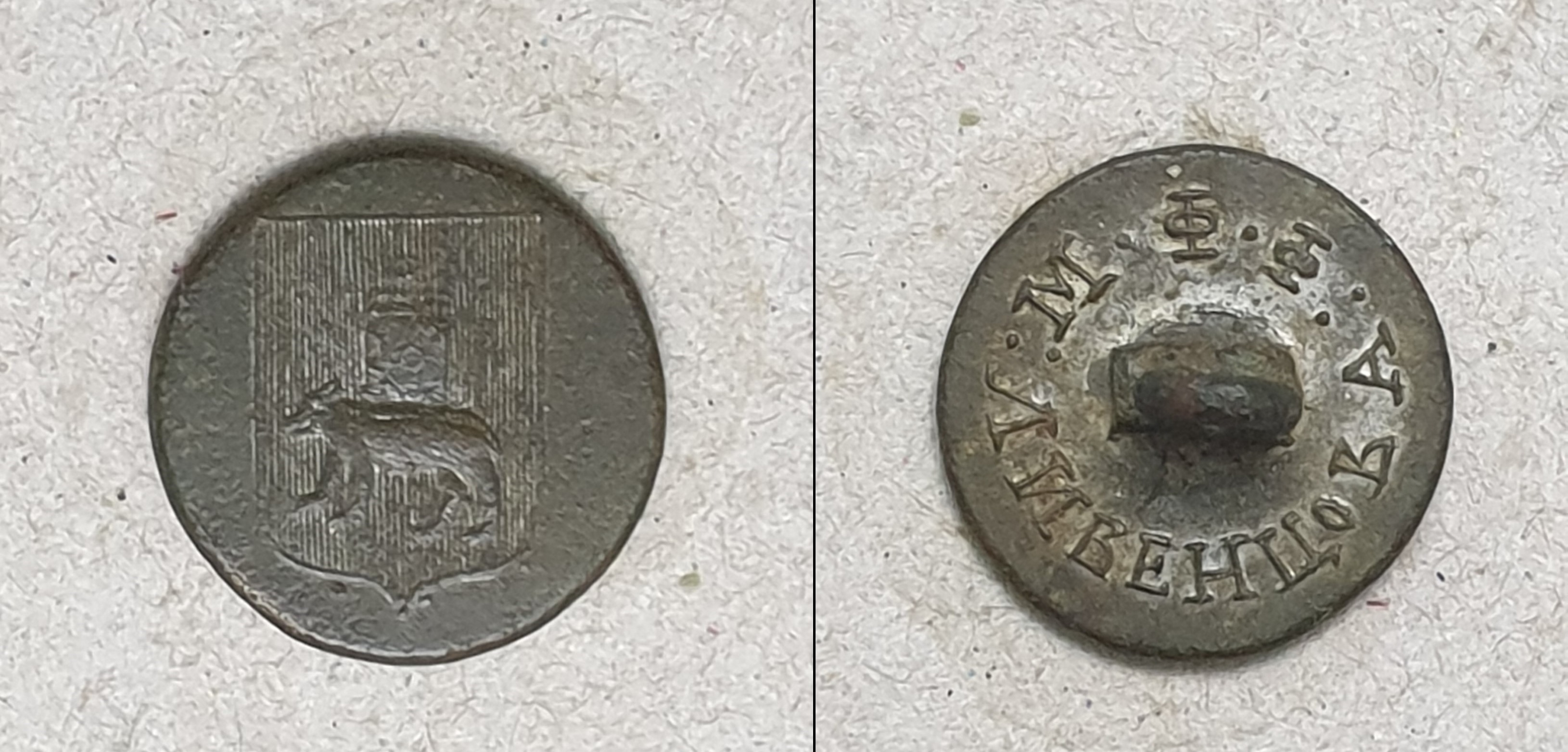 Ещё по одной пуговице (большой) непонятные буквы в клейме, Могилевской губернии. Похоже на Н. Е.