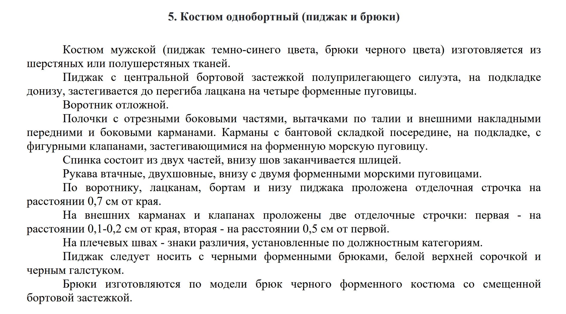 8. Пиджак повседневный для высшего и старшего начальствующего состава (модель N 682). Из шерстяной ткани темно-синего цвета, полуприлегающей формы, однобортный, с застежкой на четыре форменные пуговицы до перегиба лацкана, воротник и лацканы отложные, рукава втачные двухшовные с обшлагом на верхней половинке. Средний шов спинки заканчивается шлицей, полочки с отрезными бочками и передней вытачкой по талии, верхними и боковыми накладными карманами с клапанами. Карманы со встречной складкой, клапаны пристегиваются на одну пуговицу. По воротнику, бортам, лацканам, карманам, клапанам, низу пиджака, шву обшлага проложена отделочная строчка на расстоянии 0,2 см от края. На плечевых швах расположены шлевки для крепления наплечных знаков различия.