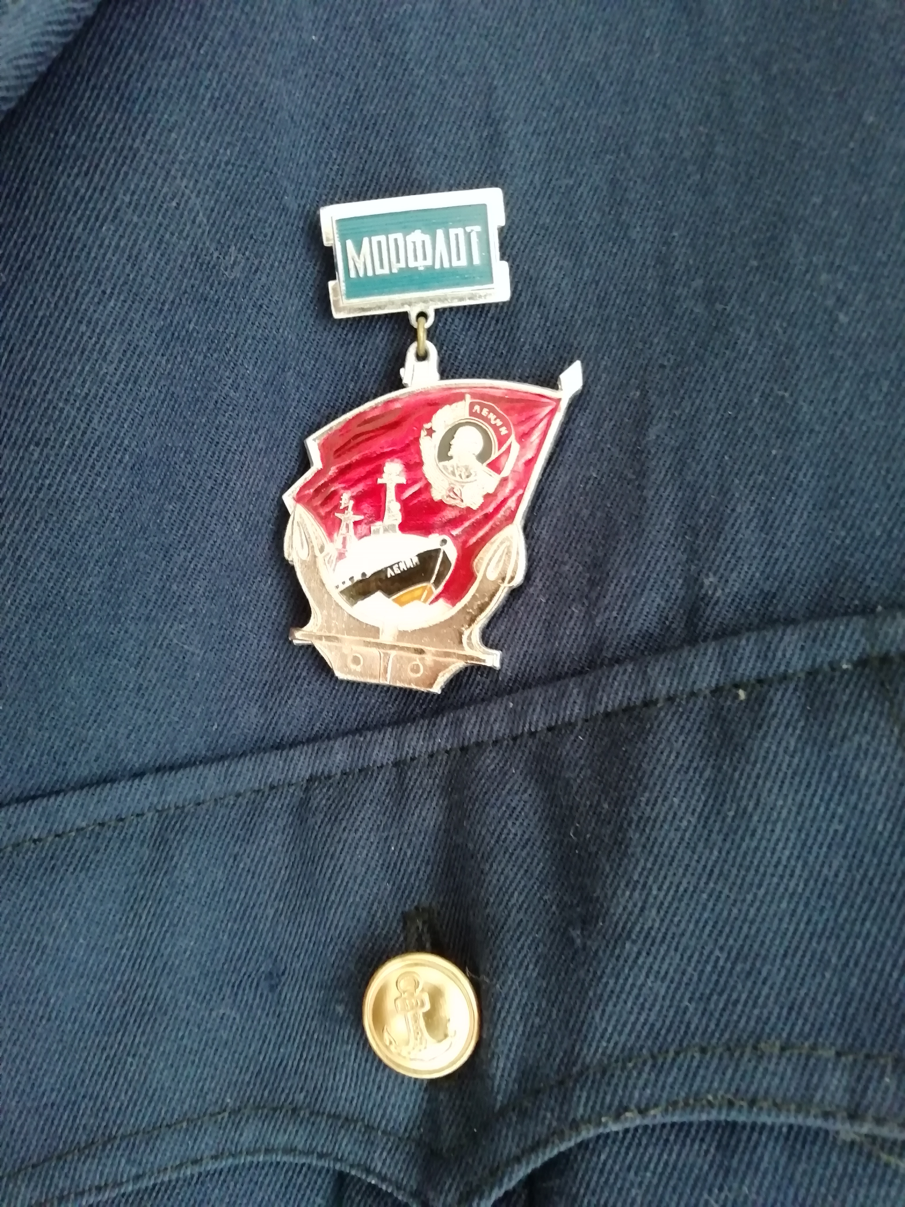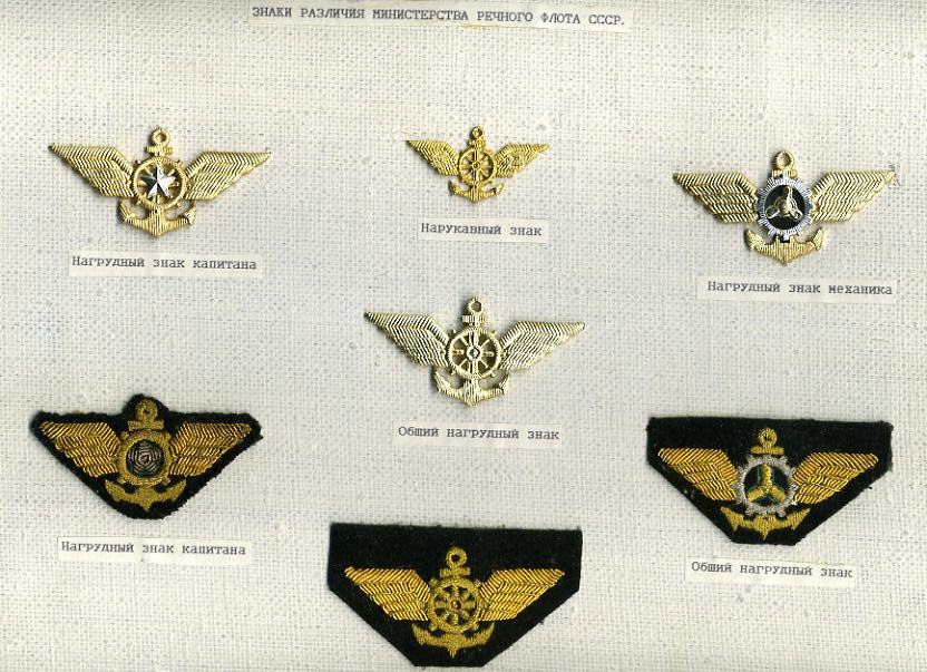 Под нагрудной эмблемой на одном уровне на правой стороне груди носятся значок "Отличник социалистического соревнования " и знаки об окончании высшего или среднего учебного заведения. Под ними располагаются нагрудные знаки капитана дальнего плавания и судового механика первого разряда.