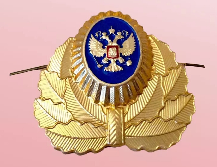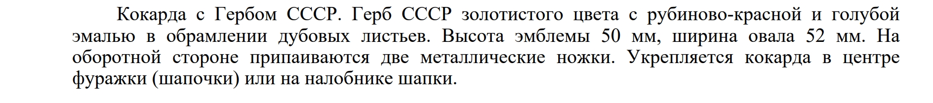 "Кокарда с Государственным гербом Российской Федерации. Государственный герб Российской Федерации золотистого цвета с рубиново-красной или голубой эмалью в обрамлении дубовых листьев. Высота эмблемы - 50 мм, ширина овала - 52 мм. На оборотной стороне привариваются две металлические ножки. Укрепляется кокарда в центре фуражки (шапочки) или на налобнике шапки."