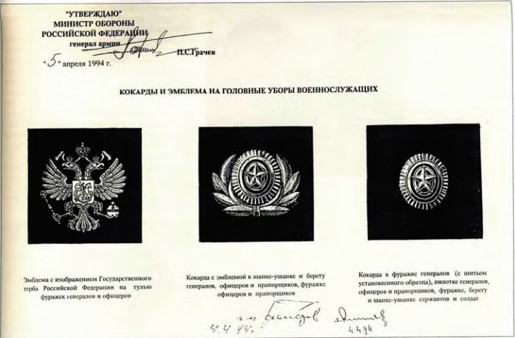 В 1993 г был утверждён Герб России ( кокарда ВС и эмблема на тулью были утверждены Грачёвым 5 апреля 1994 г). Герб РФ был утверждён за месяц до нового 1994 года Указом Президента Российской Федерации от 30.11.1993 г. № 2050