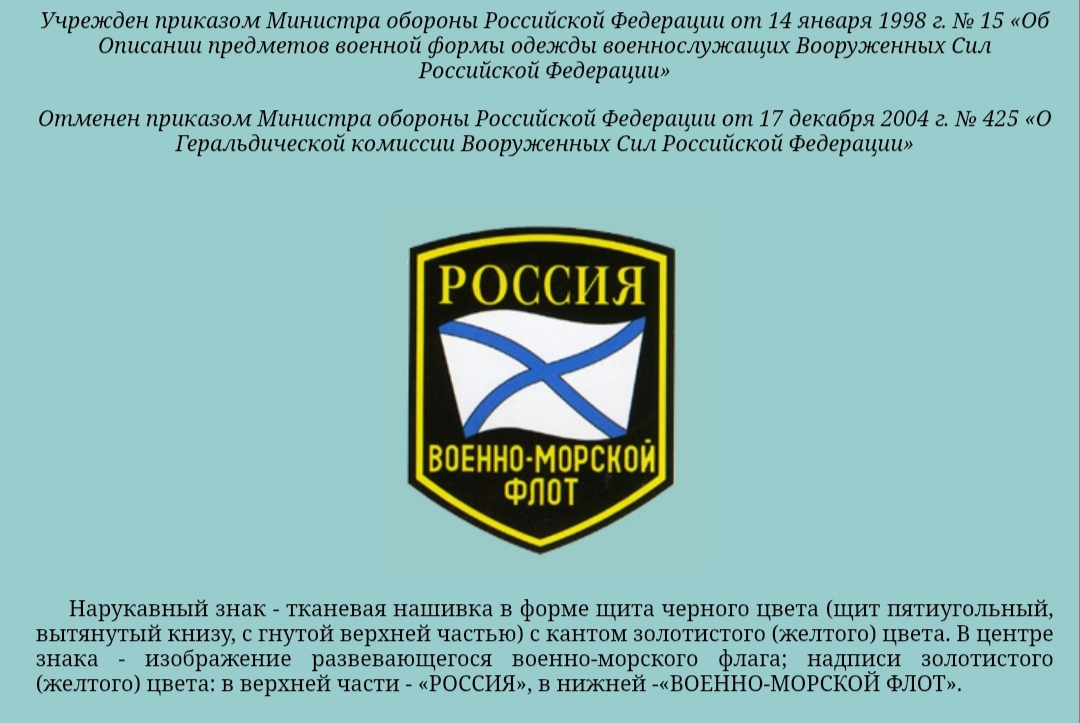 Коллеги, кто-нибудь знает, когда был отменен знак принадлежности к ВМФ РФ образца 1998 года для ношения на правом рукаве?