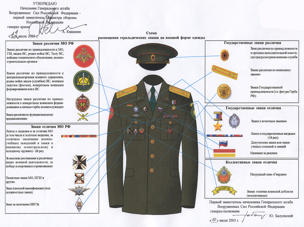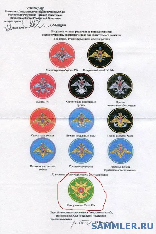 И в качестве примера. Генерал-полковник Зарицкий В.Н. в декабре 2003 года во время посещения Казанского филиала ВАУ дал указание о ношении нарукавных знаков для подчиненных ему частей и учреждений, которые не имеют своих знаков различия по принадлежности: на левом рукаве - знак различия по принадлежности к Ракетным войскам и артиллерии Вооруженных Сил Российской Федерации; на правом - знак различия по принадлежности к Сухопутным войскам.