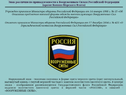 Спасибо! Интересный плакат. Из этой серии есть еще плакат о нарукавных знаках. Внизу обведен знак по принадлежности к вооруженным силам РФ для пришивания на левый рукав. Он существовал в реальности?