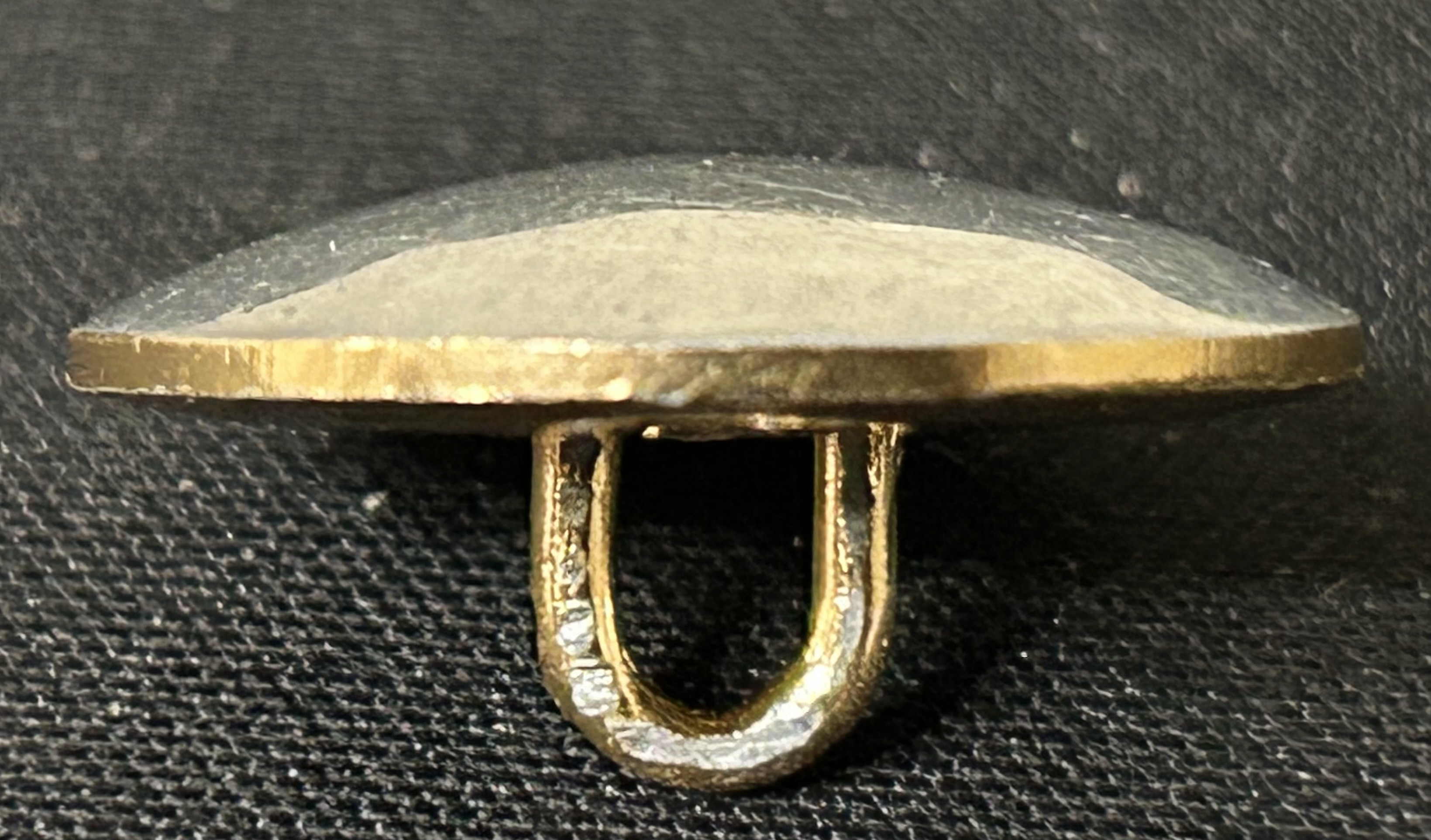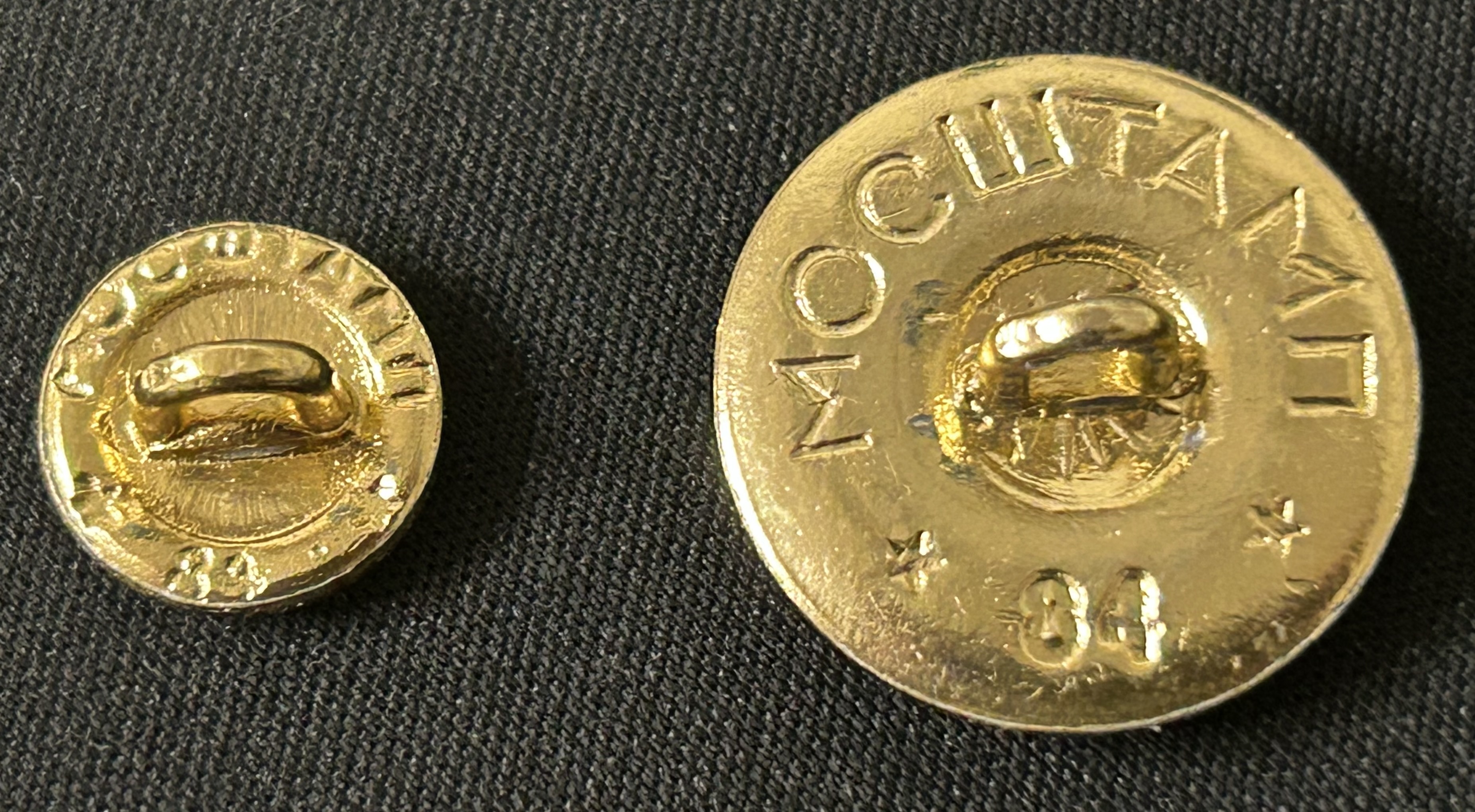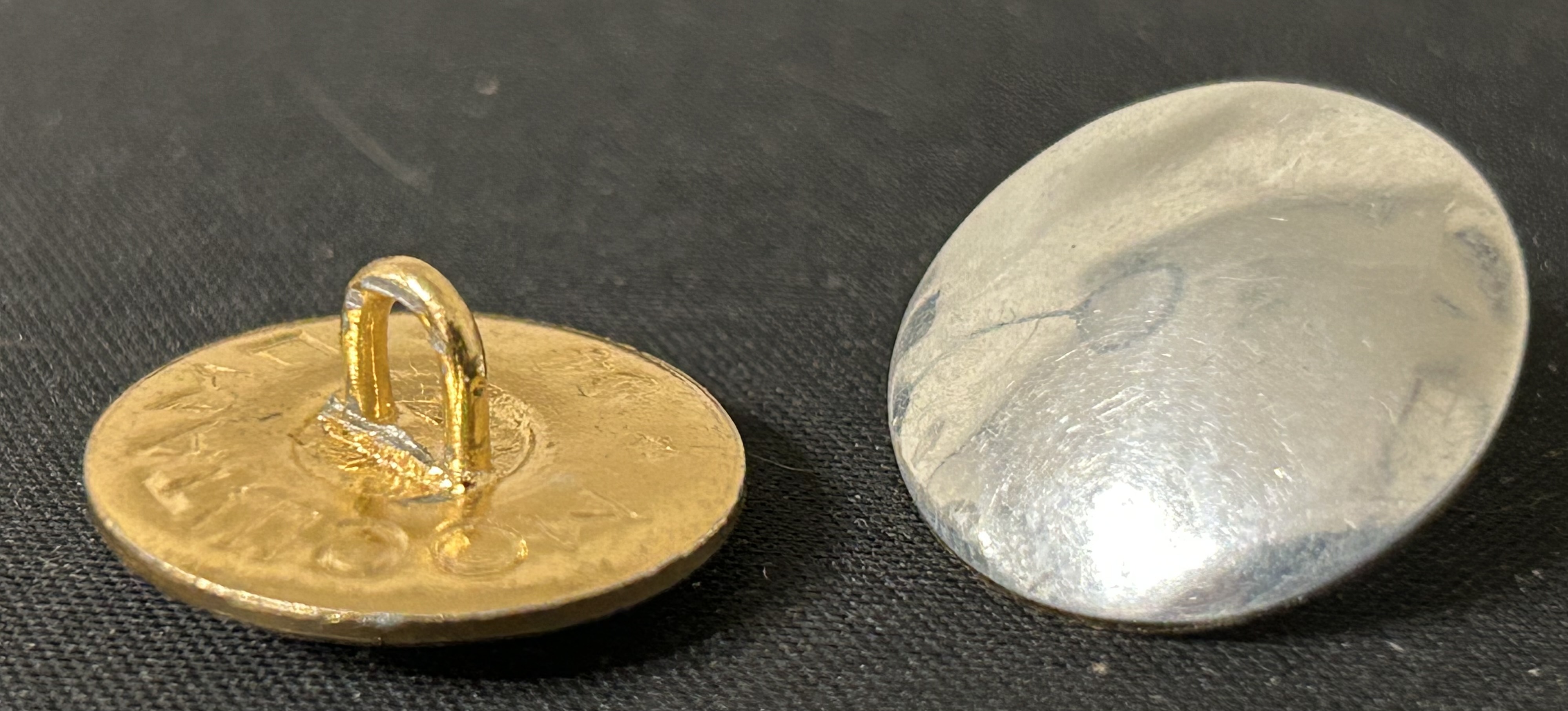 Интересно каким способом нанесено серебрение. В гальваническую ванну предметы помещают целиком. Изначально эти пуговицы были белыми (алюминий), Затем они попали на золочение, а уже потом на лицевую сторону нанесено серебрение. Очень странная технология. На малой немного просматривается буртик- но это может быть банальный брак - сдвиг при чеканке.