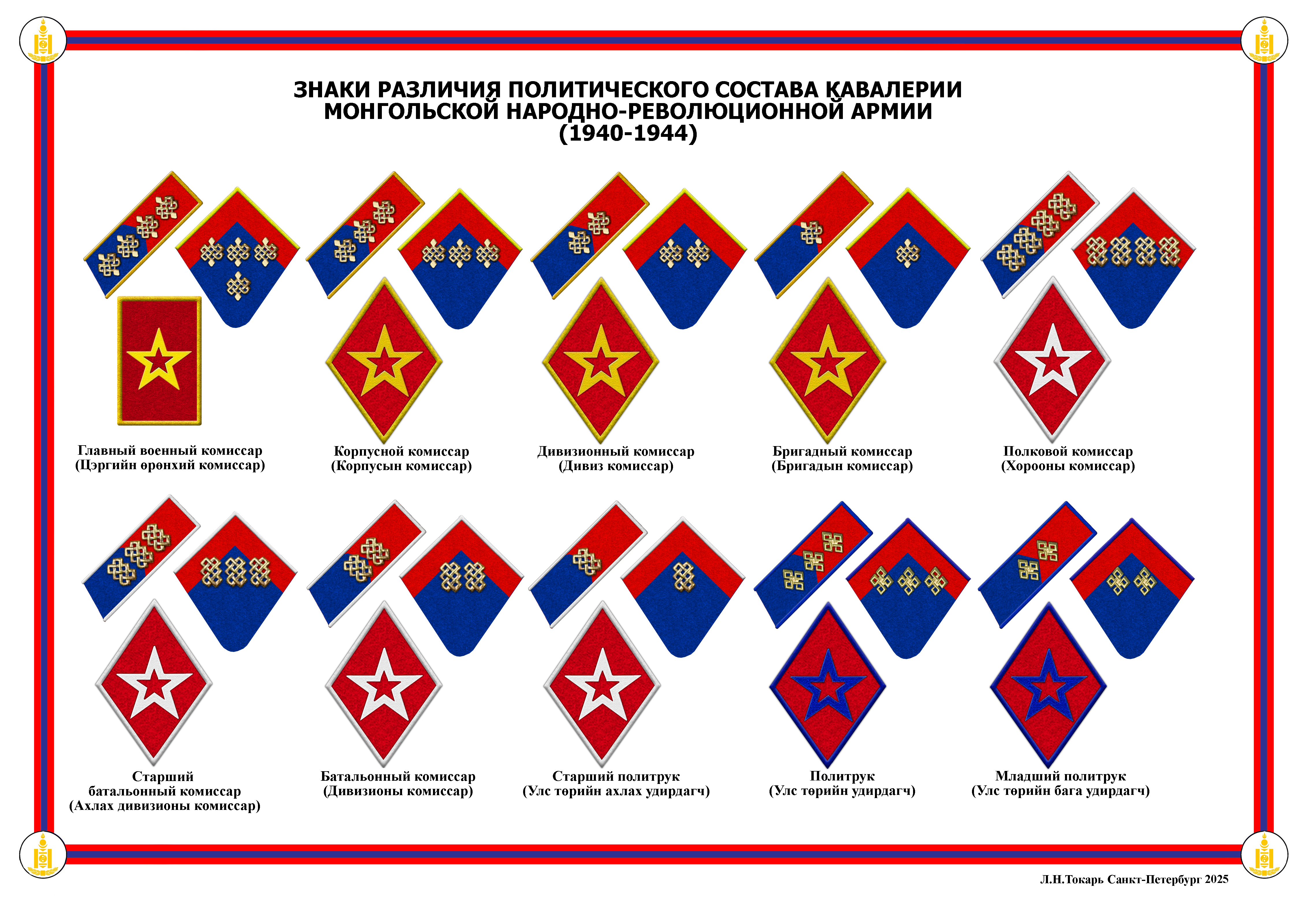 Благодаря Роберту Калюжному в моем распоряжении оказался некий монгольский документ, из которого видно, что звания "младший политрук" в 1936 году не устанавливалось. Исправления в плакат внесены. Кроме того уточнены некоторые наименования званий на монгольском языке.