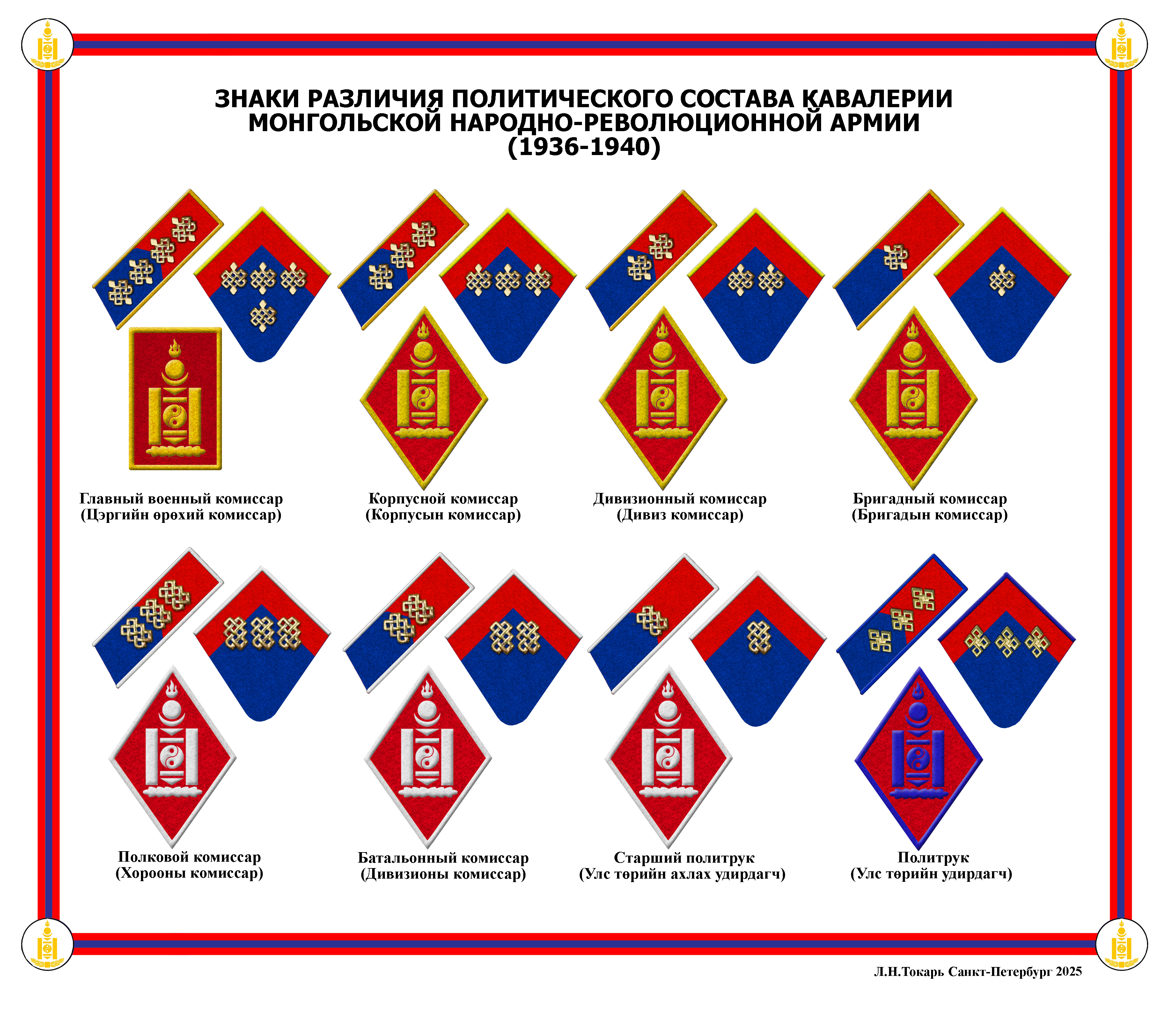 Отвечая на вопрос в одной из тем о прямоугольных нарукавных знаках, привожу реконструкцию, выполненную по документальным фотографиям. Имея в виду, что командирские звания МНРА соответствовали командирским званиям РККА, с большей долей вероятности предположил, что и звания политсостава совпадали. В связи с трудностями перевода дано только русское наименование званий. Если есть неточности, прошу поправить.